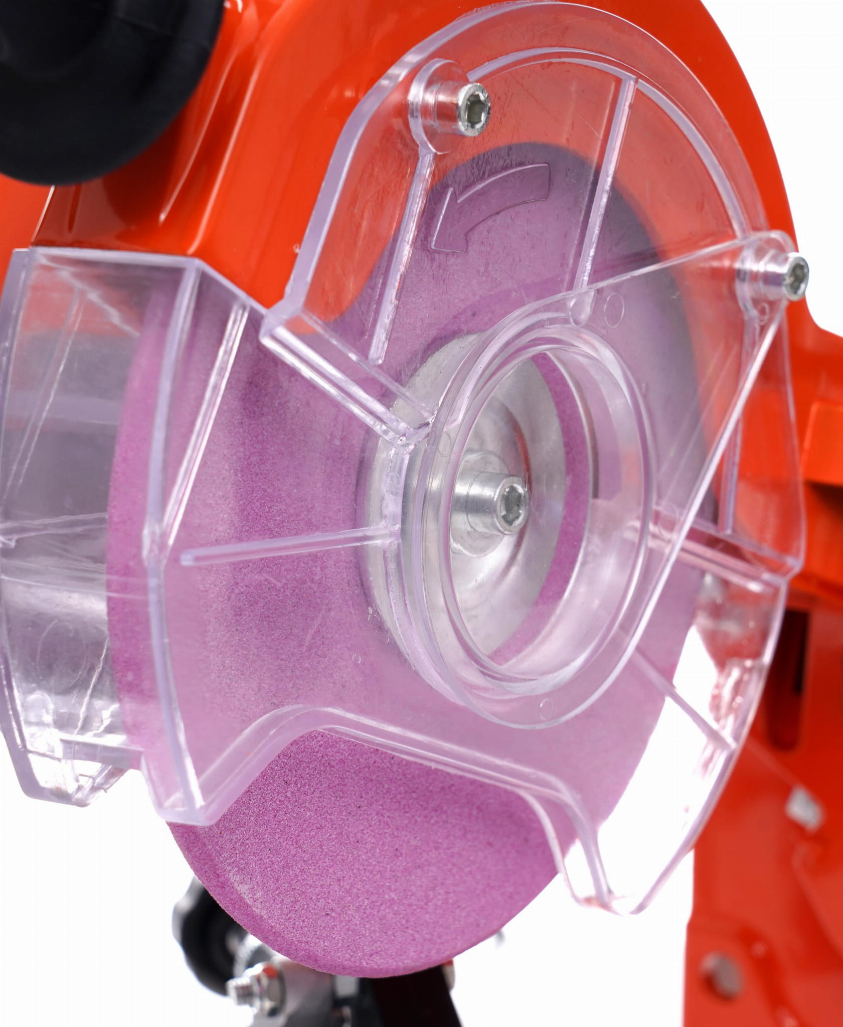 Mechaniczny ogranicznik zatrzymuje tarczę na ustawionej głębokości, co zapobiega nadmiernemu zebraniu materiału z ogniwa. Efektem jest równomierne ostrzenie wszystkich zębów bez ryzyka ich skrócenia poniżej normy.
