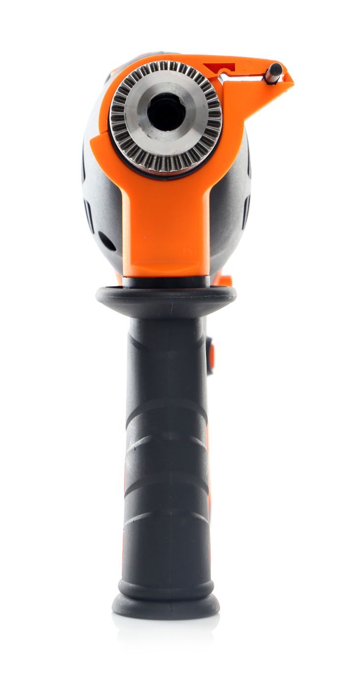 Wysoka moc silnika pozwala na efektywne wiercenie udarowe w betonie i murze. Tryb udarowy generuje dodatkowe uderzenia wzdłuż osi wiertła, co przyspiesza penetrację twardych materiałów budowlanych i zmniejsza wymagany nacisk podczas pracy.