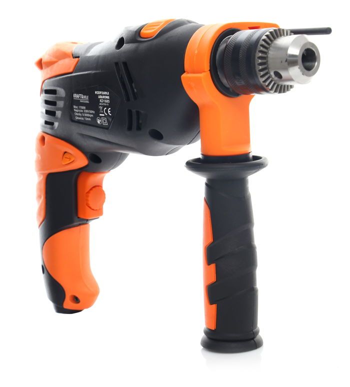 Wiertarka udarowa KD1685 to narzędzie elektryczne o mocy 1700W przeznaczone zarówno do wiercenia udarowego w twardych materiałach budowlanych — murze, betonie i kamieniu — jak i do standardowego wiercenia w drewnie, metalu, ceramice oraz tworzywie sztucznym. Urządzenie wyposażono w antypoślizgową rękojeść główną oraz dodatkowy uchwyt boczny zwiększający kontrolę podczas pracy.