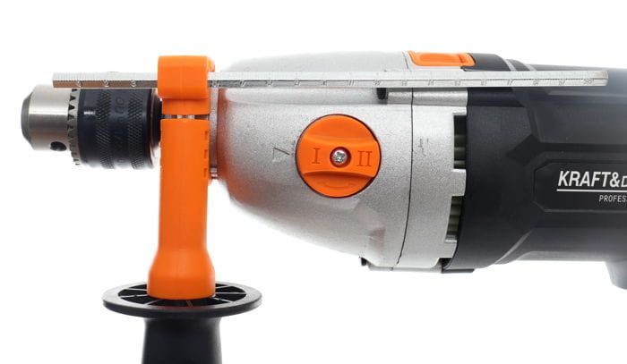 Główna rękojeść pokryta antypoślizgowym materiałem ogranicza ryzyko wyślizgnięcia się narzędzia podczas pracy. Dodatkowa boczna rękojeść umożliwia oburęczne prowadzenie wiertarki, co jest szczególnie istotne przy wierceniu udarowym w betonie.