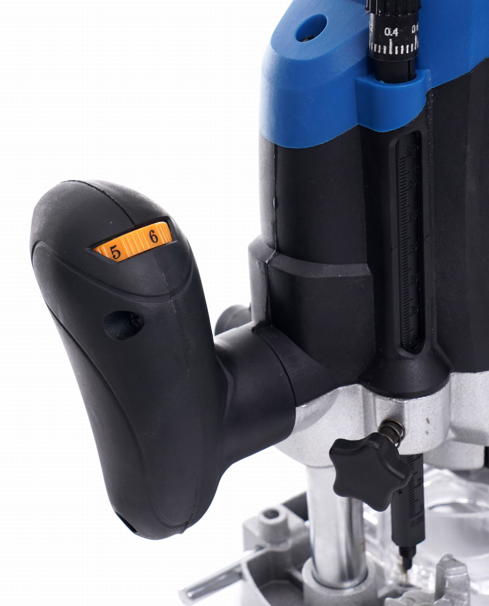 Przycisk blokady pozwala zablokować spust w pozycji włączonej, co odciąża dłoń podczas długotrwałej pracy. Rozwiązanie standardowe w frezarkach warsztatowych, istotne przy wykonywaniu dłuższych prowadzeń wzdłuż krawędzi lub szablonu.