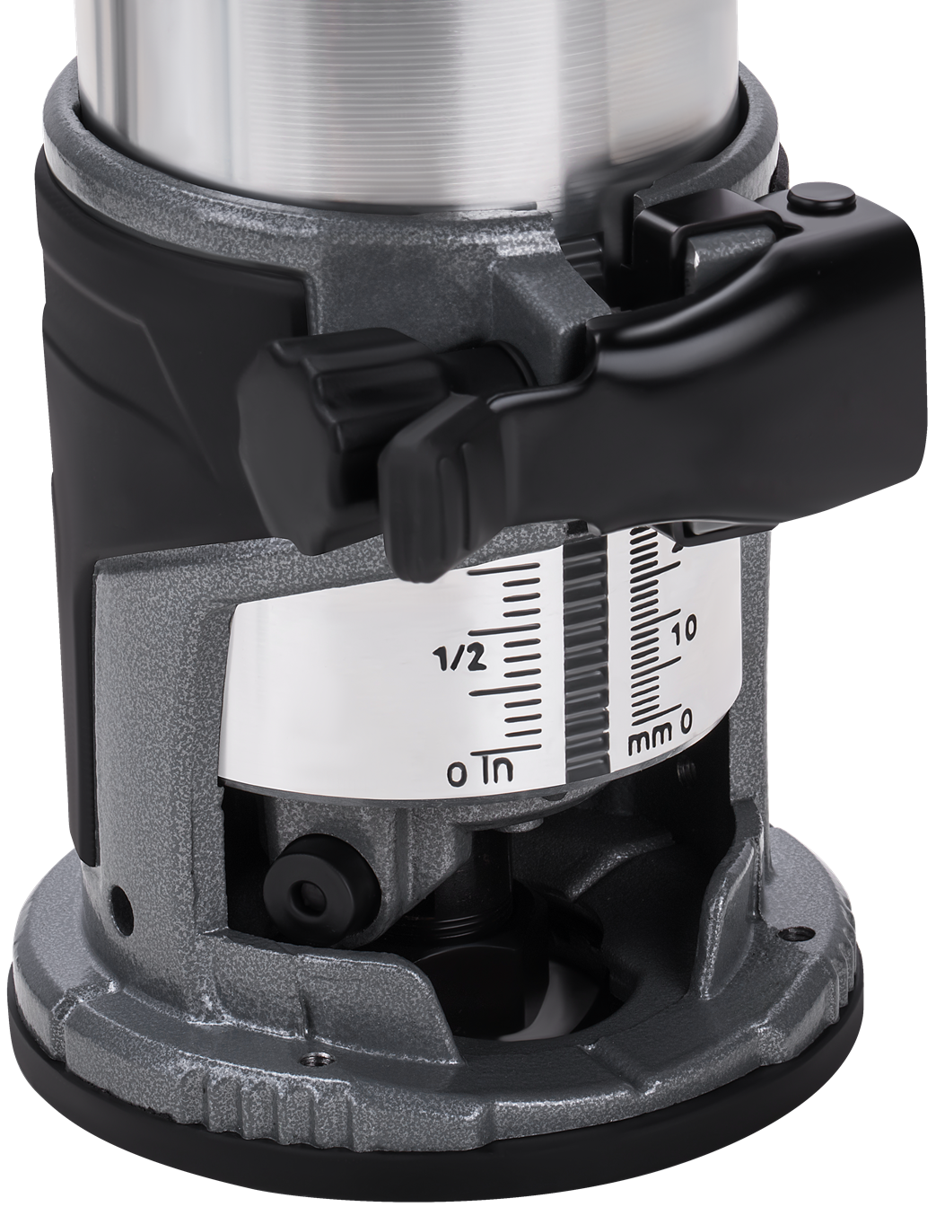 Mechaniczny ogranicznik pozwala na precyzyjne ustawienie głębokości frezowania przed rozpoczęciem pracy. Eliminuje konieczność wielokrotnego mierzenia i zmniejsza ryzyko zbyt głębokiego wejścia frezu w materiał.