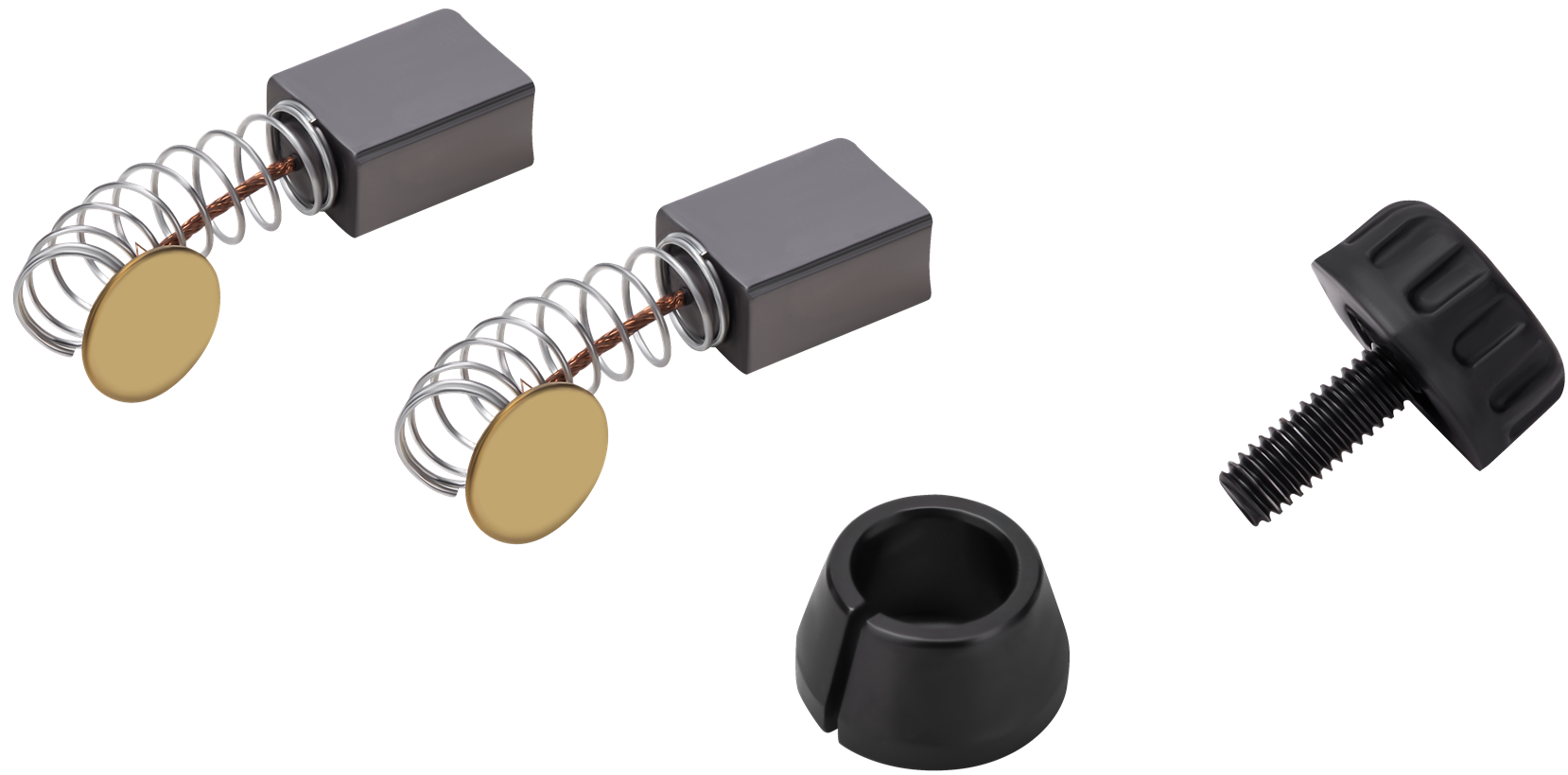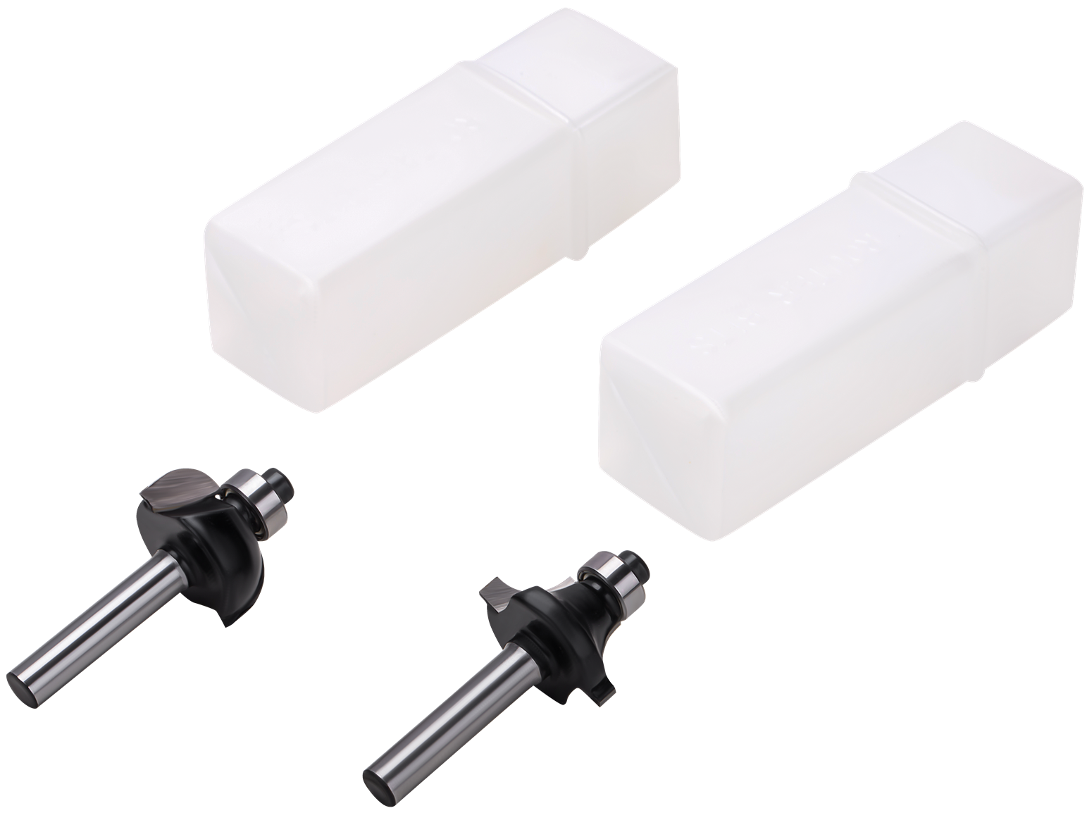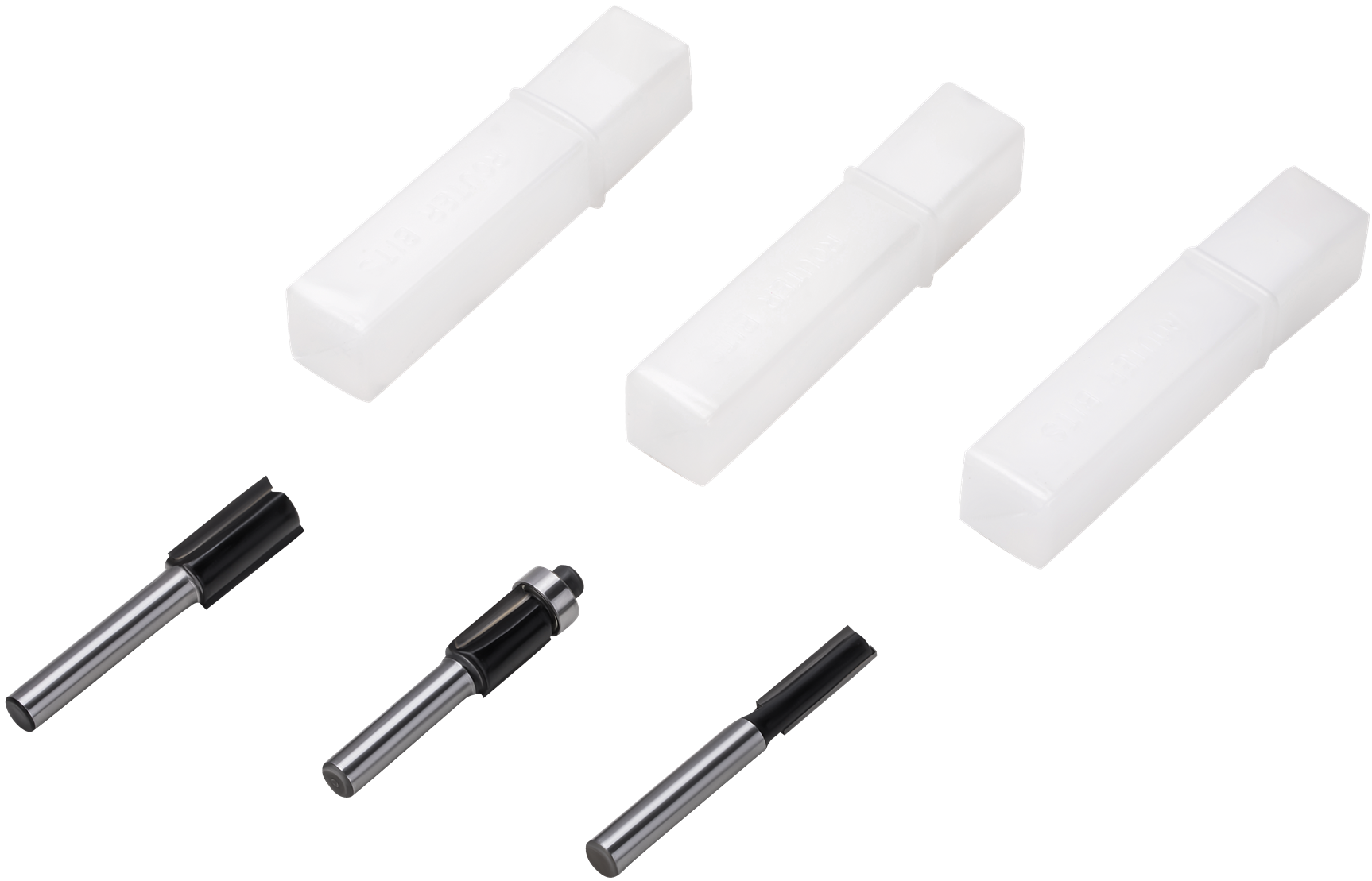 Urządzenie współpracuje z frezami o trzpieniu 6 mm i 8 mm — są to dwa najpowszechniejsze standardy w narzędziach ręcznych. Przed zakupem frezów należy sprawdzić średnicę trzpienia podaną przez producenta oprzyrządowania. W zestawie znajdują się obie tulejki zaciskowe.