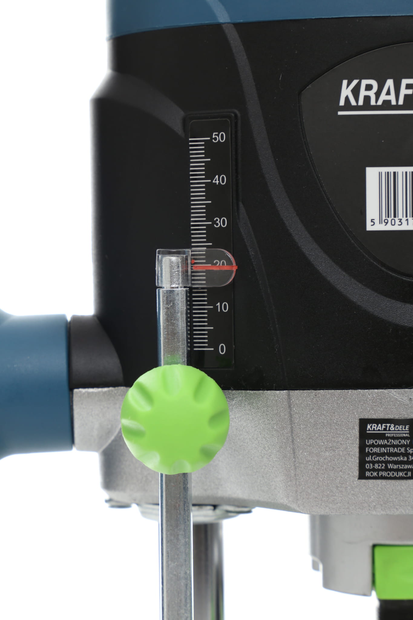 Mechaniczny ogranicznik umożliwia powtarzalne ustawienie głębokości frezu do 52 mm. Eliminuje konieczność każdorazowego mierzenia i zwiększa precyzję przy seryjnym frezowaniu.