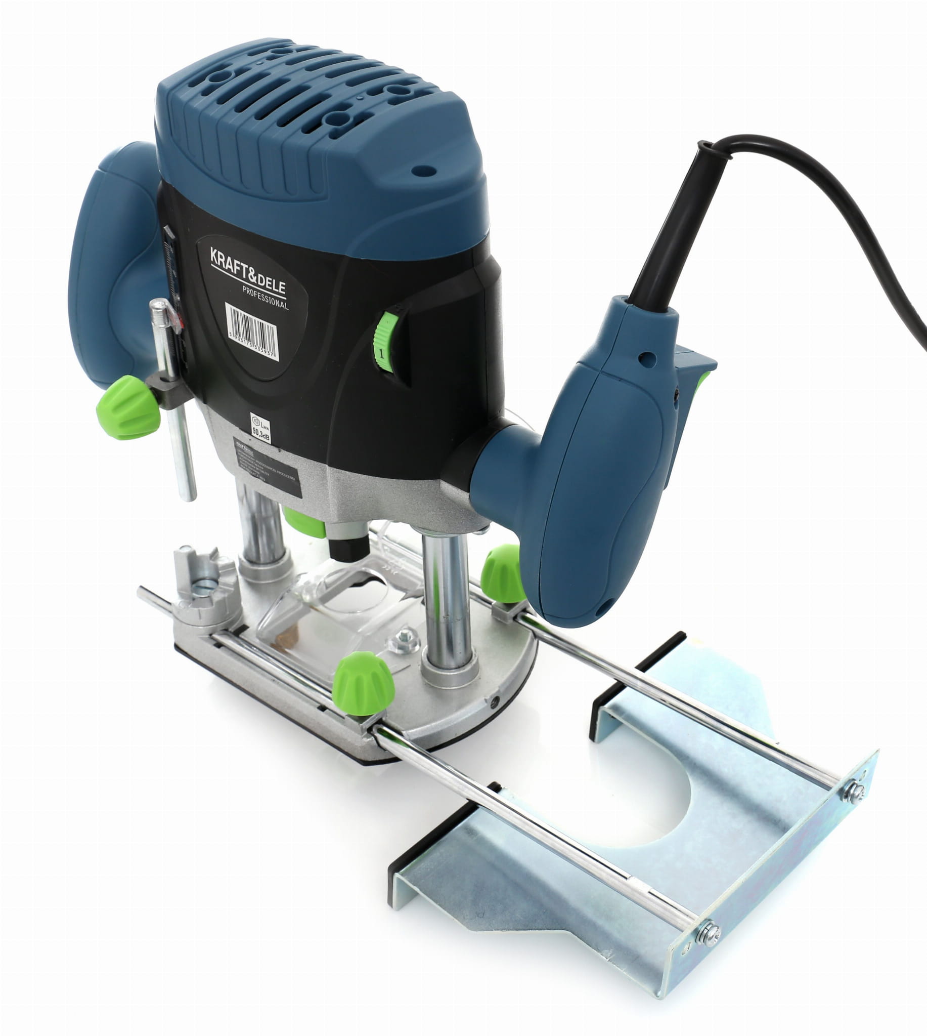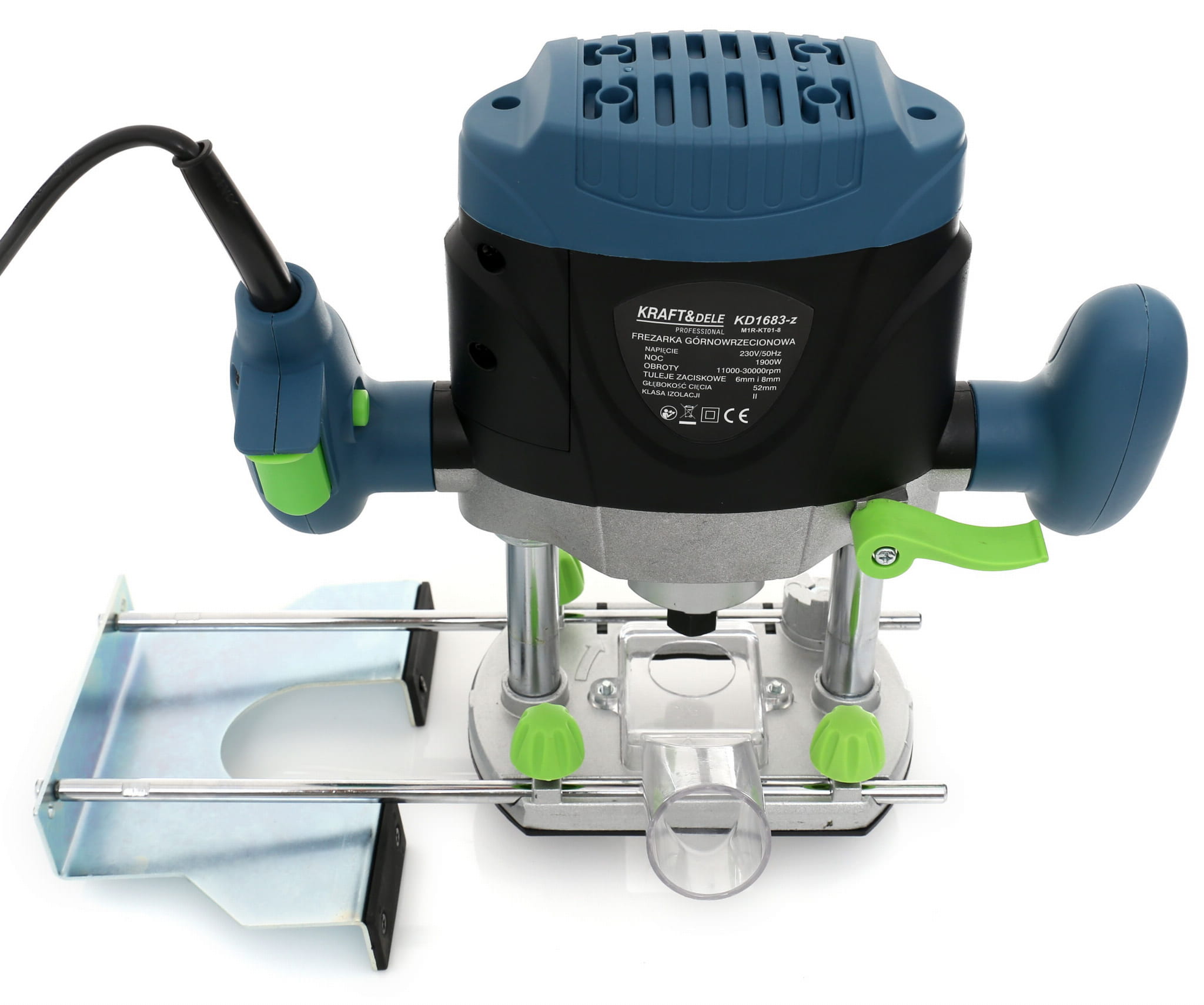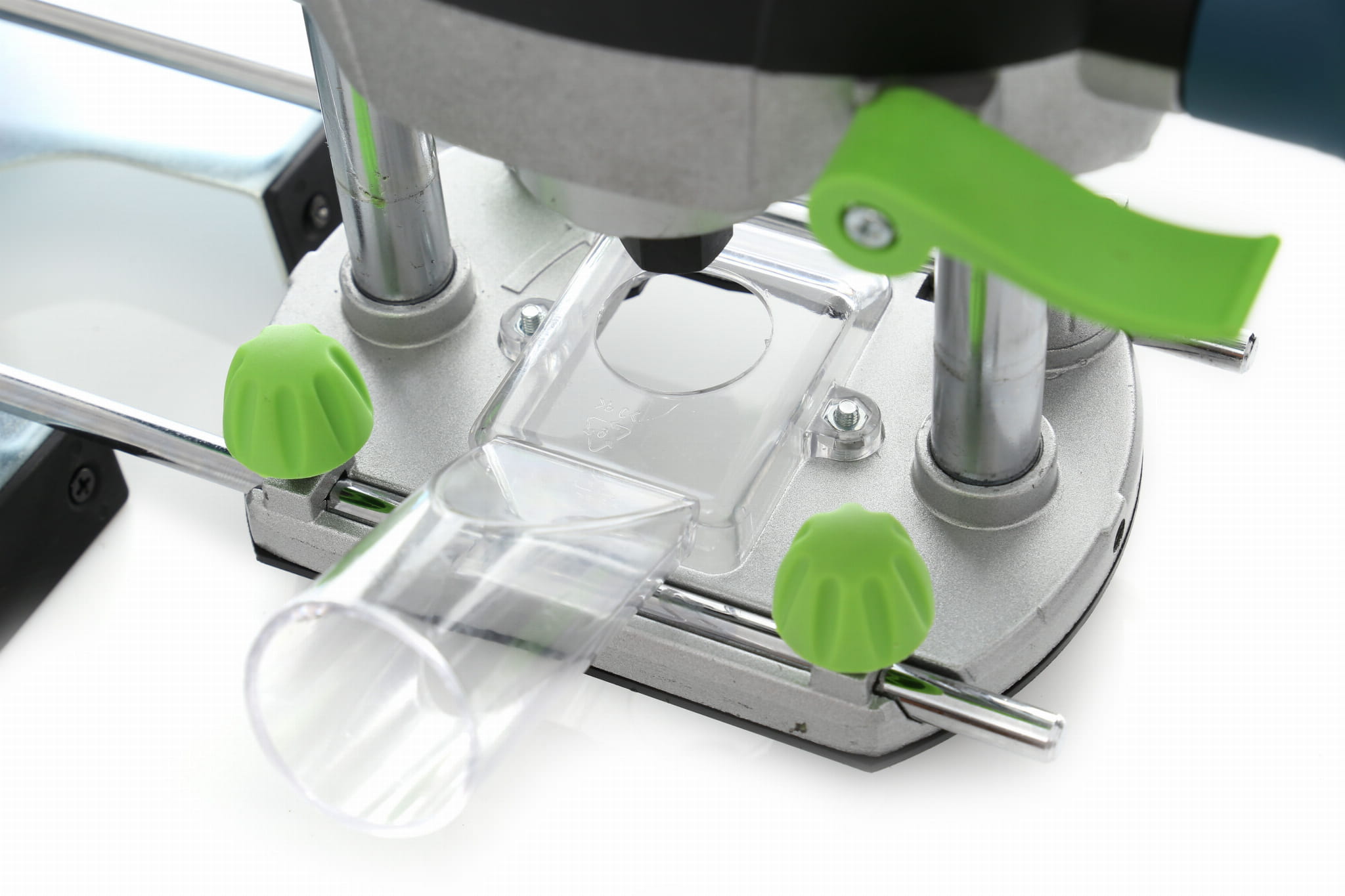 Gniazdo wylotu pyłu umożliwia podłączenie odkurzacza warsztatowego, co ogranicza zapylenie stanowiska pracy. W komplecie znajduje się prowadnica równoległa oraz prowadnica szablonowa, rozszerzające możliwości prowadzenia narzędzia.