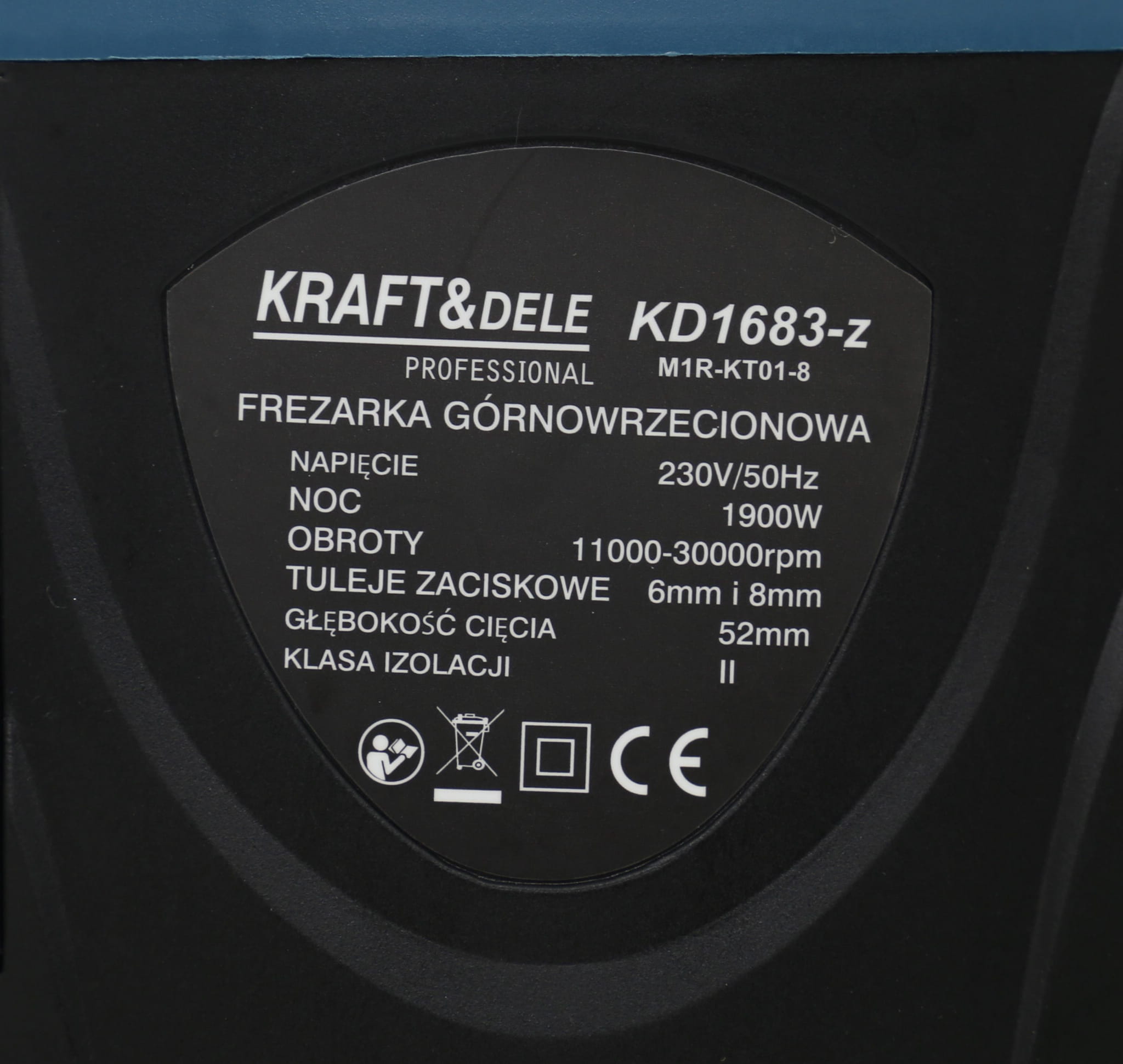 Ręczna frezarka górnowrzecionowa z silnikiem o mocy 1900 W, przeznaczona do obróbki drewna i materiałów drewnopochodnych. Umożliwia frezowanie rowków, profili i krawędzi z regulowaną głębokością do 52 mm oraz płynną kontrolą prędkości obrotowej w zakresie 11 000–30 000 rpm.
