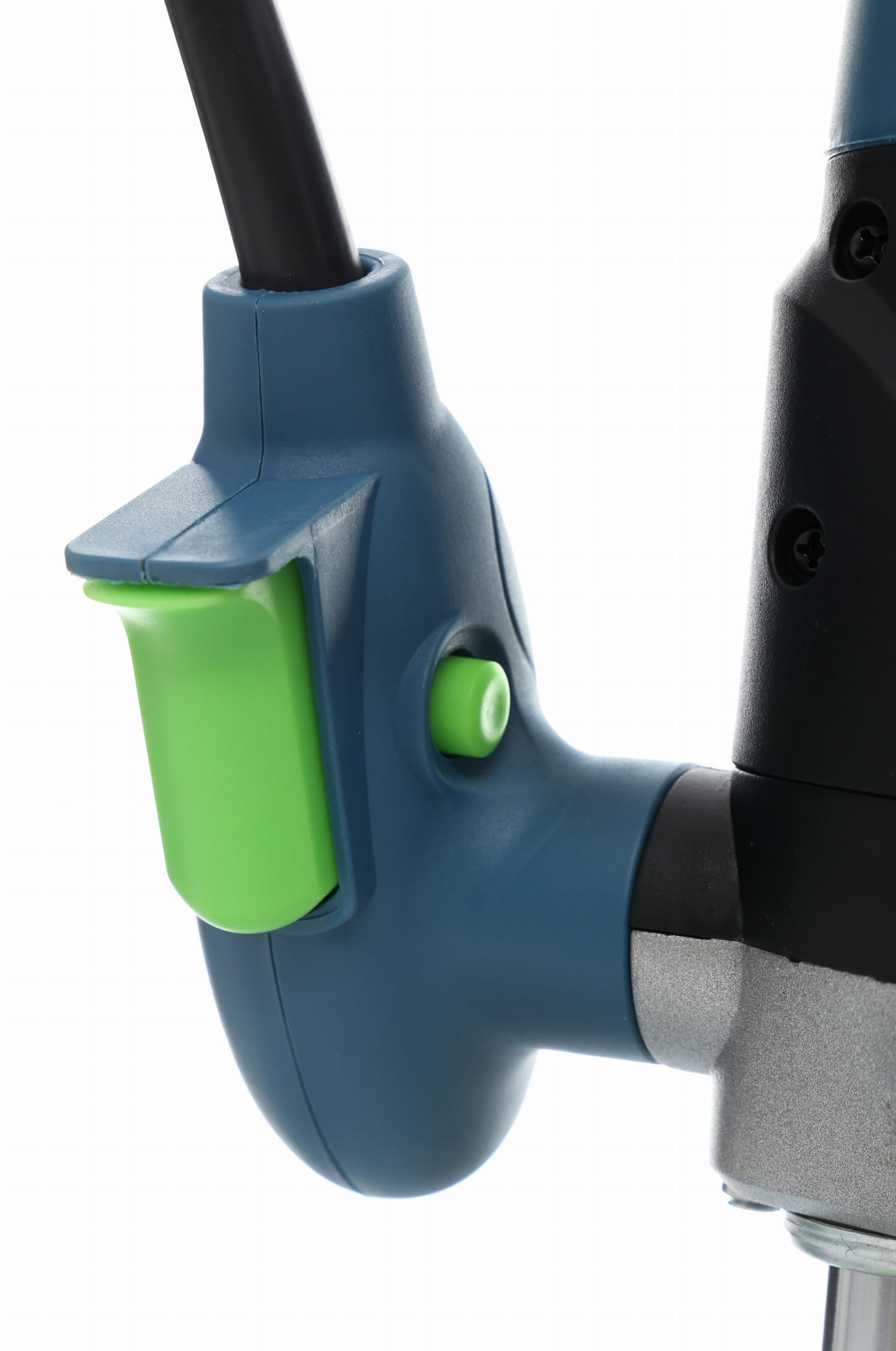 Dodatkowy przycisk blokady pozwala utrzymać ciągłą pracę urządzenia bez konieczności trzymania wciśniętego spustu. Przydatne przy długich prowadzeniach i pracy wymagającej obu rąk do stabilizacji narzędzia.