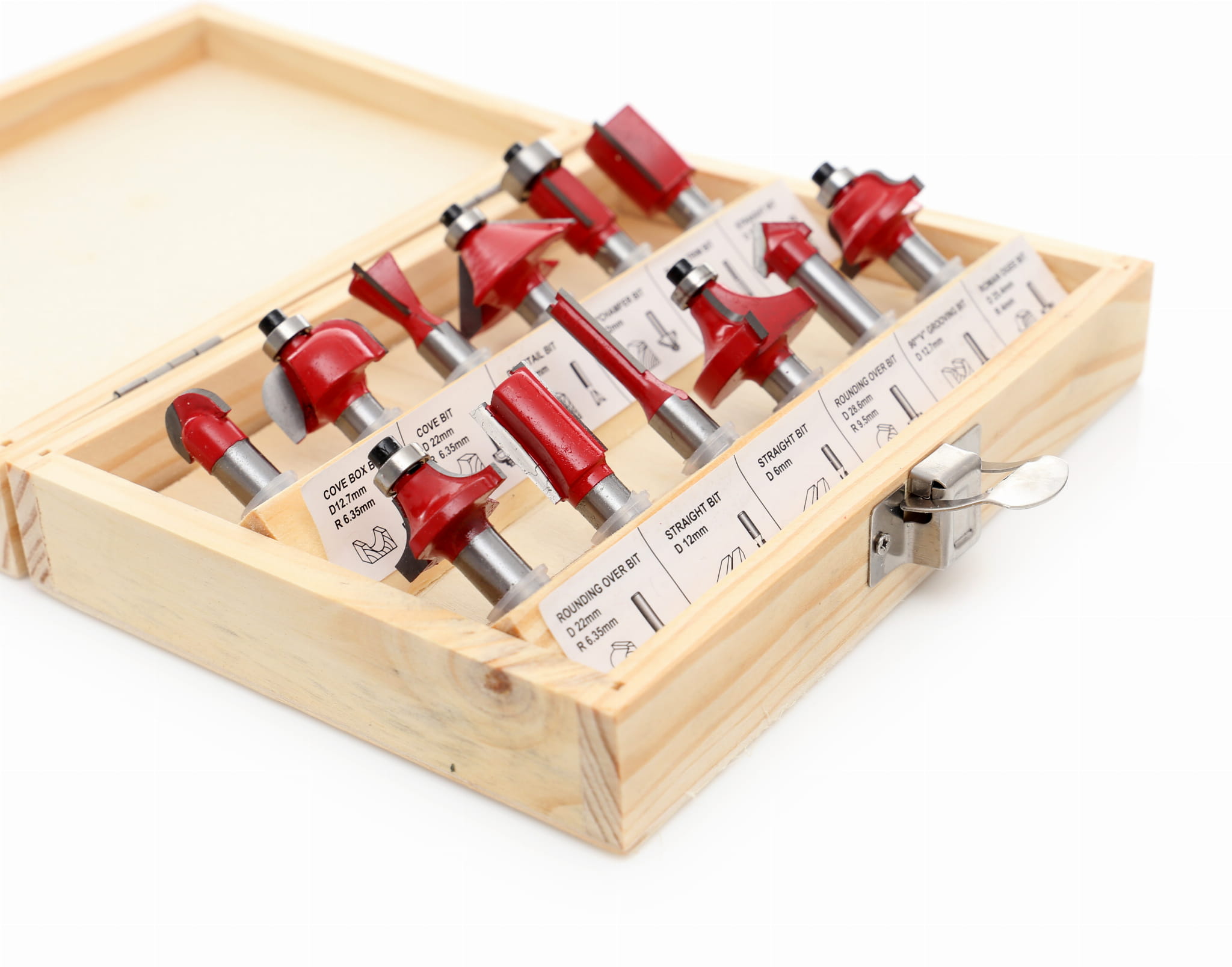 KD10282 to zestaw dwunastu frezów przeznaczonych do frezarek górnowrzecionowych z uchwytem 8 mm. Komplet obejmuje sześć frezów łożyskowanych i sześć bez łożysk, wykonanych z węglików spiekanych TCT, co pozwala na obróbkę drewna twardego i miękkiego, płyt wiórowych oraz sklejek. Zestaw przechowywany jest w drewnianym pudełku zapewniającym ochronę podczas składowania i transportu.