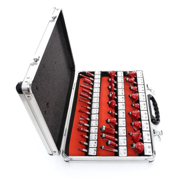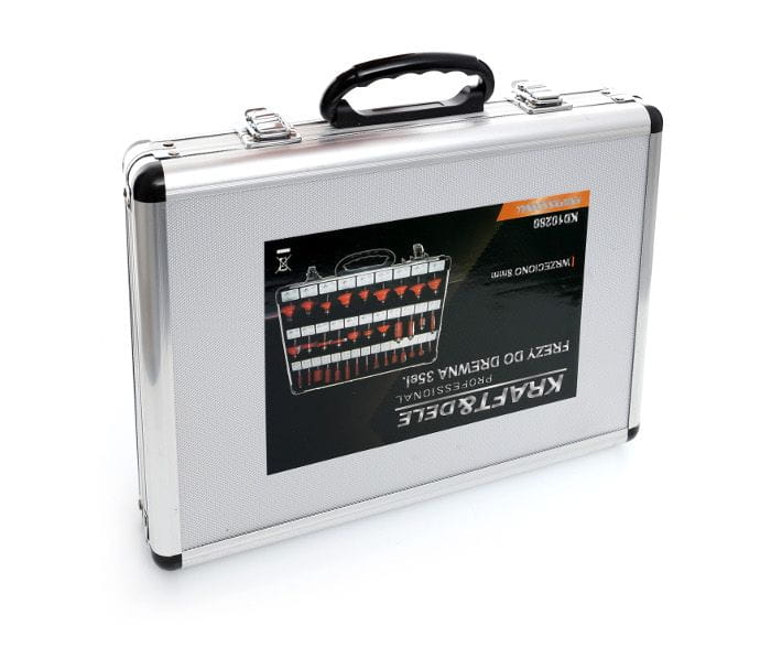 Każdy frez ma przypisane, opisane miejsce w walizce. Ułatwia to szybki dobór narzędzia i zapobiega uszkodzeniom ostrzy podczas przechowywania i transportu. Walizka waży łącznie 2,2 kg wraz z kompletem frezów.