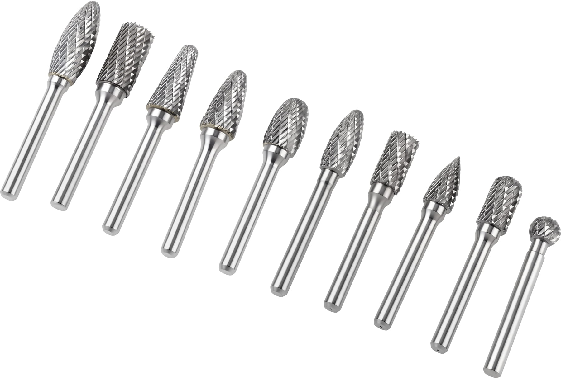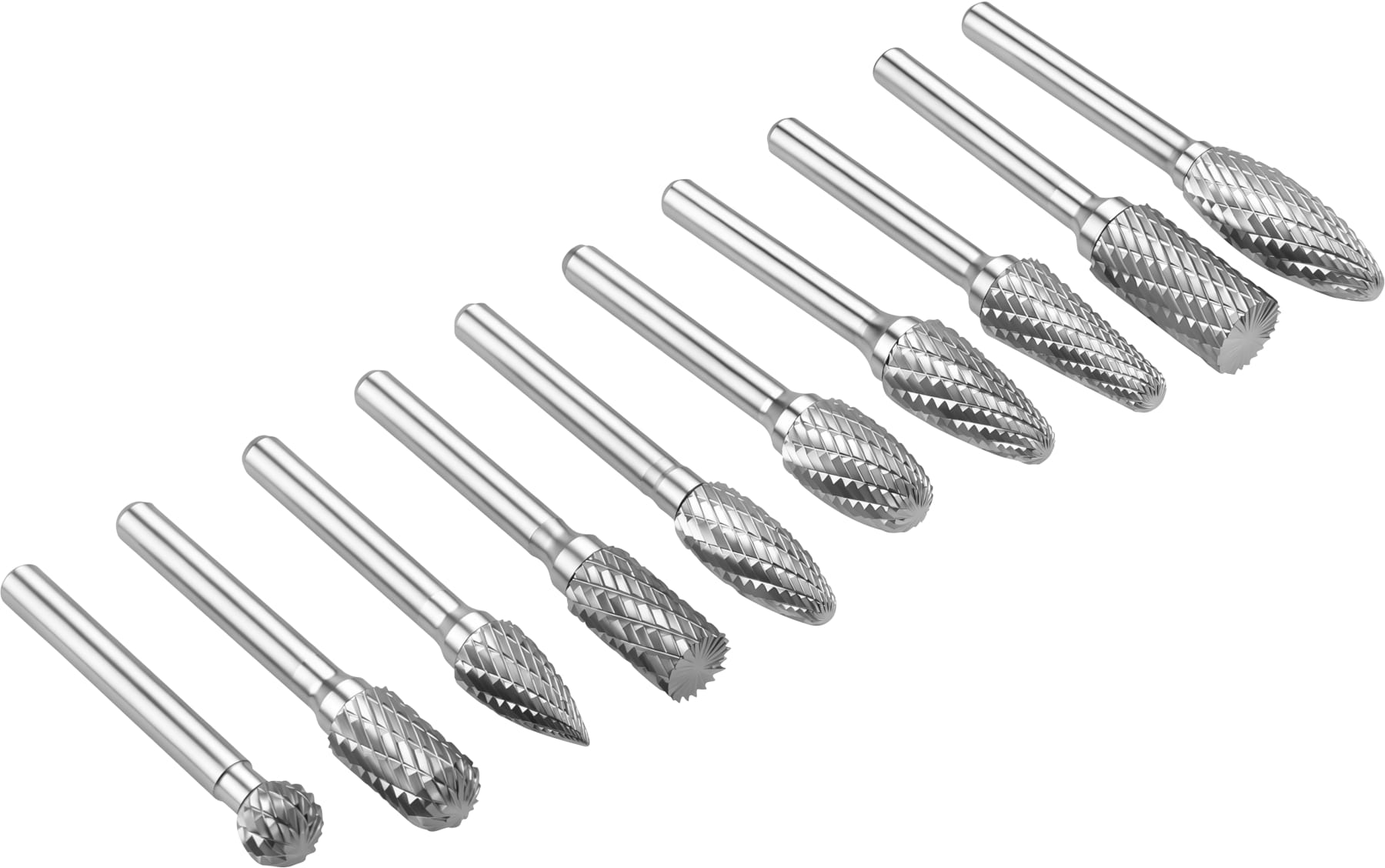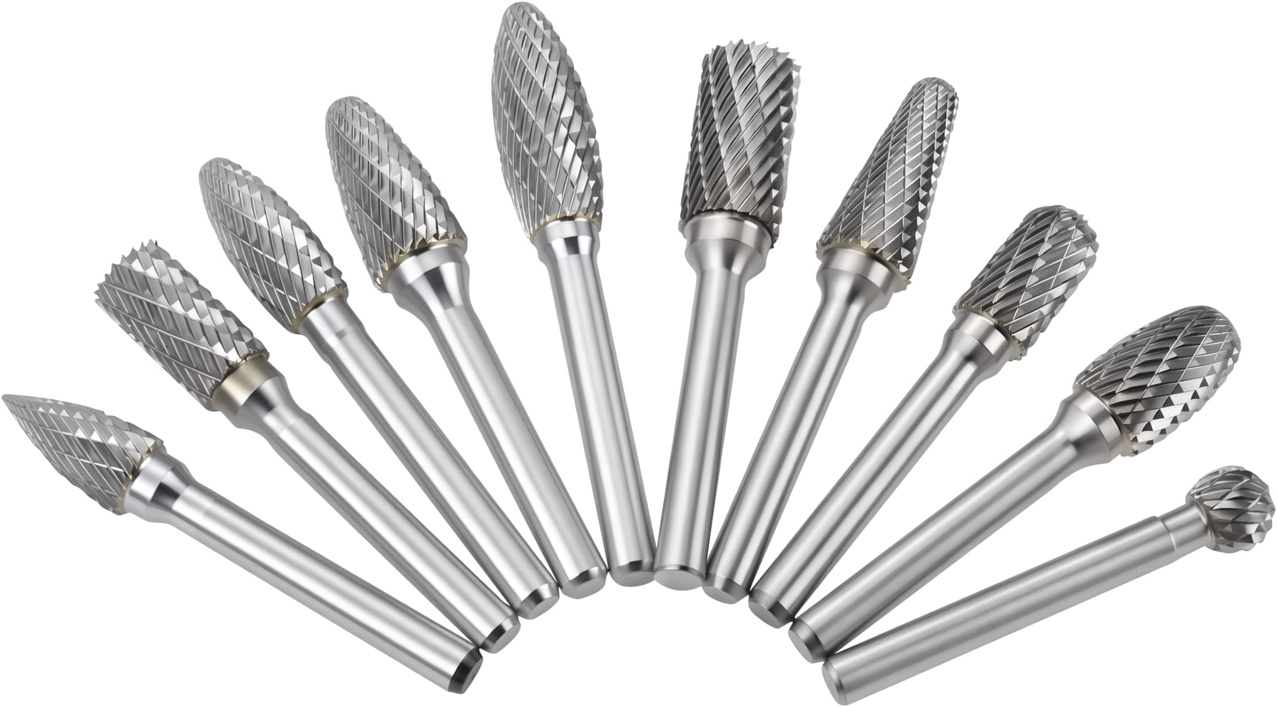 Zestaw zawiera frezy o zróżnicowanej geometrii: walcowe, kuliste, stożkowe, łukowe i inne — każdy kształt przeznaczony do innego rodzaju obróbki. Dzięki temu możliwa jest praca zarówno w miejscach łatwo dostępnych, jak i w zagłębieniach, narożnikach czy przy profilowanych krawędziach.