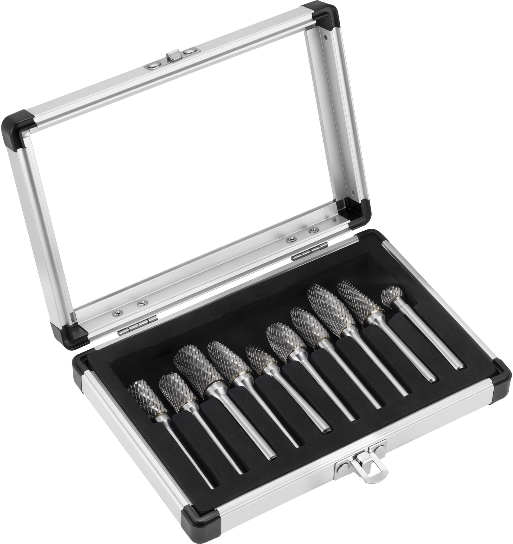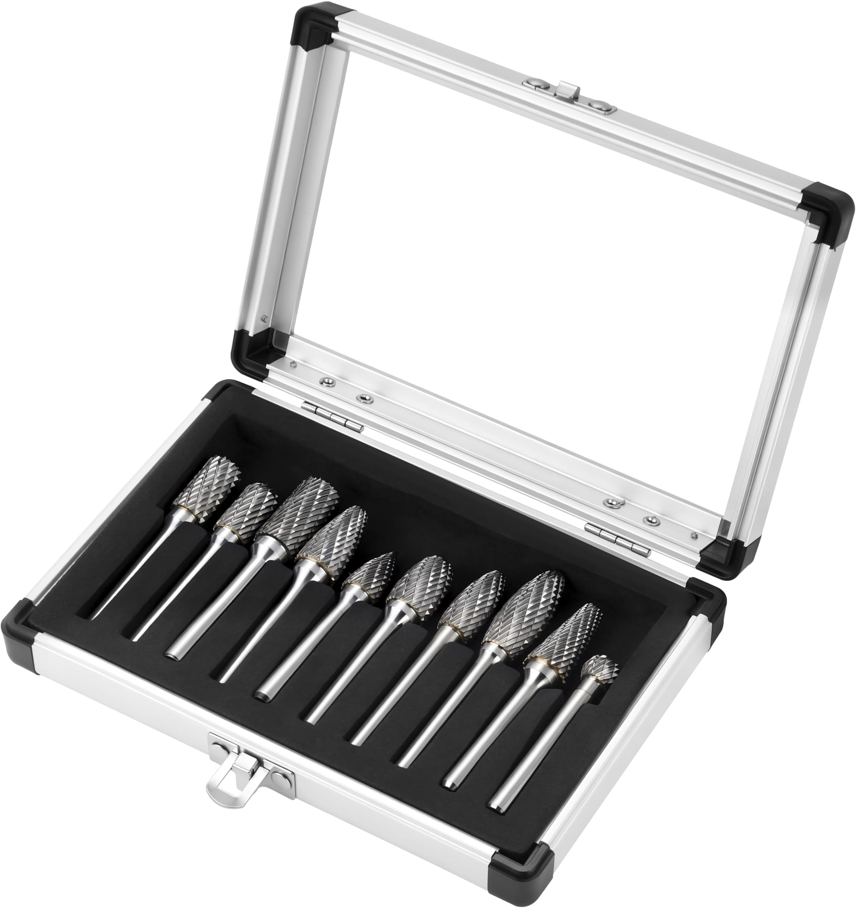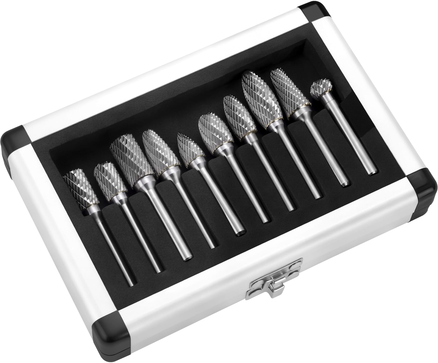 Zestaw zawiera frezy o zróżnicowanej geometrii: walcowe, kuliste, stożkowe, łukowe i inne — każdy kształt przeznaczony do innego rodzaju obróbki. Dzięki temu możliwa jest praca zarówno w miejscach łatwo dostępnych, jak i w zagłębieniach, narożnikach czy przy profilowanych krawędziach.