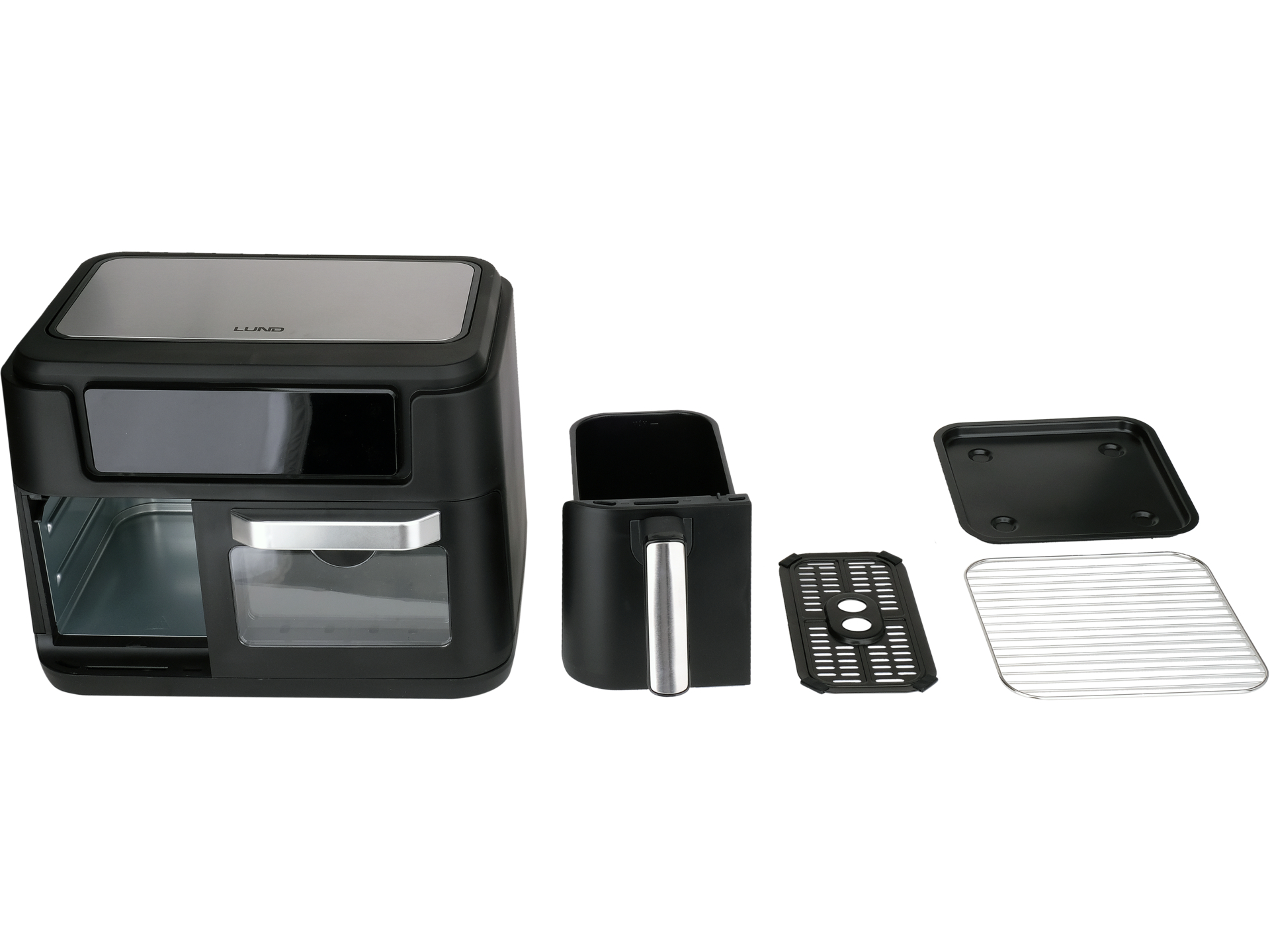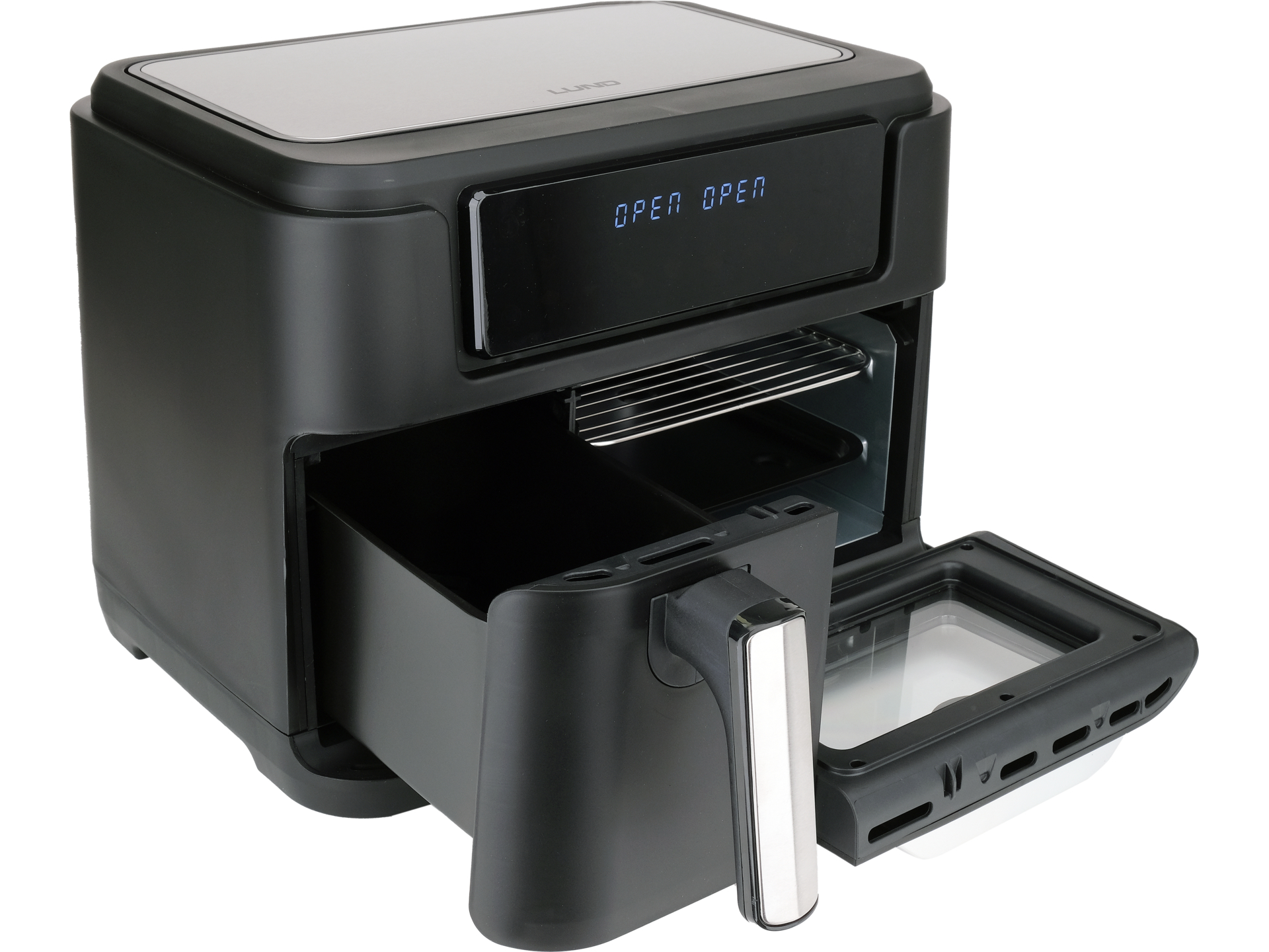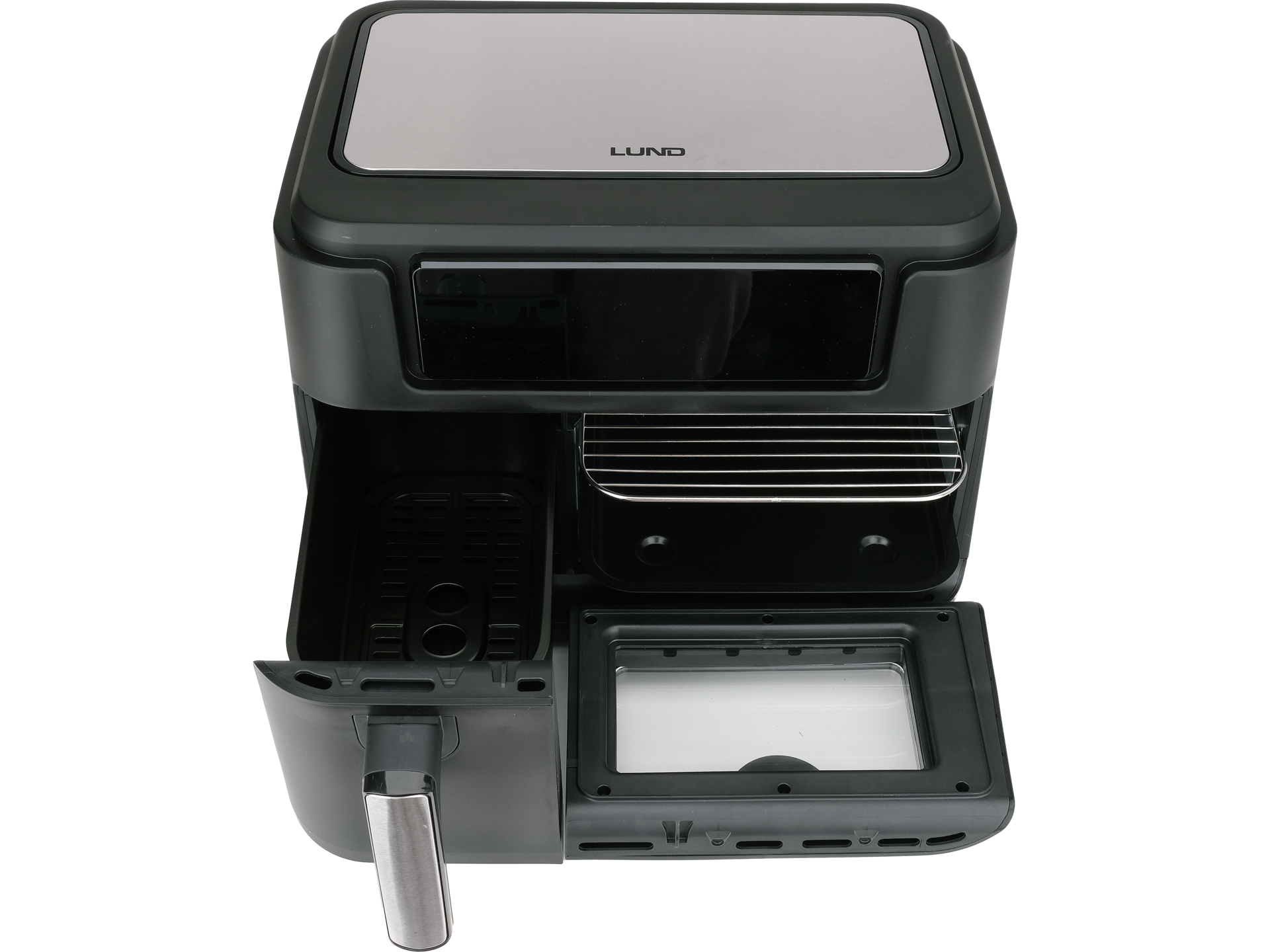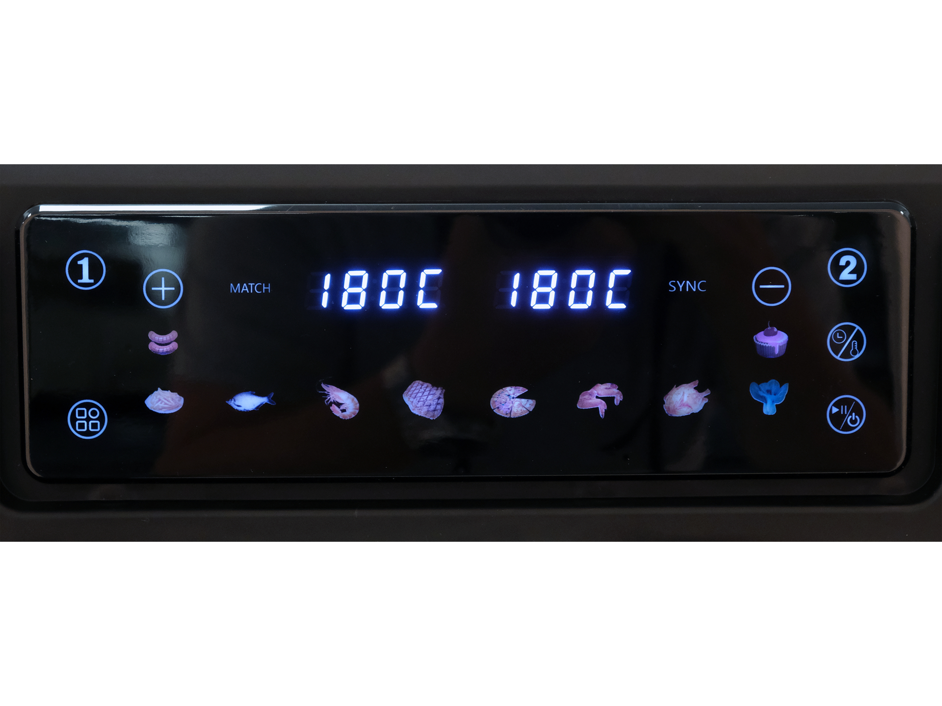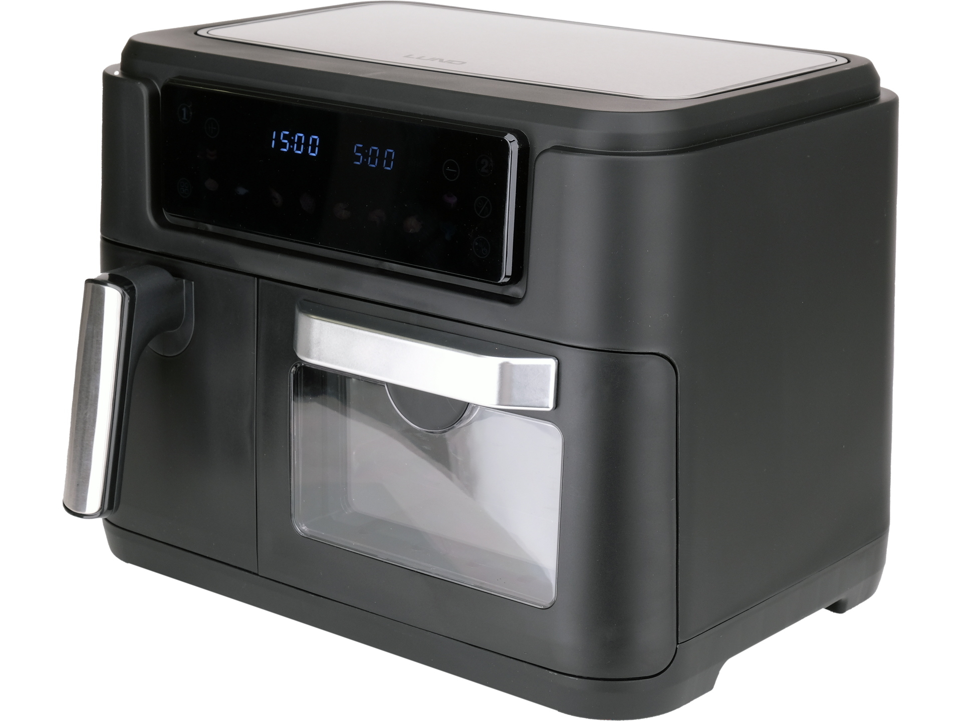 Wielofunkcyjne urządzenie kuchenne z dwoma niezależnymi komorami roboczymi, wykorzystujące technologię cyrkulacji gorącego powietrza do przygotowywania potraw z minimalnym użyciem tłuszczu. Dedykowane dla gospodarstw domowych wymagających jednoczesnego przygotowania różnych potraw.
