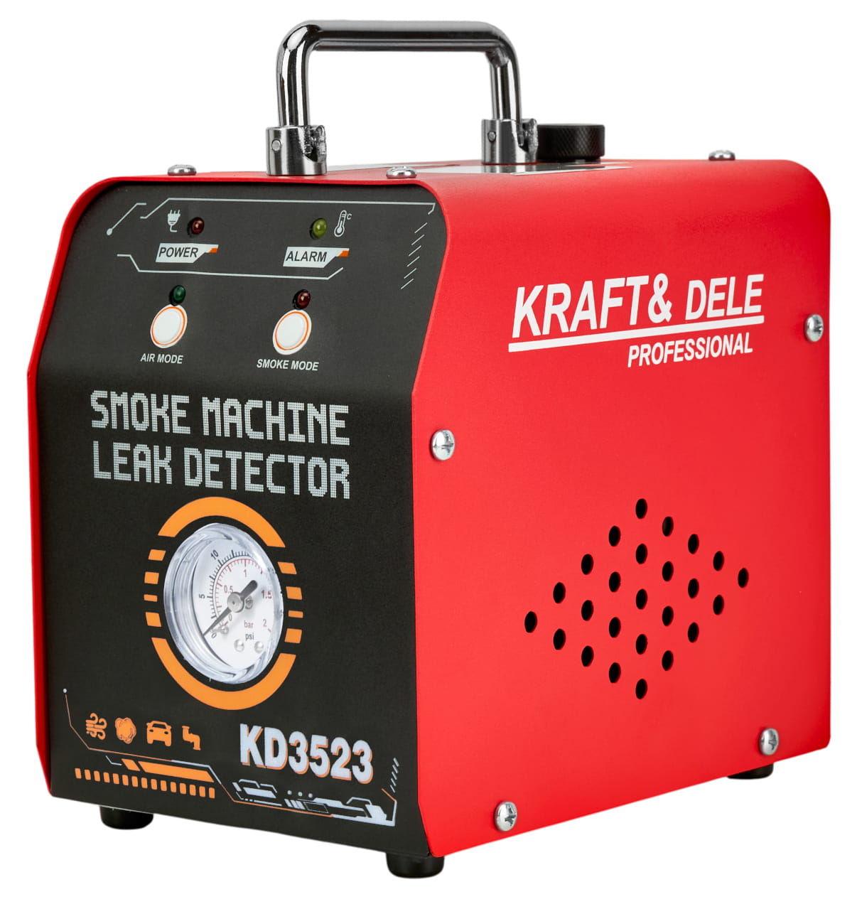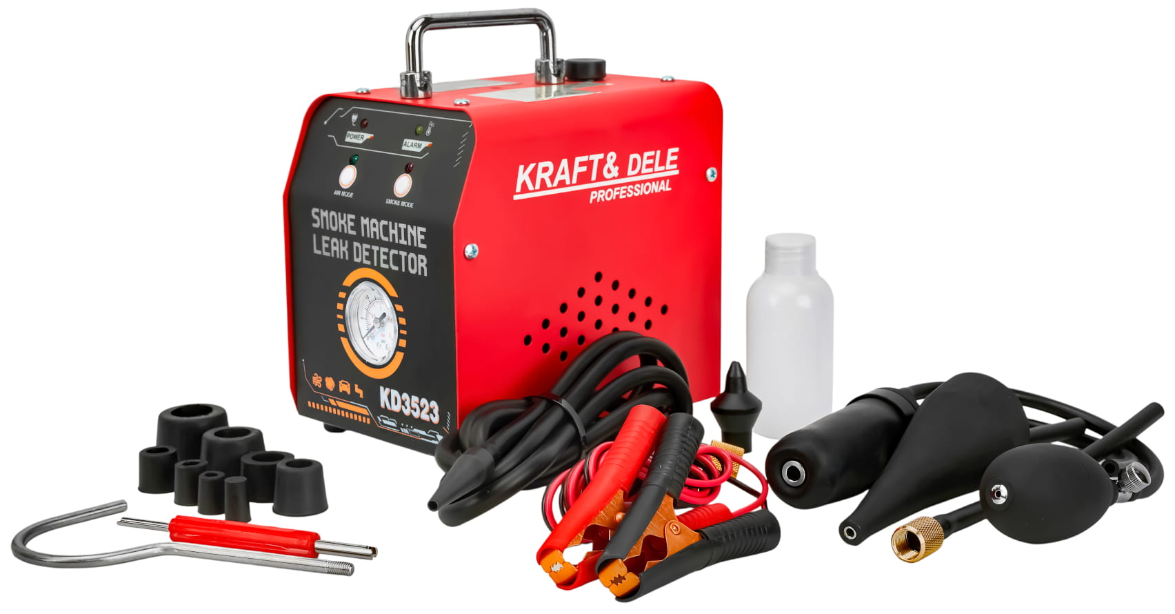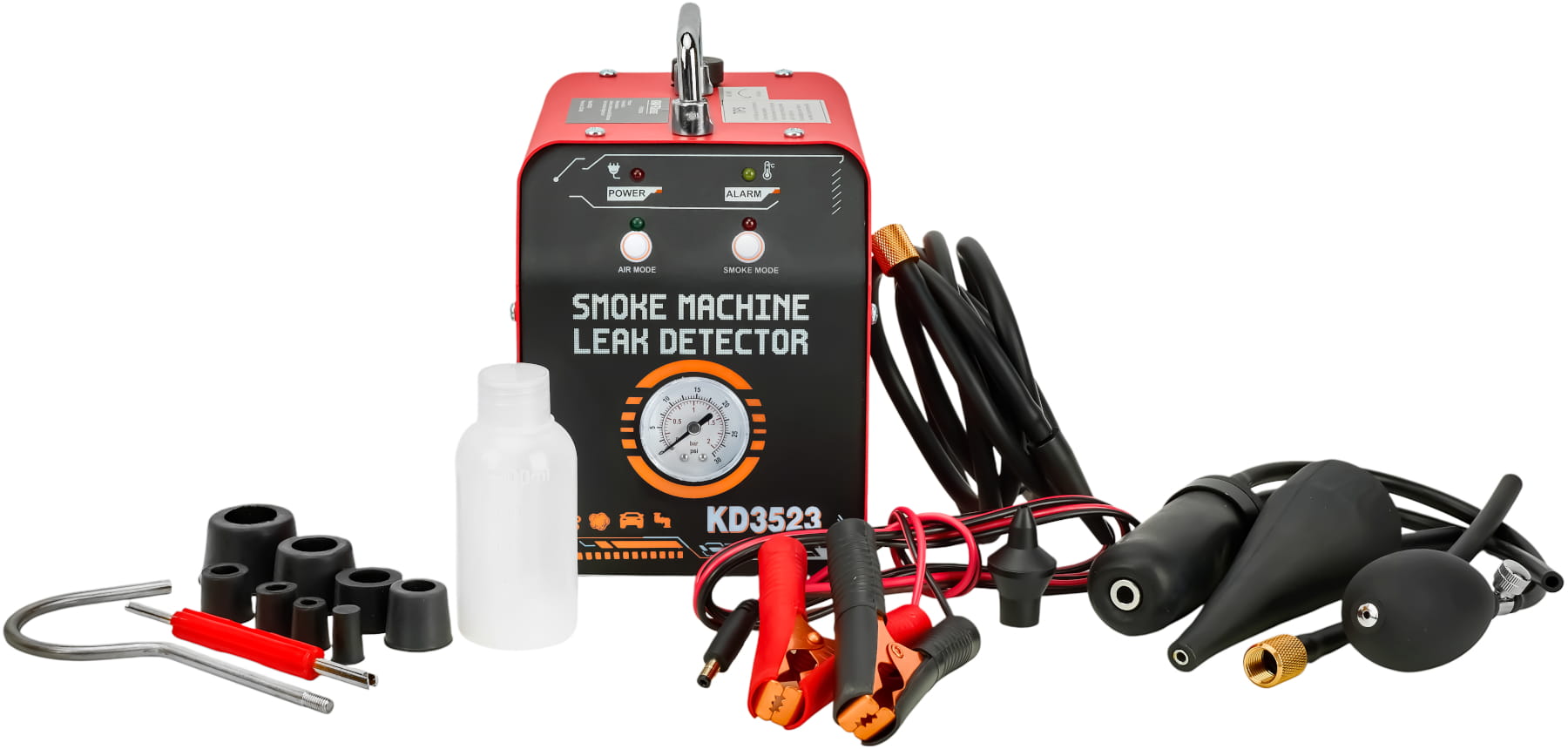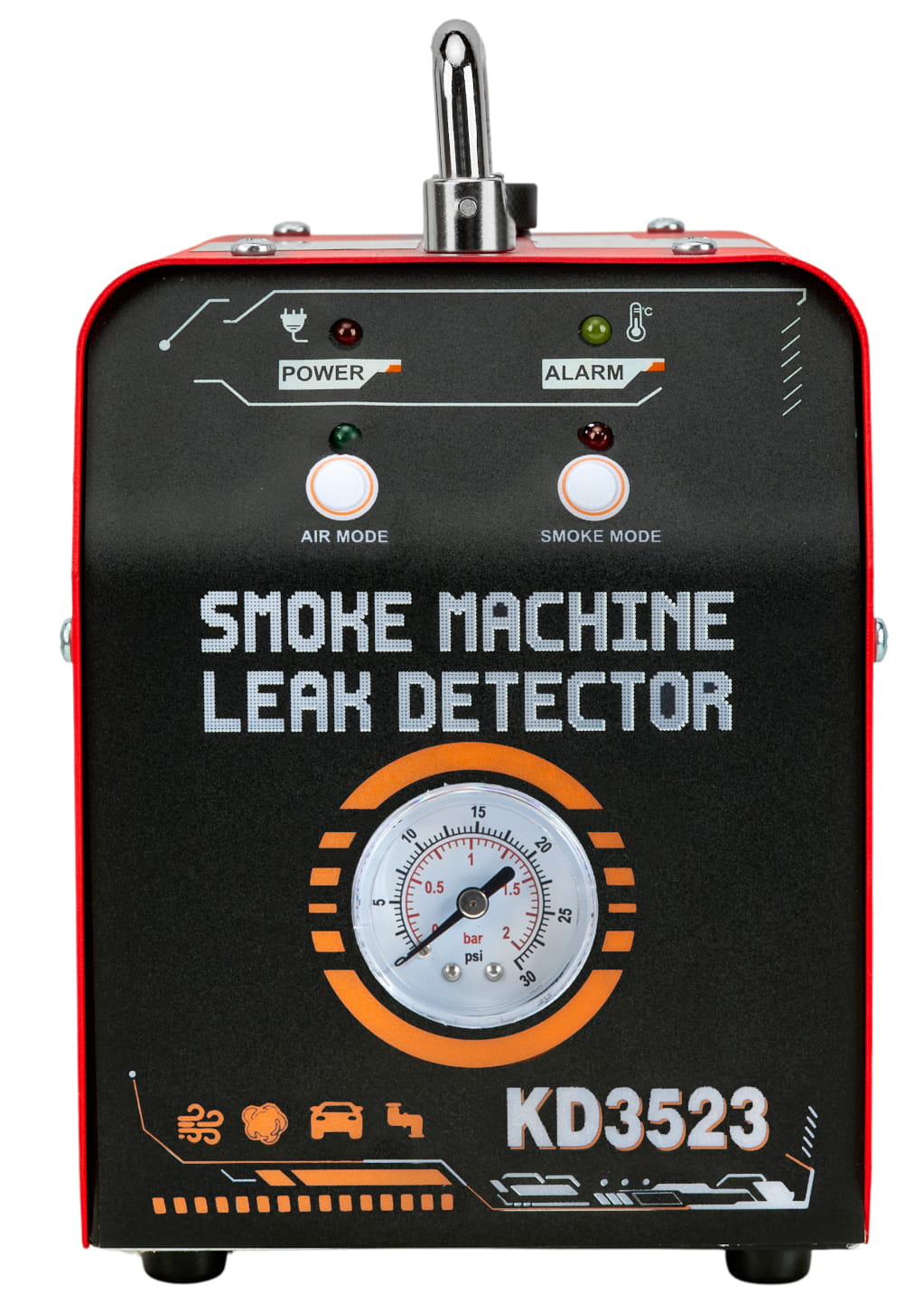 KD3523 to urządzenie diagnostyczne służące do lokalizowania nieszczelności w układach rurowych pojazdów. Metoda dymna polega na wtłaczaniu zadymionego powietrza do badanego układu — dym wydostający się w miejscu nieszczelności precyzyjnie wskazuje lokalizację wycieku bez konieczności demontażu podzespołów. Urządzenie zasilane jest bezpośrednio z instalacji pojazdu (12V DC), co eliminuje potrzebę podłączania zewnętrznego kompresora lub innego źródła zasilania.