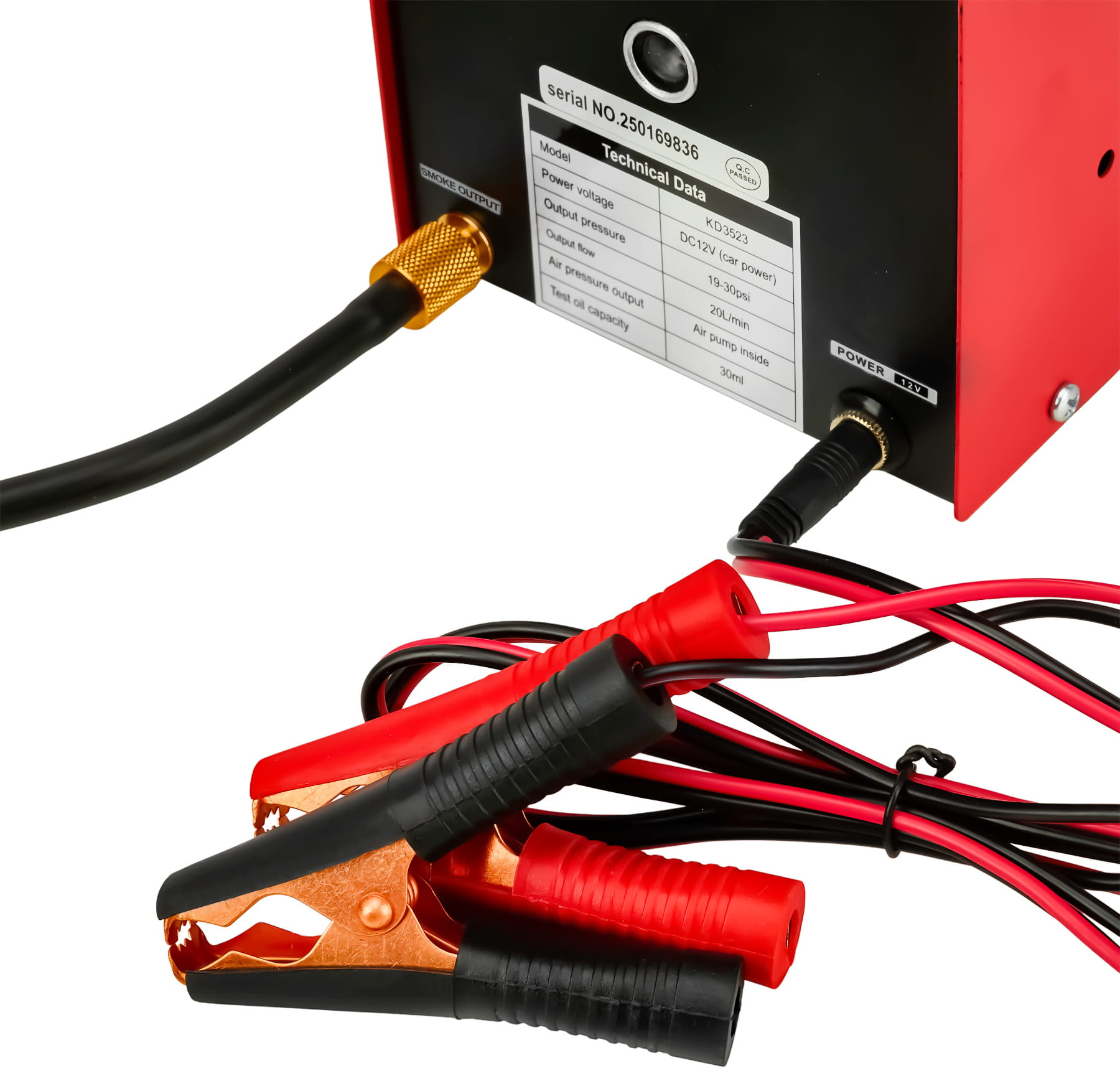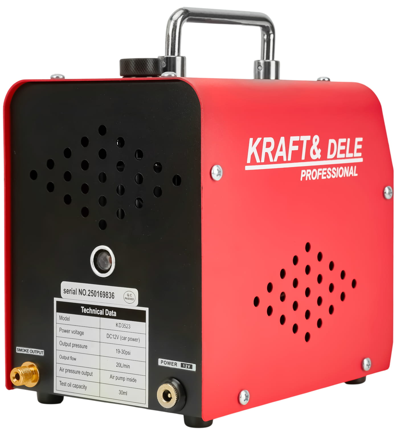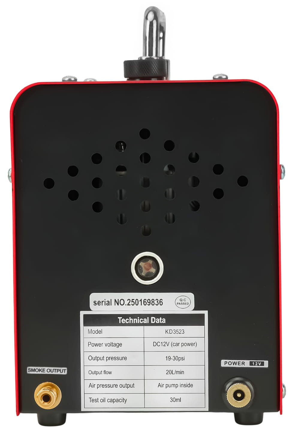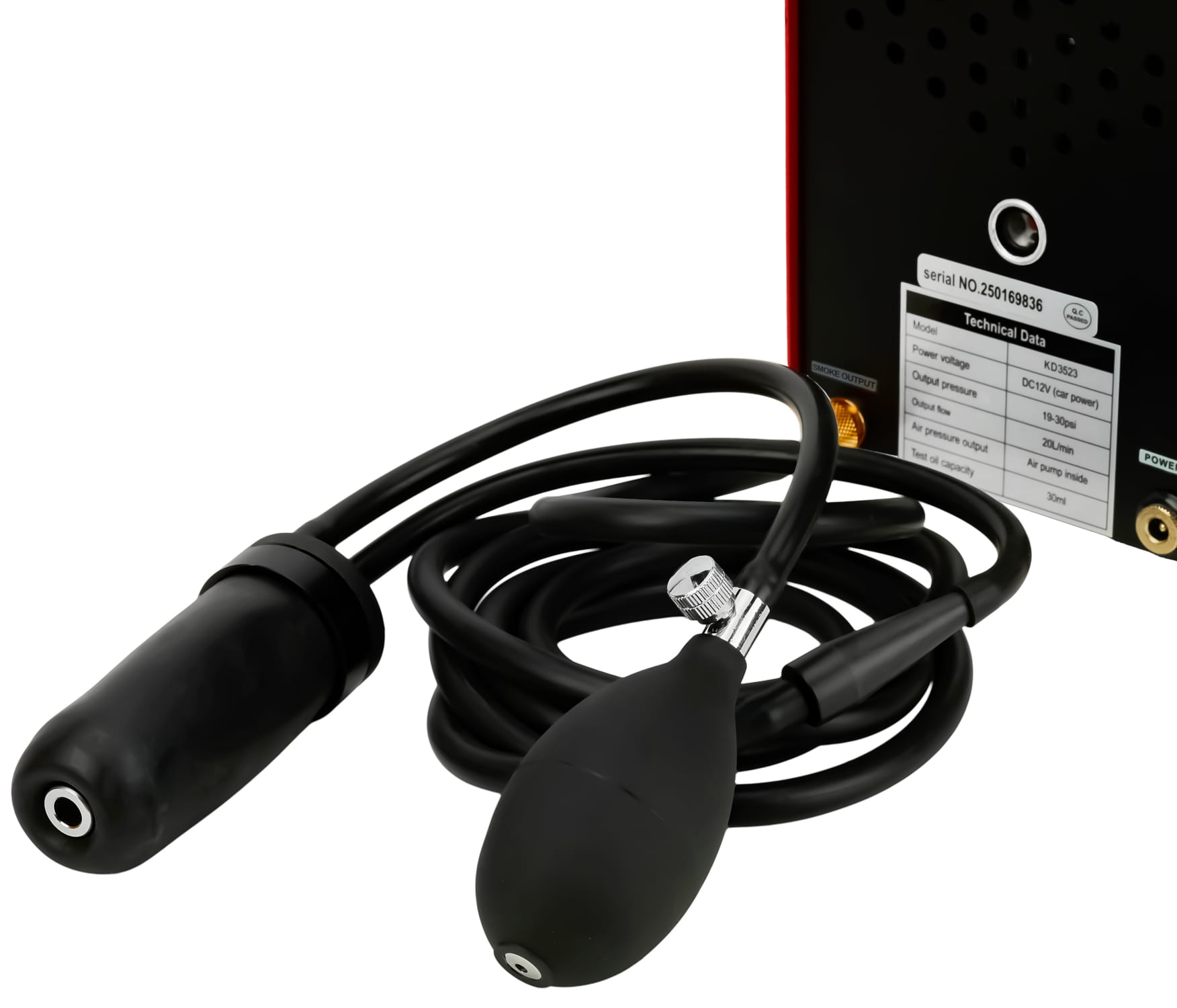 KD3523 to urządzenie diagnostyczne służące do lokalizowania nieszczelności w układach rurowych pojazdów. Metoda dymna polega na wtłaczaniu zadymionego powietrza do badanego układu — dym wydostający się w miejscu nieszczelności precyzyjnie wskazuje lokalizację wycieku bez konieczności demontażu podzespołów. Urządzenie zasilane jest bezpośrednio z instalacji pojazdu (12V DC), co eliminuje potrzebę podłączania zewnętrznego kompresora lub innego źródła zasilania.