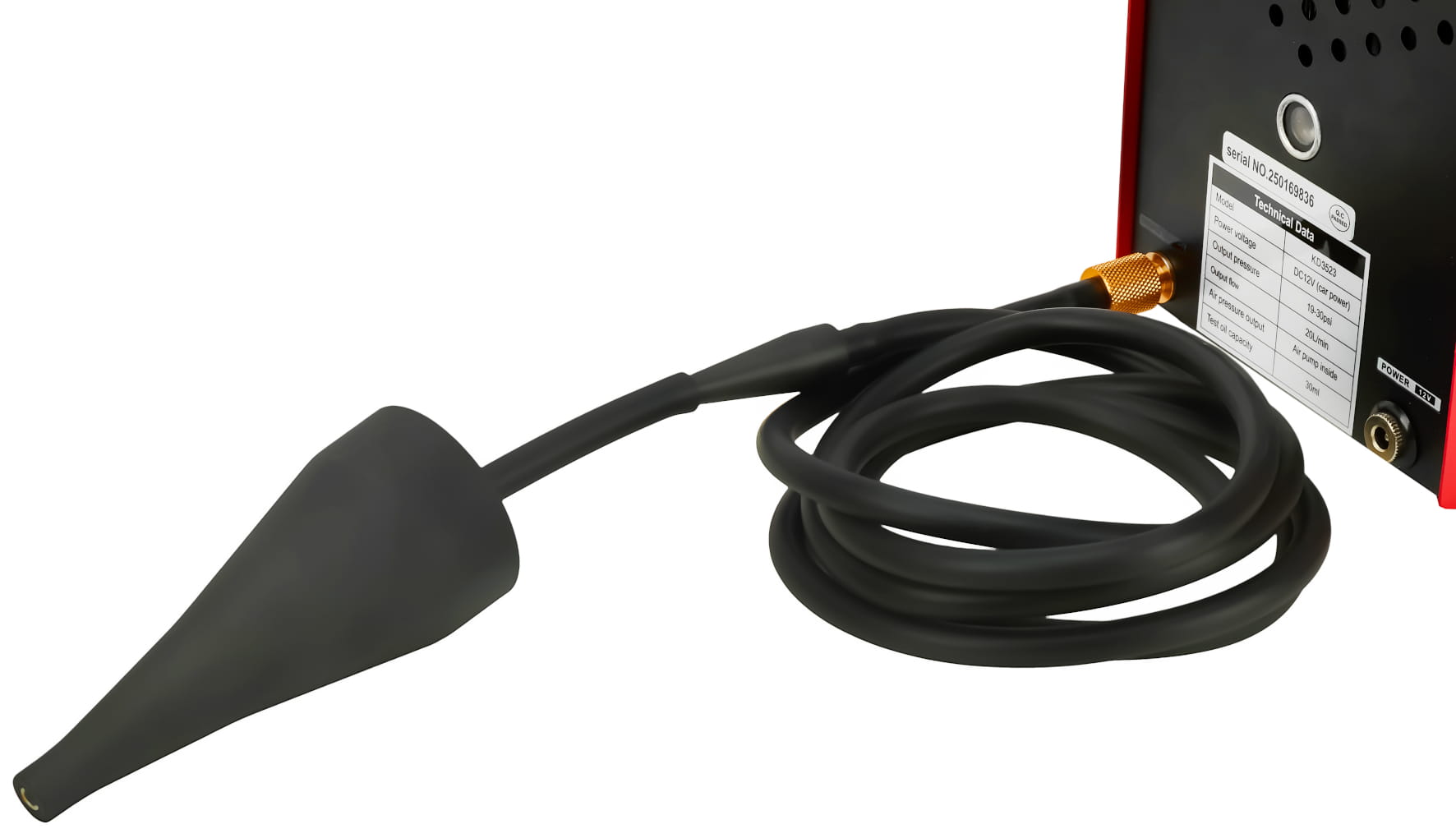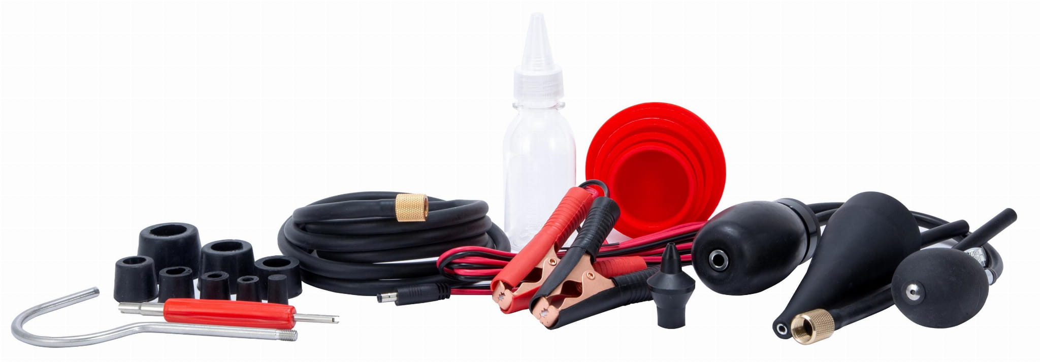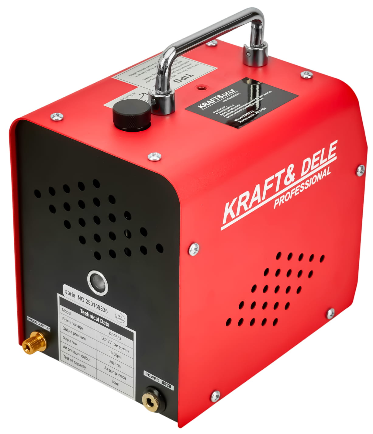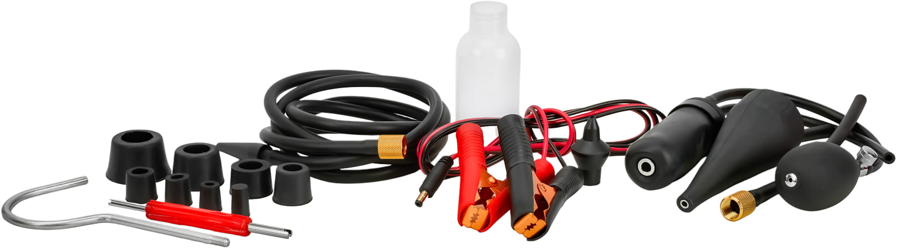 KD3523 to urządzenie diagnostyczne służące do lokalizowania nieszczelności w układach rurowych pojazdów. Metoda dymna polega na wtłaczaniu zadymionego powietrza do badanego układu — dym wydostający się w miejscu nieszczelności precyzyjnie wskazuje lokalizację wycieku bez konieczności demontażu podzespołów. Urządzenie zasilane jest bezpośrednio z instalacji pojazdu (12V DC), co eliminuje potrzebę podłączania zewnętrznego kompresora lub innego źródła zasilania.