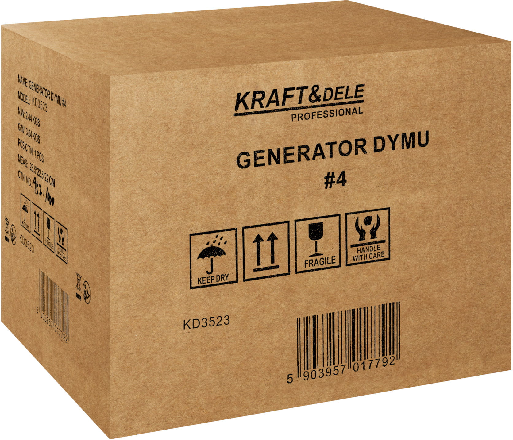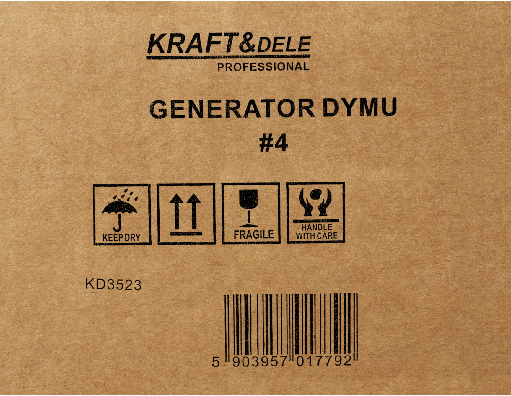 Generator dymu KD3523, kabel zasilający, adapter, klucz do zaworu, adapter EVAP, hak montażowy, wąż, pompka z gruszką, zestaw 8 okrągłych zatyczek, adapter portu wlotowego, butelka na olej, instrukcja obsługi w języku polskim.