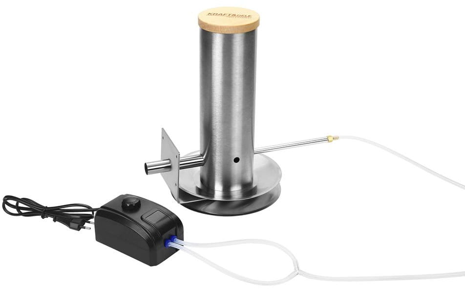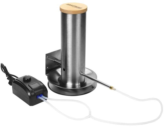 Regulowany przepływ powietrza do 3,5 l/min pozwala kontrolować intensywność dymu. Mniejszy przepływ generuje delikatniejszy dym — odpowiedni do ryb i serów. Większy — intensywniejszy, sprawdzający się przy mięsach wymagających głębszego przywędzenia.