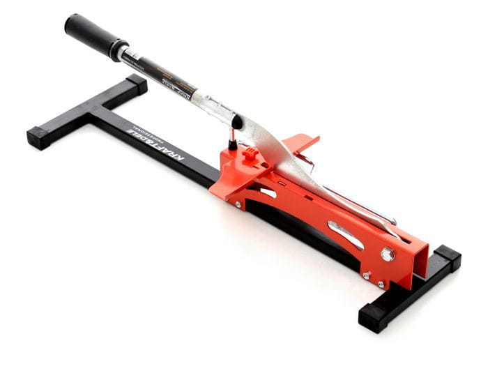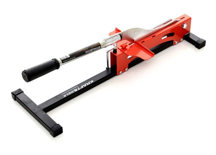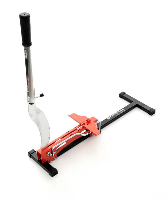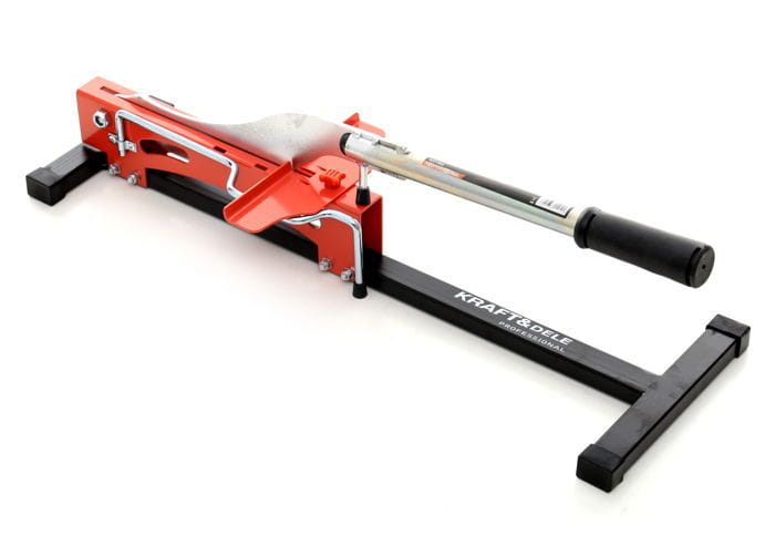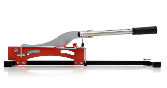 Ręczna gilotyna przeznaczona do cięcia paneli laminowanych o grubości do 12 mm. Narzędzie działa bez zasilania elektrycznego i nie wytwarza pyłu, co pozwala na prowadzenie prac wykończeniowych bezpośrednio w remontowanym pomieszczeniu — nawet bez dostępu do gniazdka elektrycznego.