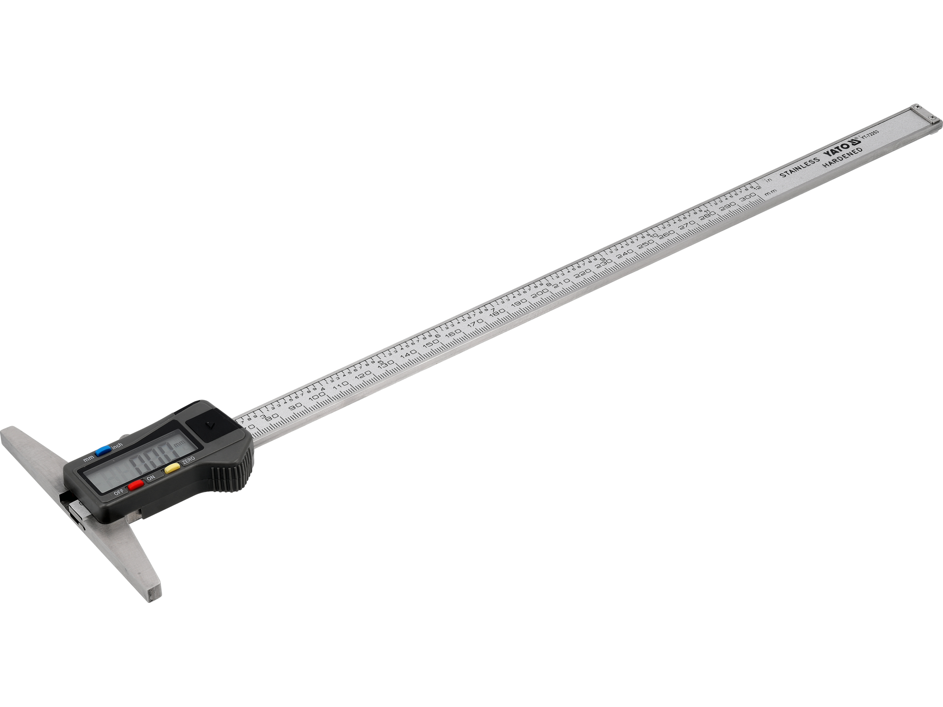 Cyfrowy przyrząd pomiarowy do precyzyjnego mierzenia głębokości otworów, rowków, wpustów i schodków. Zakres pomiarowy 0-300 mm z dokładnością ±0,03 mm i rozdzielczością 0,01 mm.