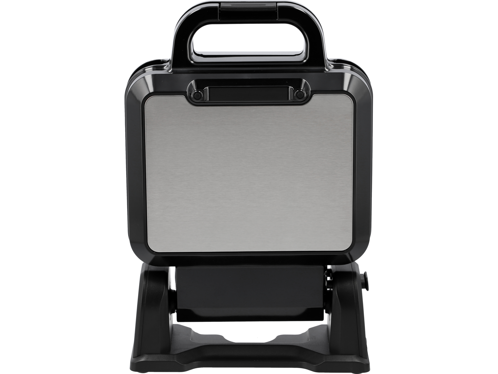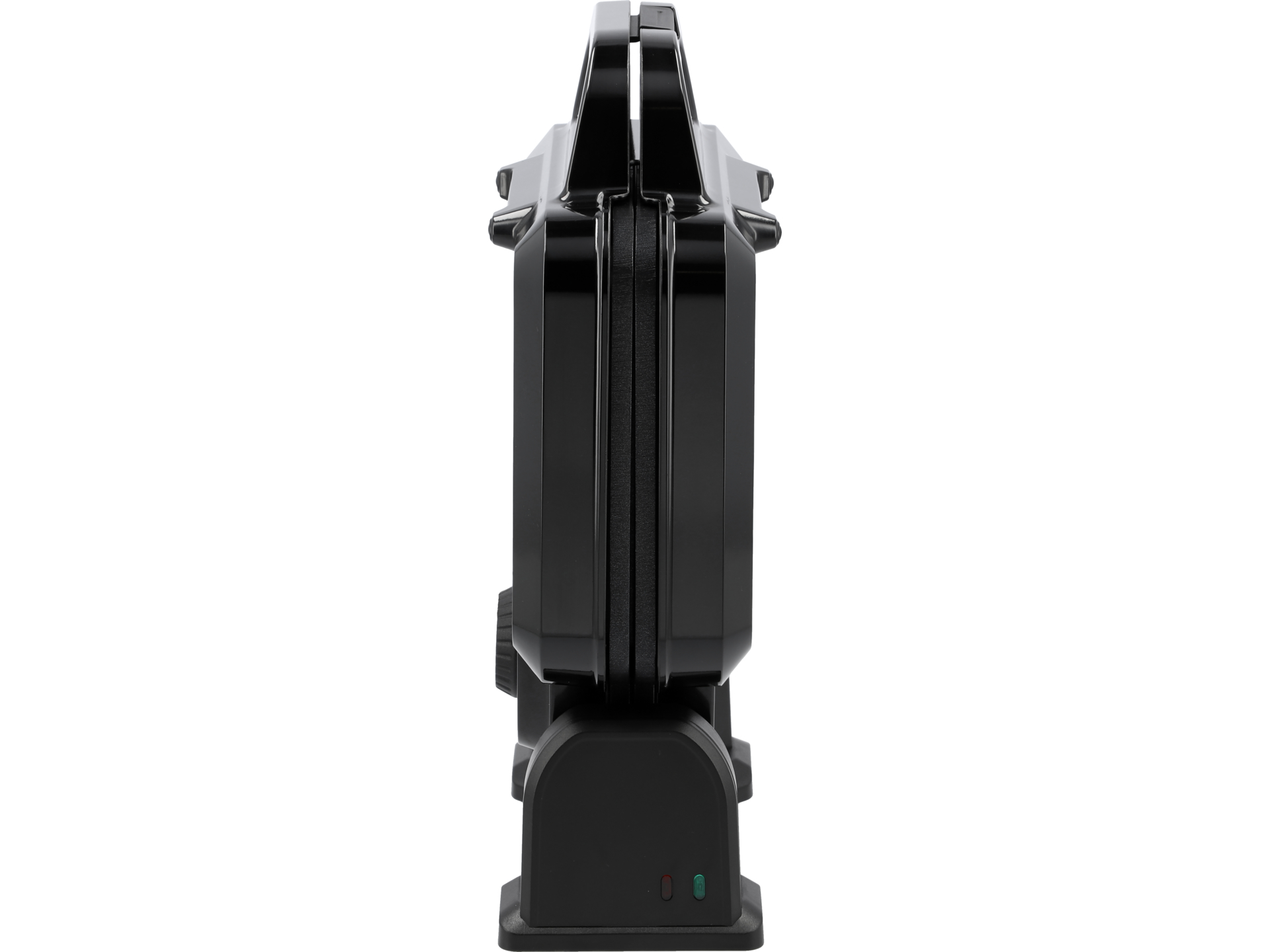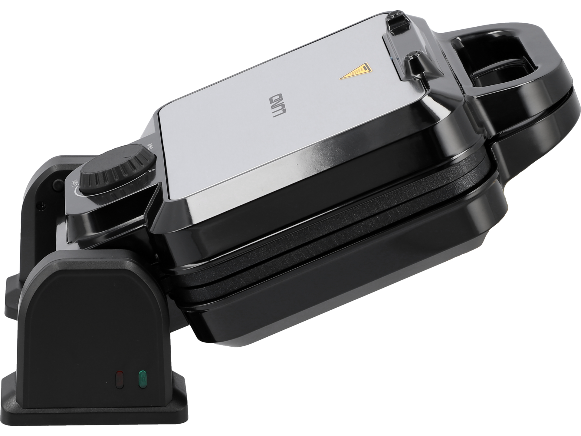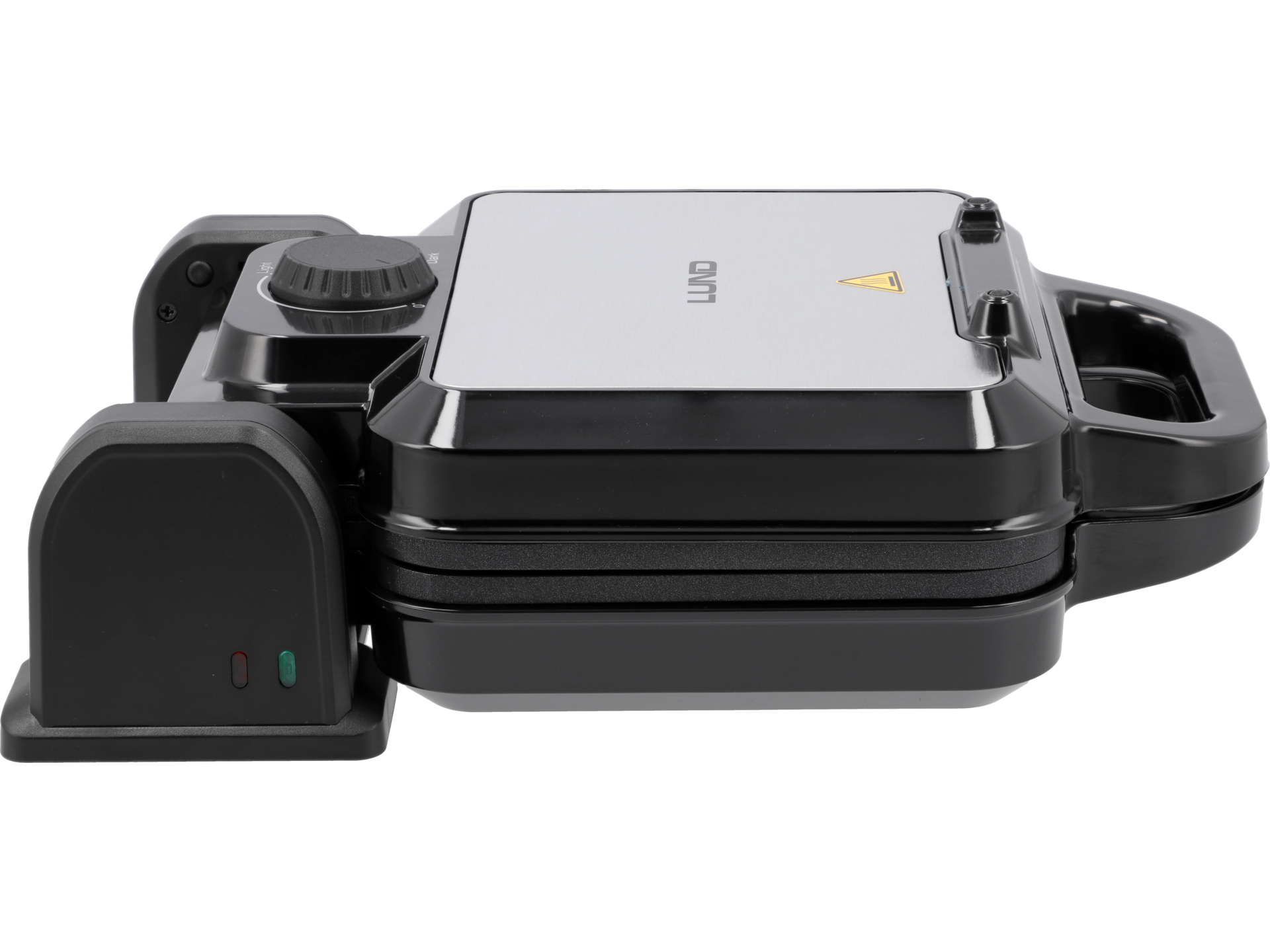 Izolowany uchwyt typu cool touch pozostaje chłodny podczas pracy, co zapobiega poparzeniom. Antypoślizgowe nóżki stabilizują urządzenie na blacie. Rowek wokół płyt zapobiega wypływaniu nadmiaru ciasta. Lampka kontrolna sygnalizuje gotowość do pracy – należy odczekać, aż urządzenie osiągnie ustawioną temperaturę przed nalaniem ciasta.