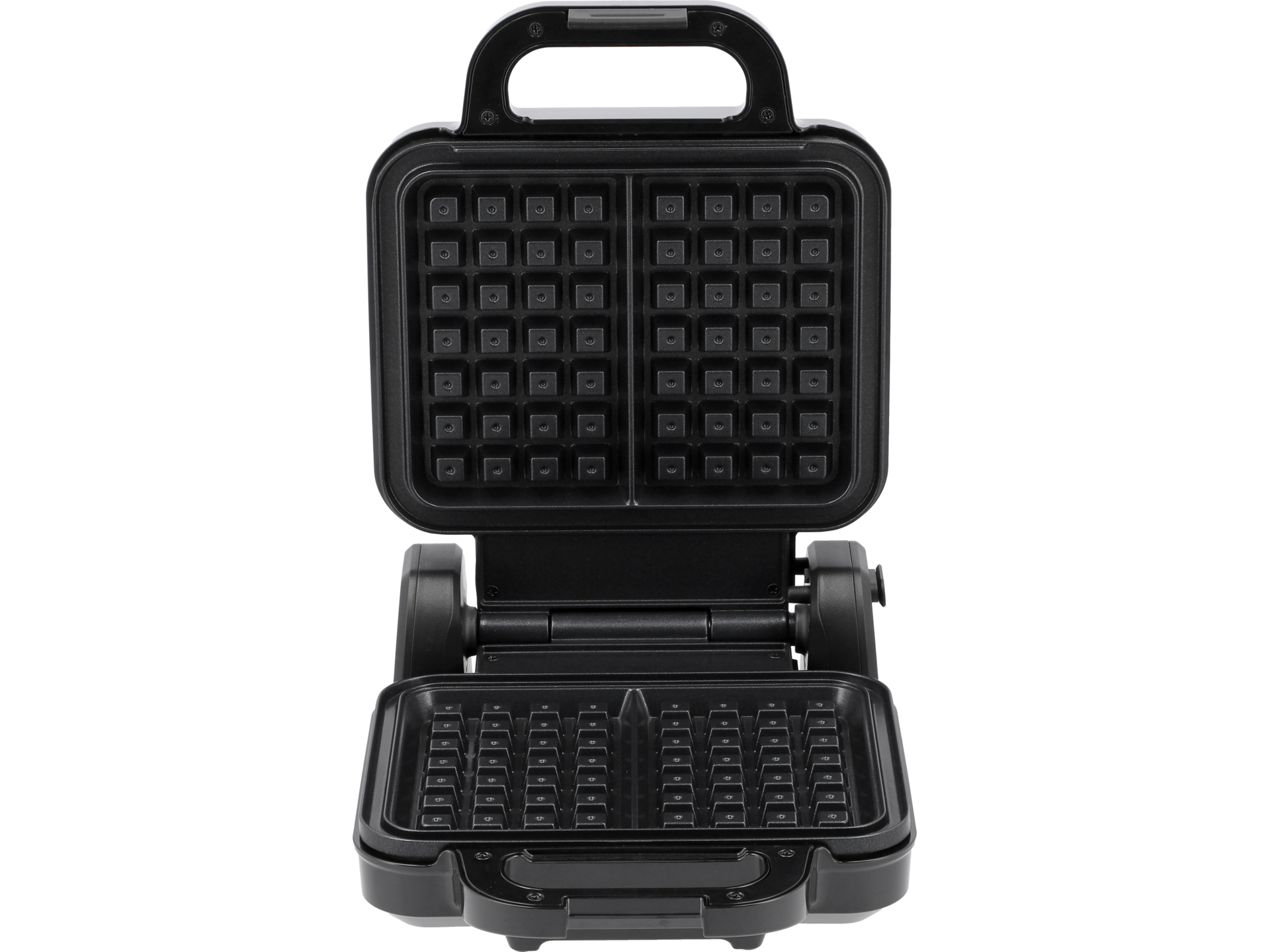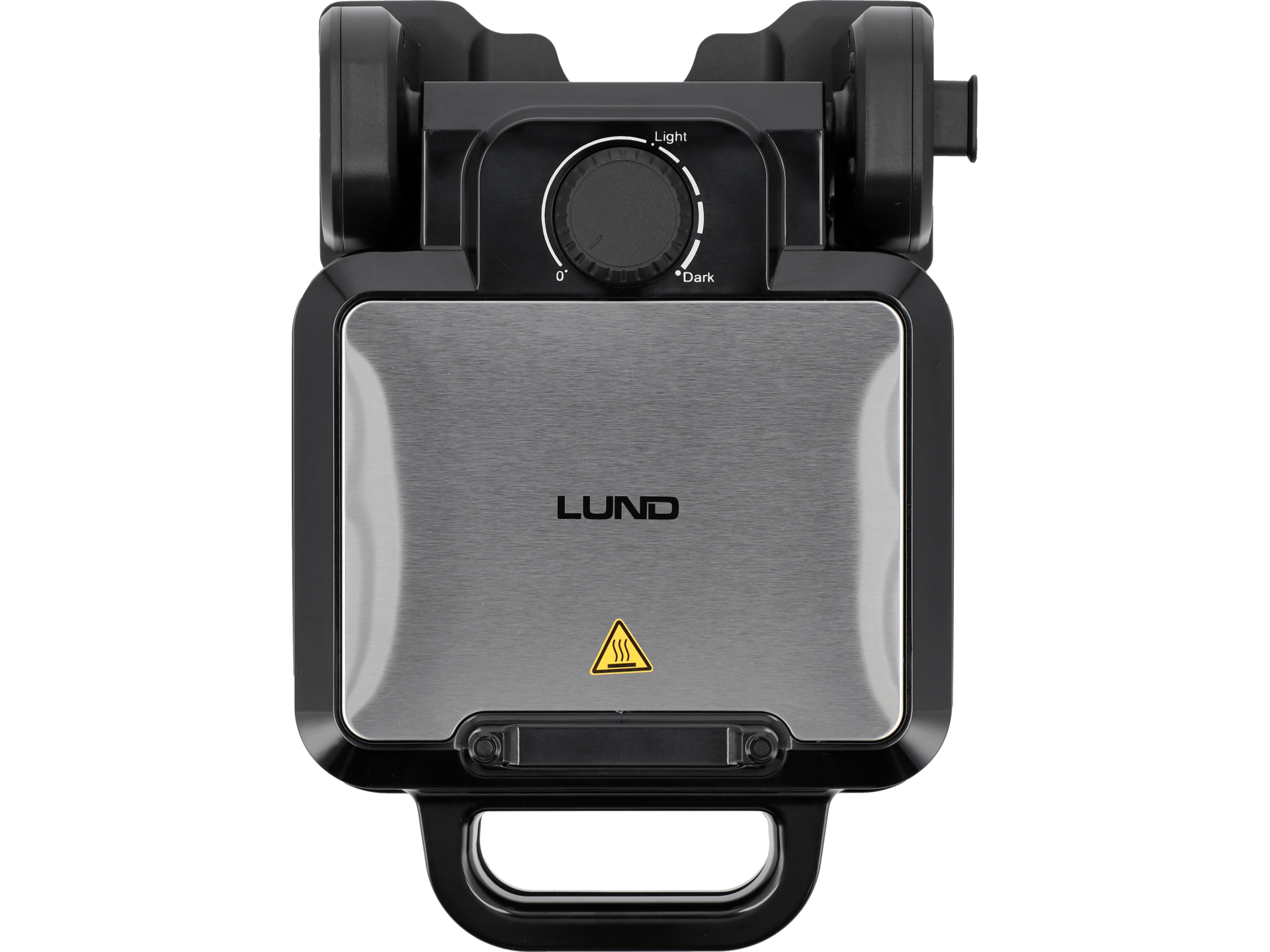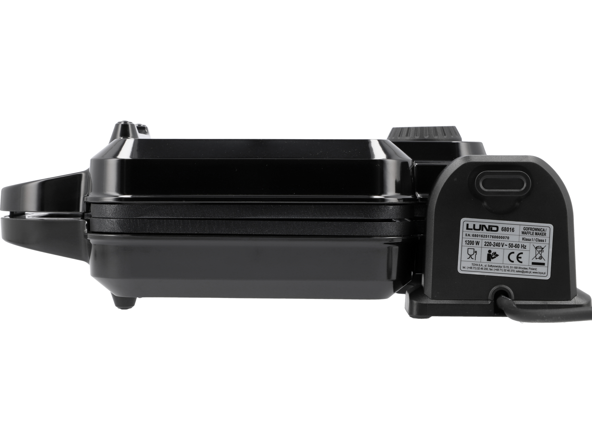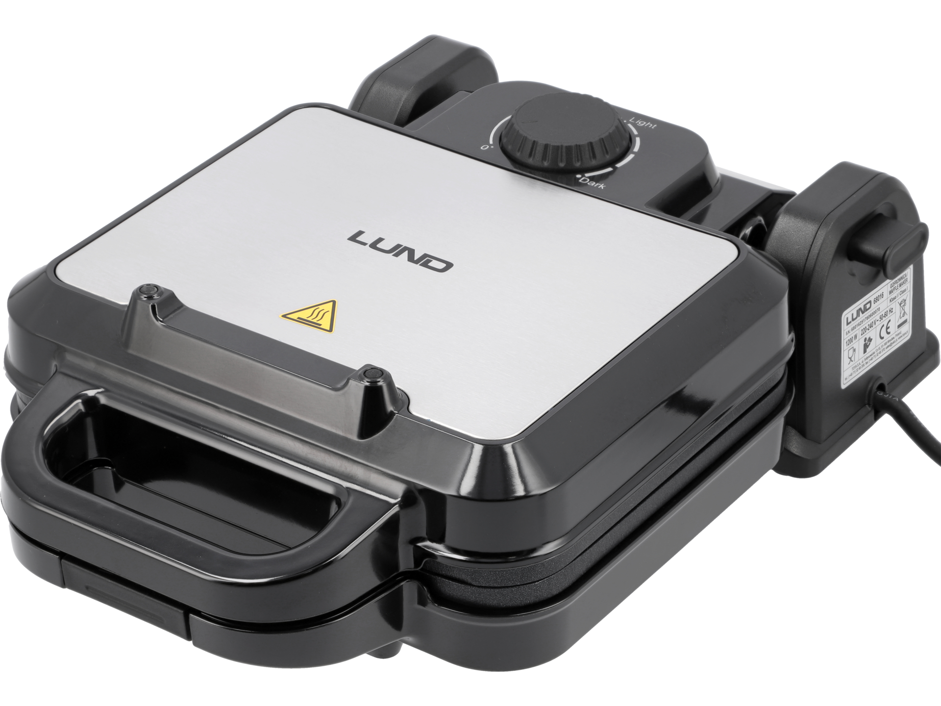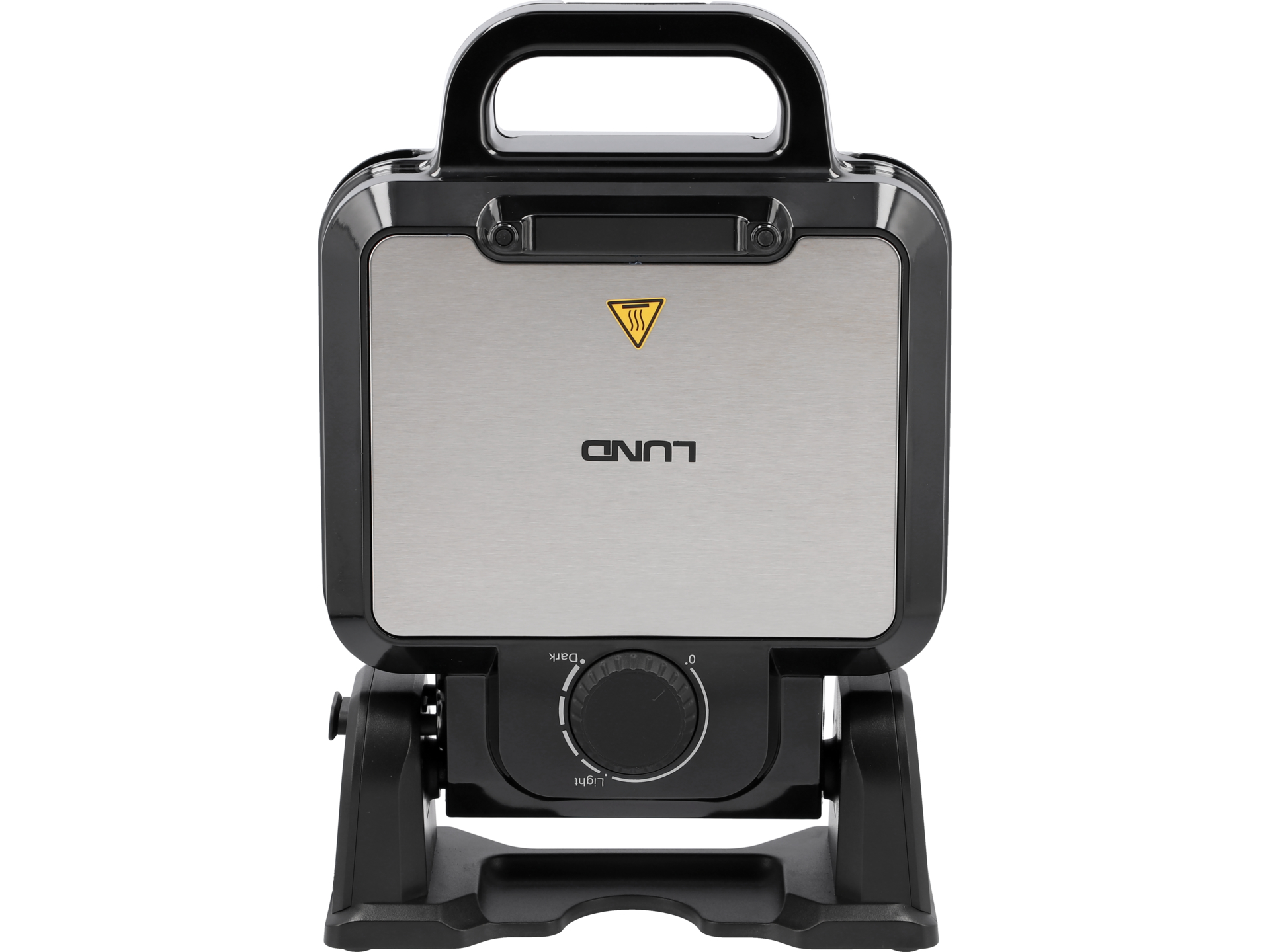 Izolowany uchwyt typu cool touch pozostaje chłodny podczas pracy, co zapobiega poparzeniom. Antypoślizgowe nóżki stabilizują urządzenie na blacie. Rowek wokół płyt zapobiega wypływaniu nadmiaru ciasta. Lampka kontrolna sygnalizuje gotowość do pracy – należy odczekać, aż urządzenie osiągnie ustawioną temperaturę przed nalaniem ciasta.