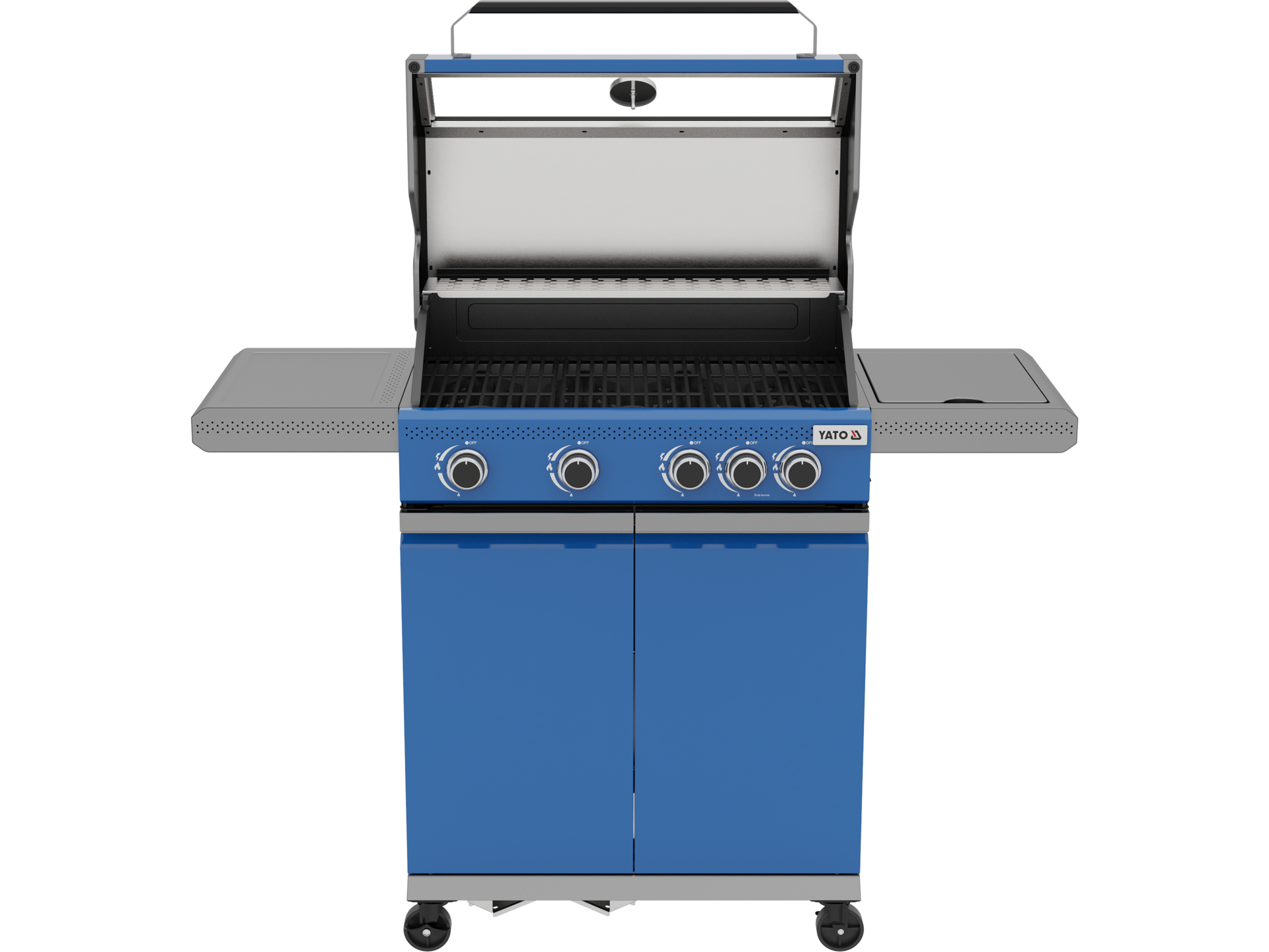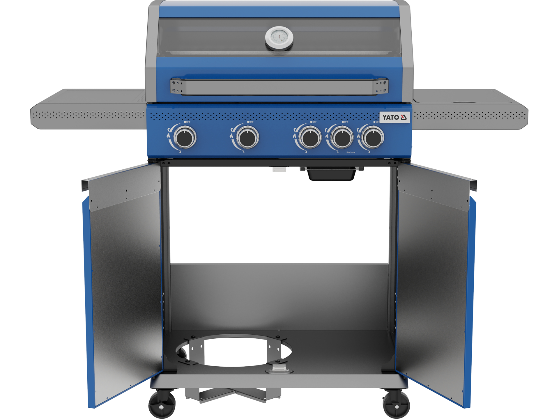 Pięciopalnikowy grill gazowy z żeliwnymi rusztami i dodatkowym palnikiem bocznym. Konstrukcja ze stali nierdzewnej S/S 430 z pokrywą wyposażoną w termometr i hartowaną szybę 6 mm.