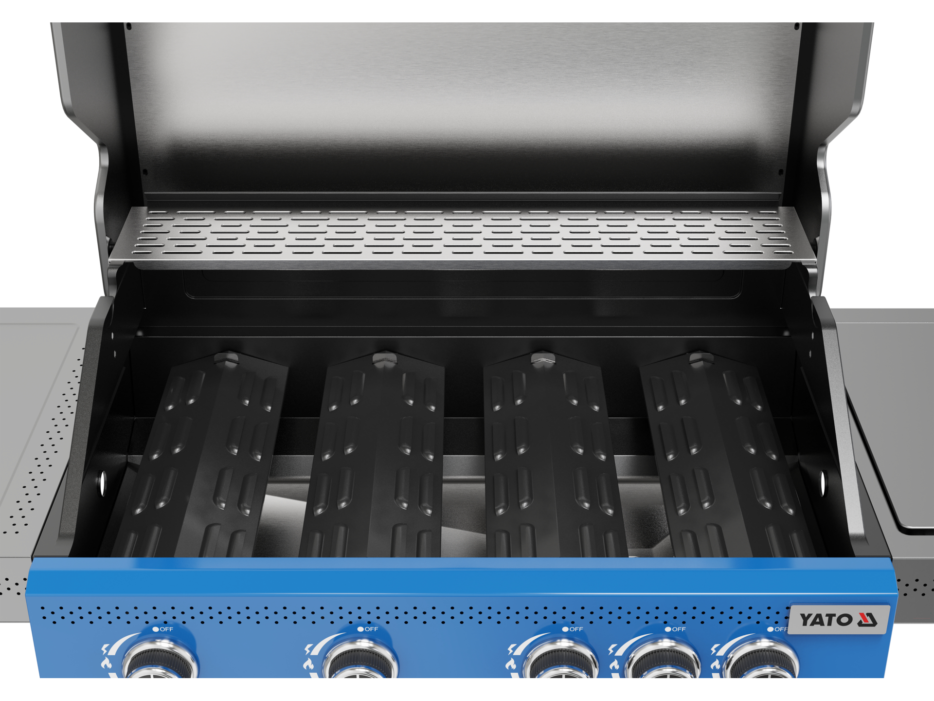 Cztery główne palniki ze stali nierdzewnej po 3 kW każdy oraz palnik boczny 2,2 kW. Taka konfiguracja pozwala na jednoczesne grillowanie różnych produktów w różnych temperaturach – mięso na głównej powierzchni, warzywa na niższej temperaturze, a sos czy zupa na palniku bocznym.