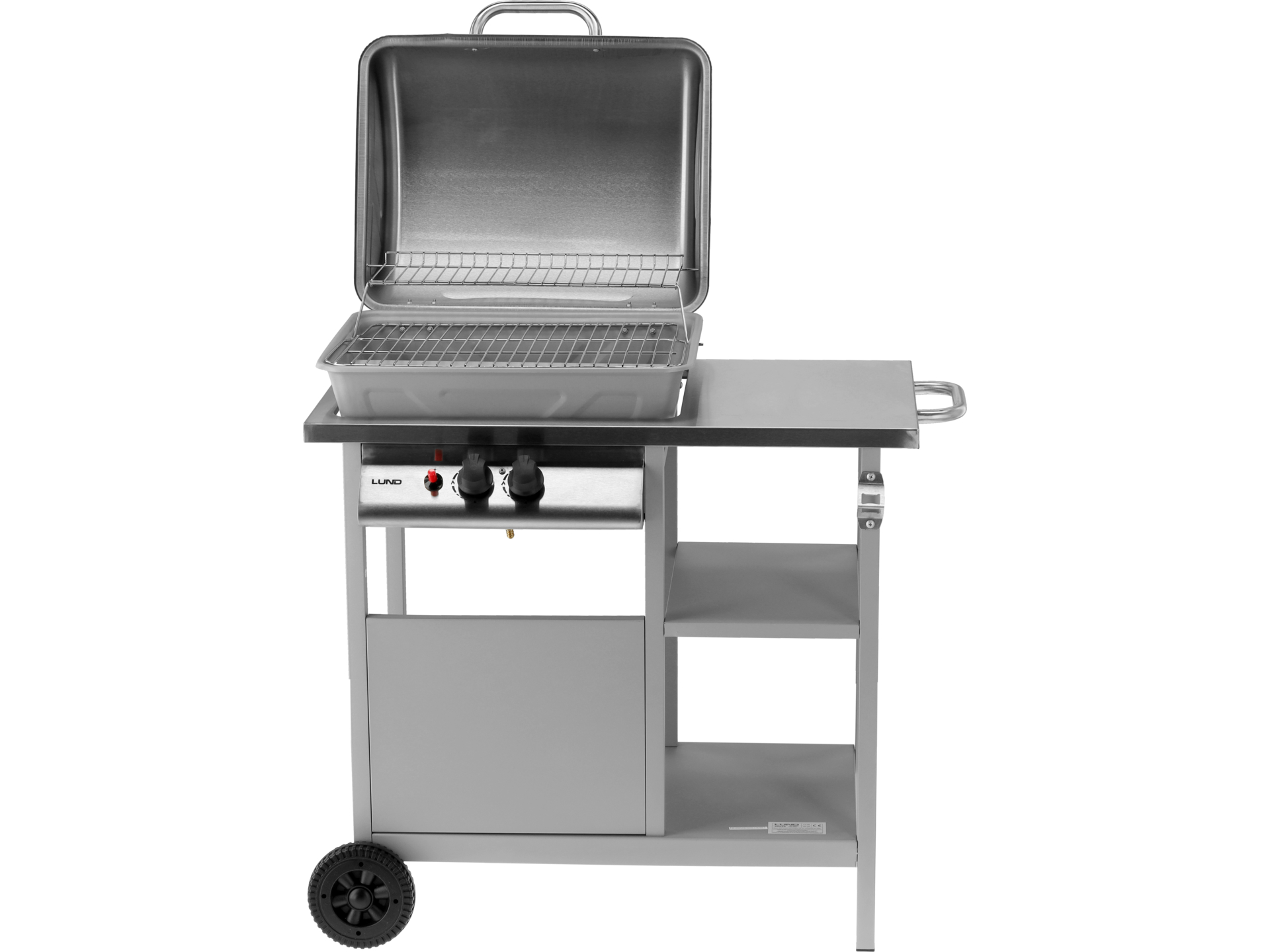 Przenośny grill gazowy z dwoma palnikami o łącznej mocy 5,5 kW, wyposażony w chromowany ruszt o wymiarach 48×37 cm oraz kratkę podgrzewającą. Konstrukcja ze stali SPCC i elementami ze stali nierdzewnej zapewnia trwałość przy masie 16,3 kg.