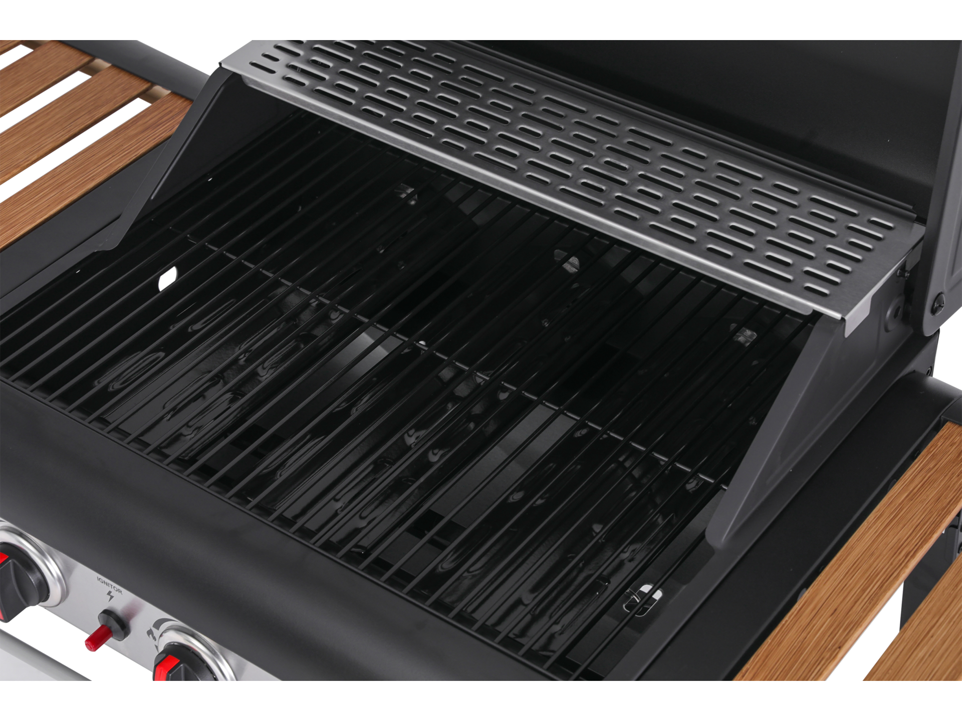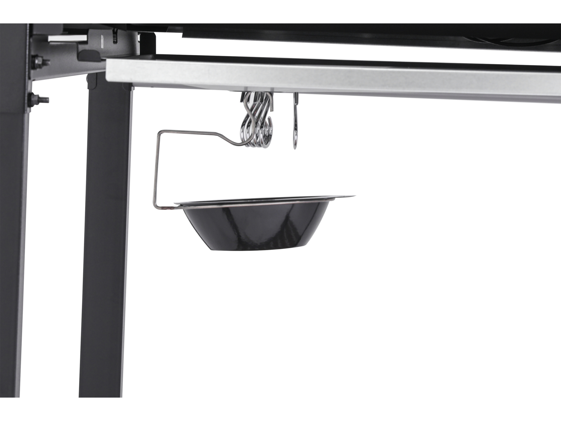 Dodatkowa kratka o wymiarach 570x120 mm utrzymuje ciepło już przygotowanych potraw. Termometr umieszczony w pokrywie pozwala na bieżącą kontrolę temperatury wewnętrznej bez konieczności otwierania grilla, co zapobiega utracie ciepła.