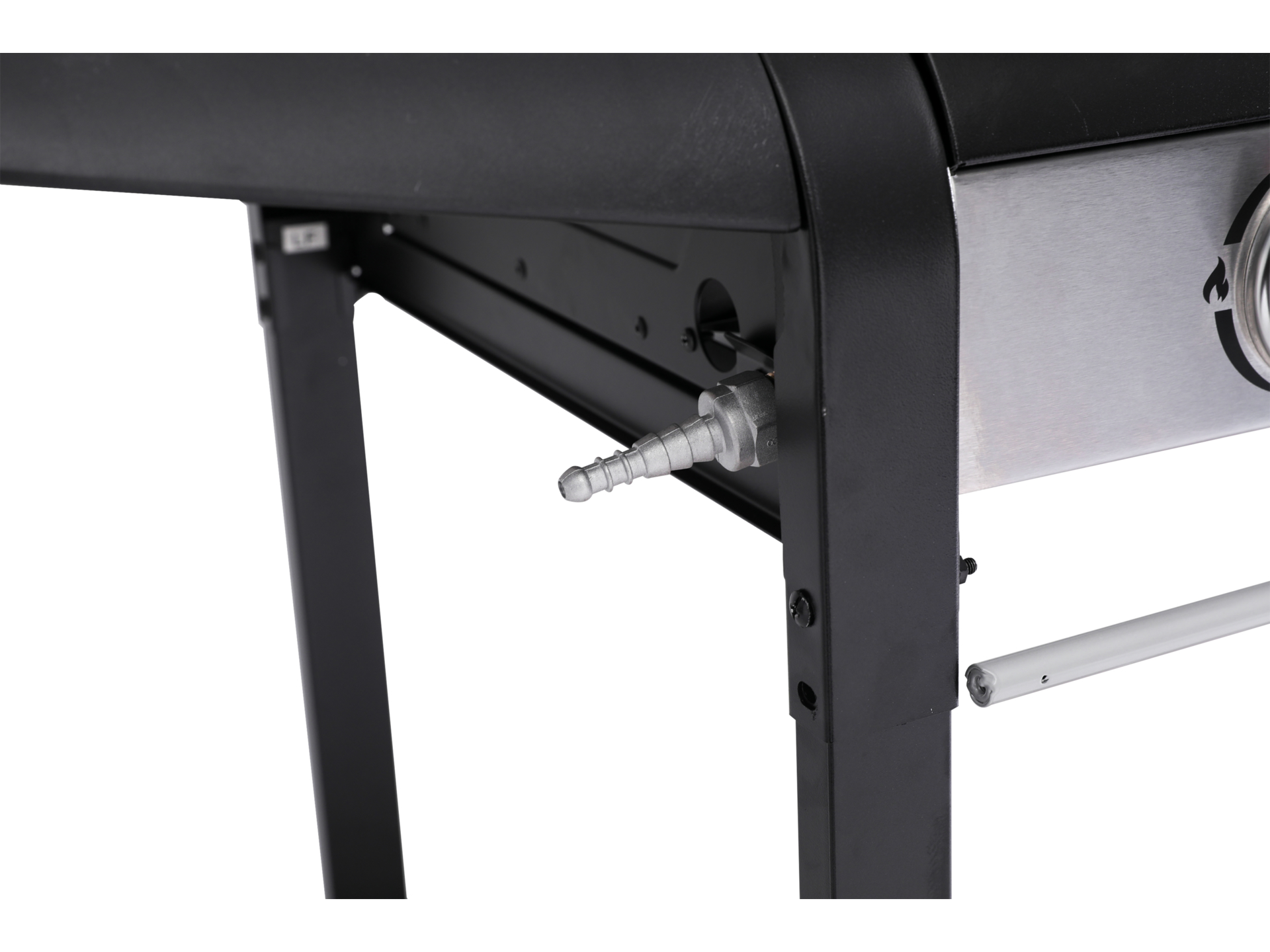 Grill wymaga podłączenia do butli z butanem G30 lub propanem G31 za pomocą węża z reduktorem (np. VOREL 99670 lub 99671). Ciśnienie robocze wynosi 37 mbar, a typ pojemnika musi odpowiadać normie EN 498: I3B/P(37). Przed pierwszym użyciem należy sprawdzić szczelność połączeń wodą z mydłem.