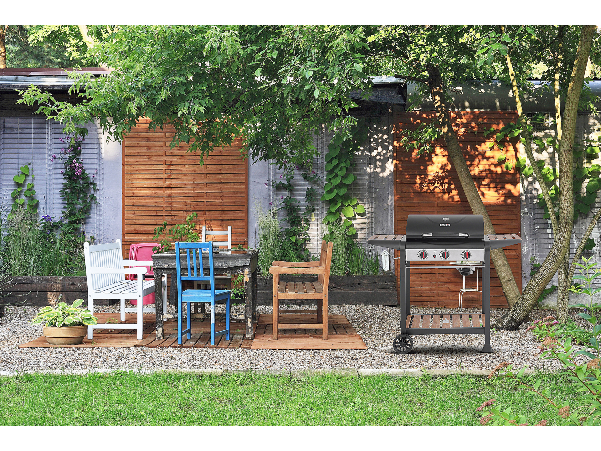 Przenośny grill gazowy z trzema palnikami głównymi o łącznej mocy 9 kW (3x3 kW). Konstrukcja stalowa z emaliowanymi elementami, ruszt o wymiarach 600x420 mm, termometr w pokrywie oraz kratka podgrzewająca. Zasilanie butanem G30 lub propanem G31 przy ciśnieniu 37 mbar.