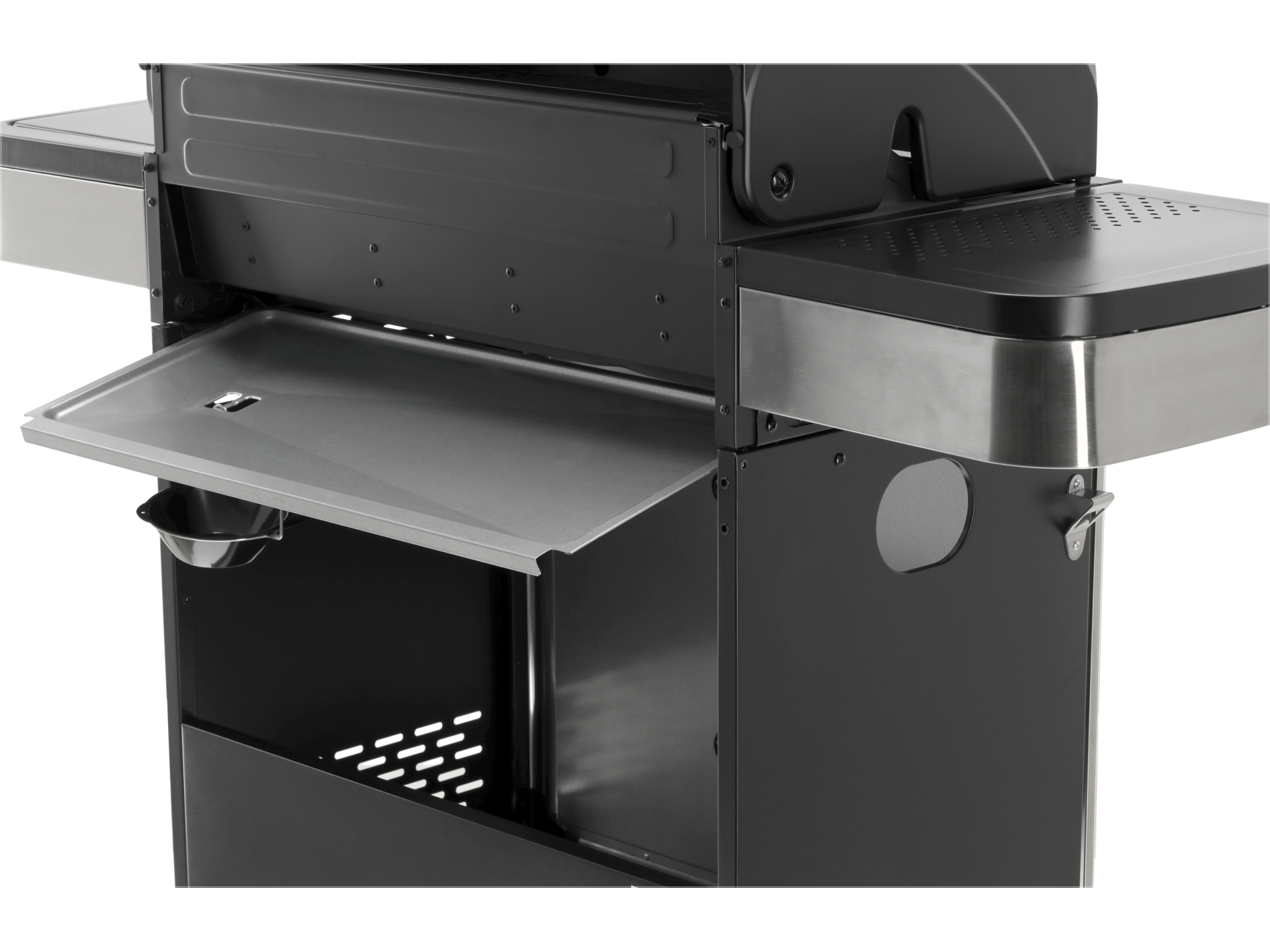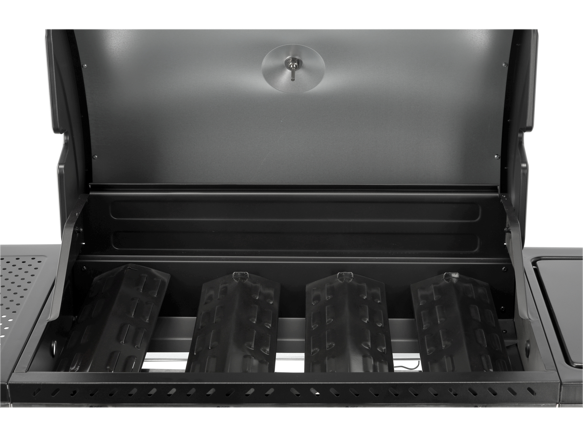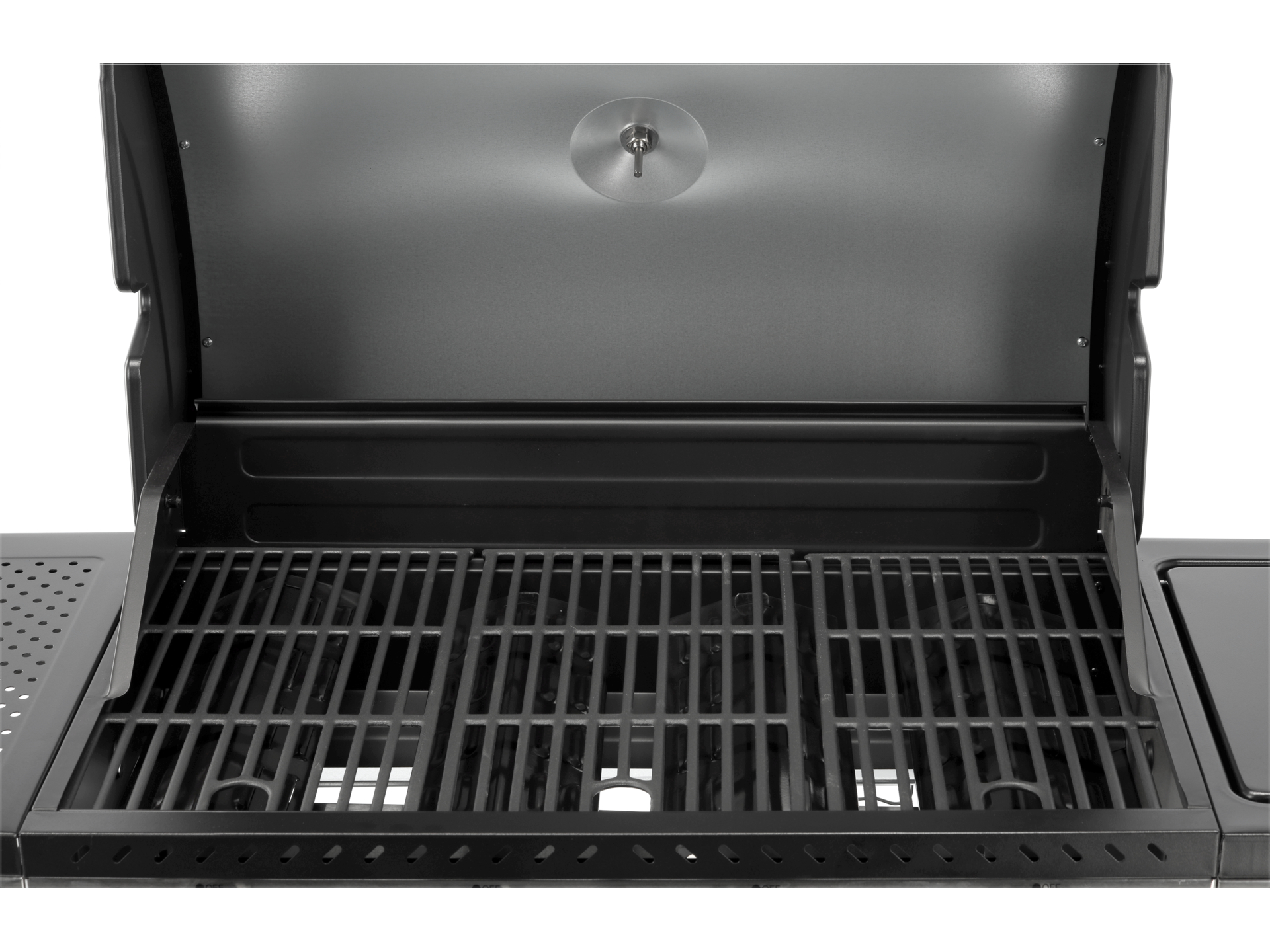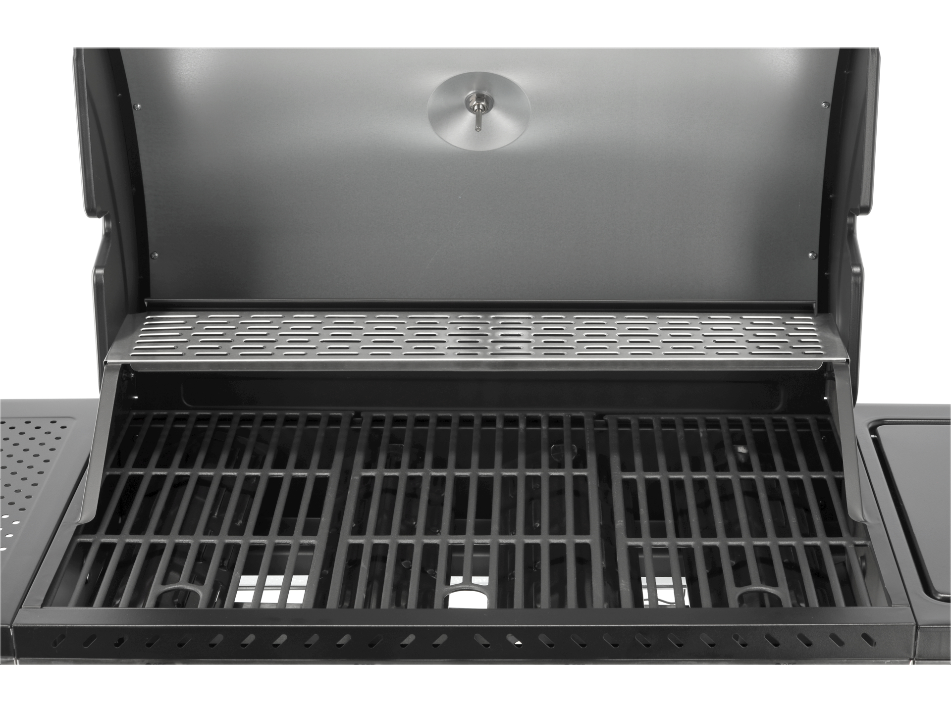 Wbudowany termometr pozwala monitorować temperaturę wewnątrz grilla bez otwierania pokrywy, co zapobiega utracie ciepła. Kratka podgrzewająca o wymiarach 700×420 mm umożliwia utrzymanie ciepła gotowych potraw lub delikatne podgrzewanie bułek i warzyw.