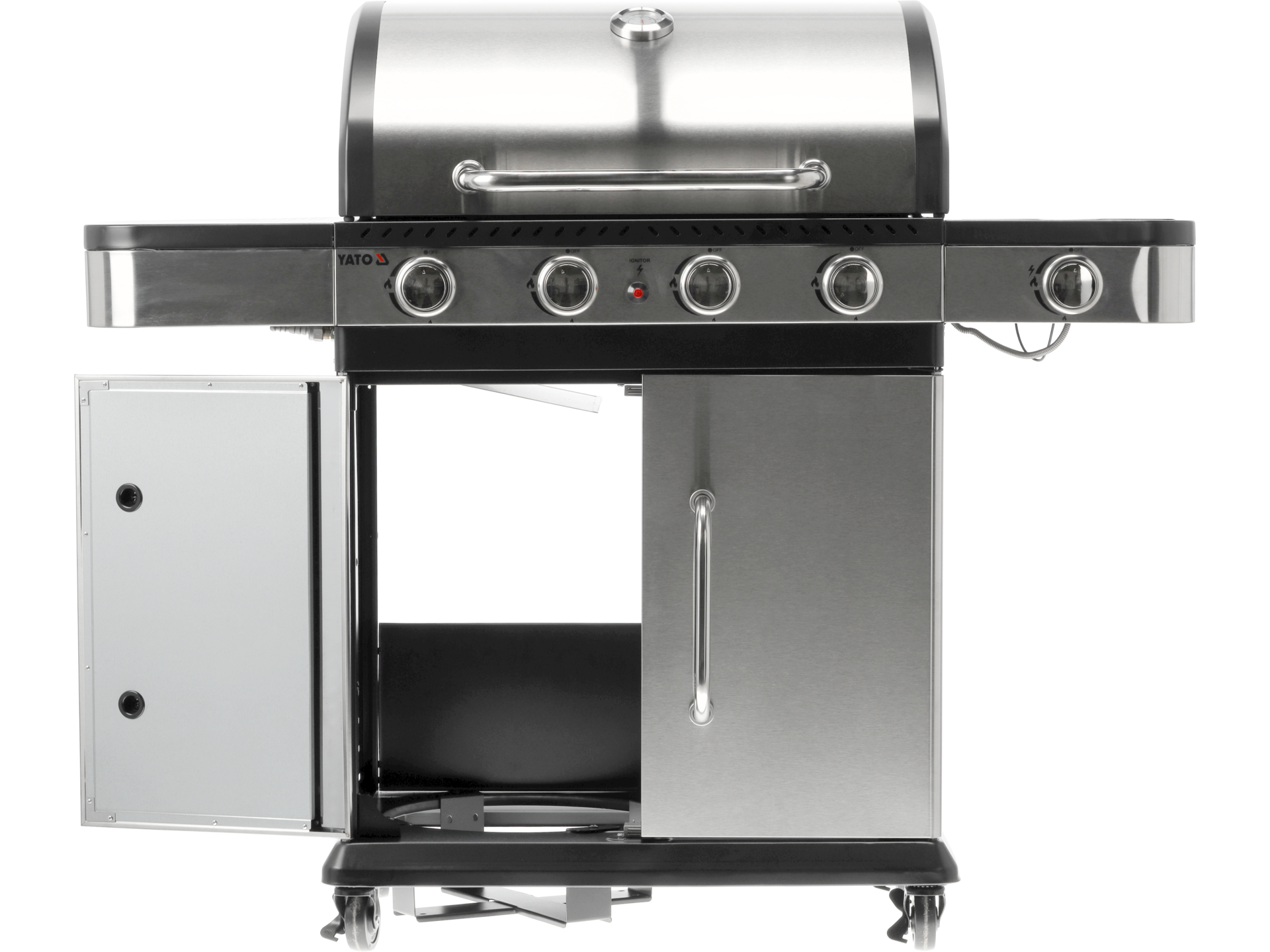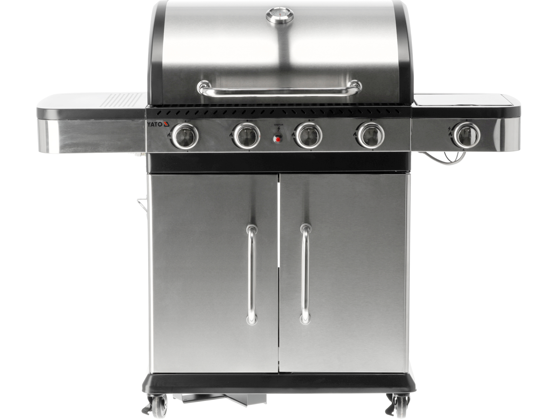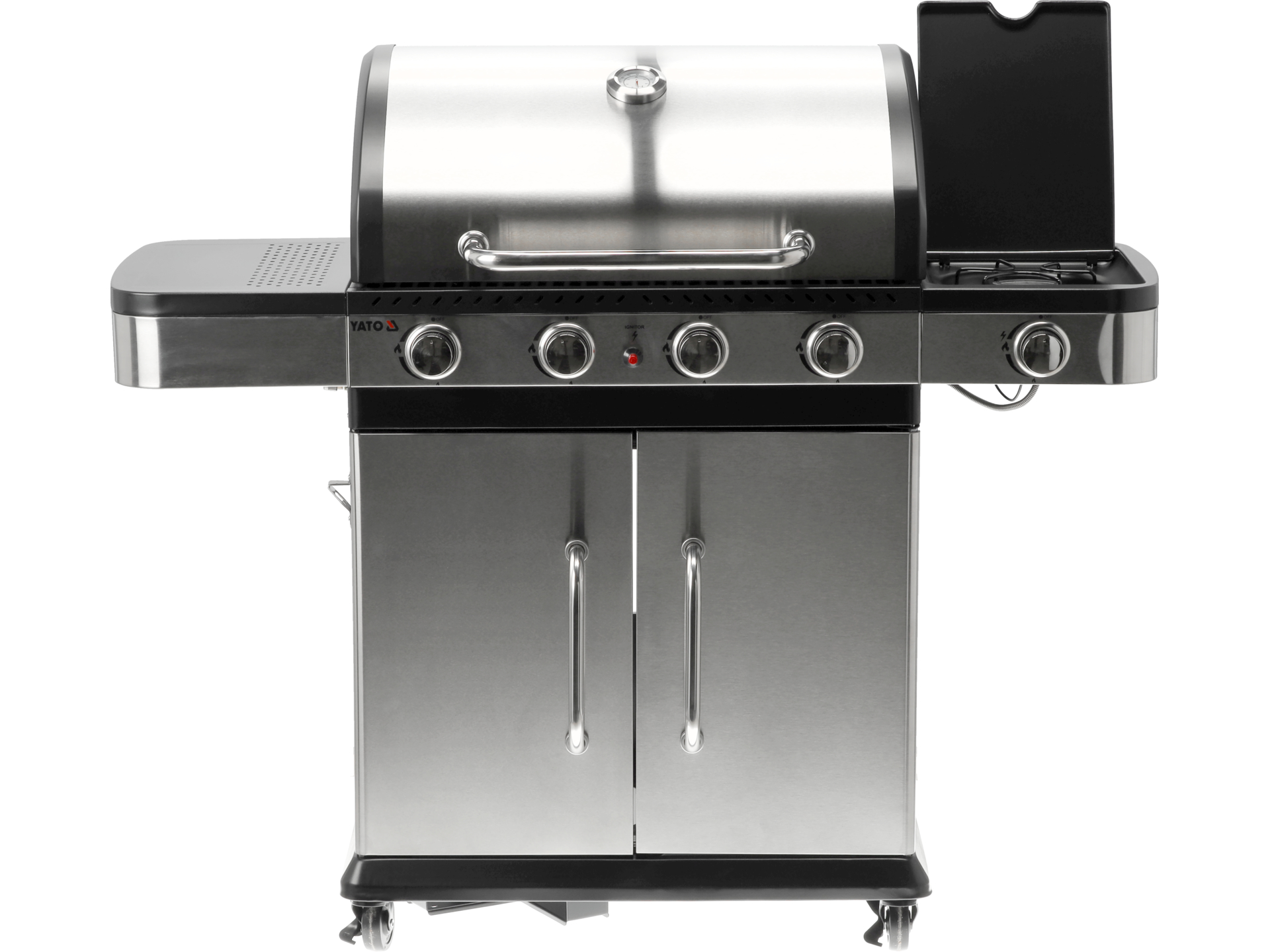 Przenośny grill gazowy z czterema palnikami głównymi i dodatkowym palnikiem bocznym, wyposażony w żeliwny ruszt o powierzchni 700×420 mm. Konstrukcja ze stali nierdzewnej S/S 430 zapewnia trwałość użytkowania na zewnątrz.