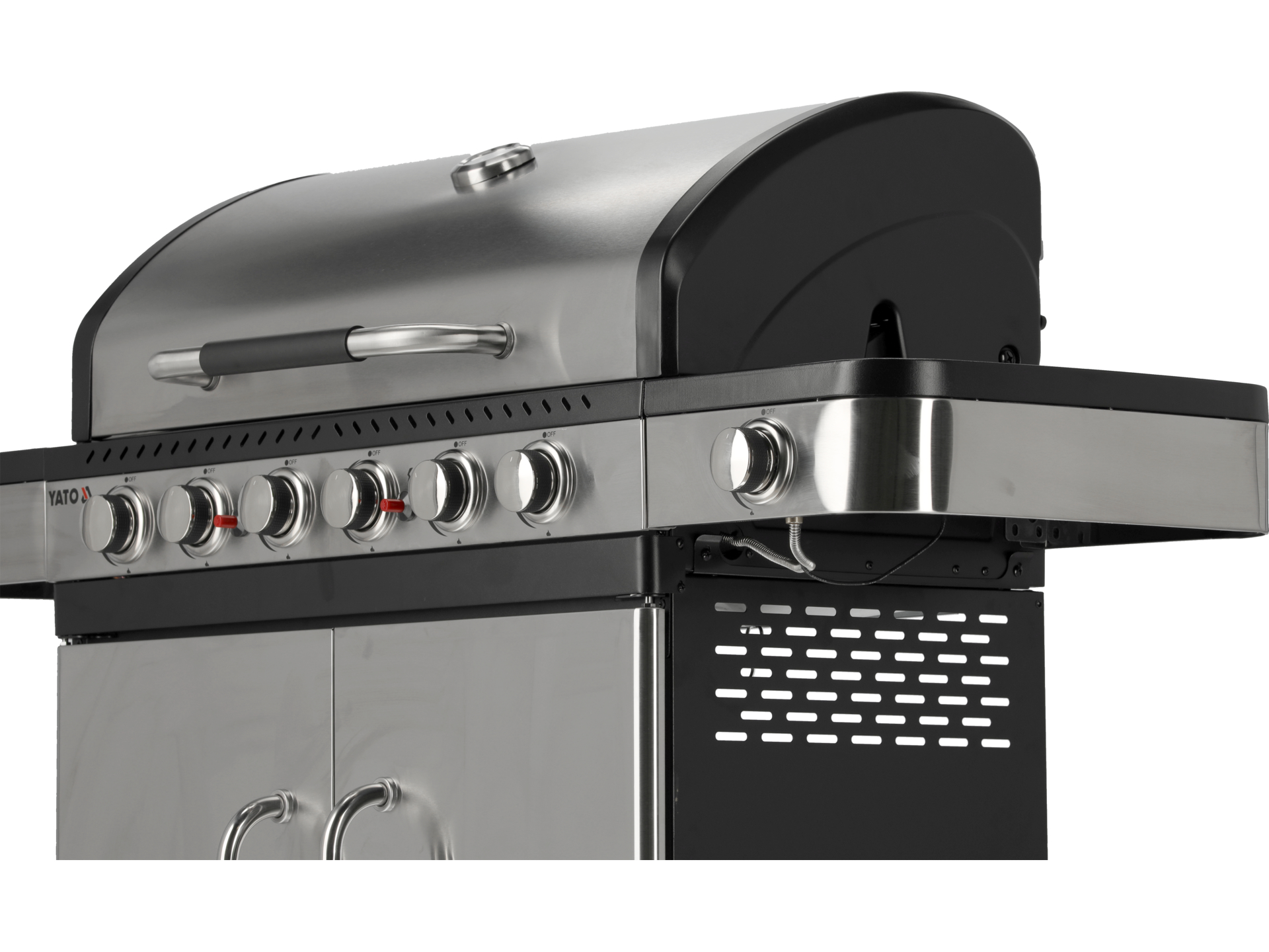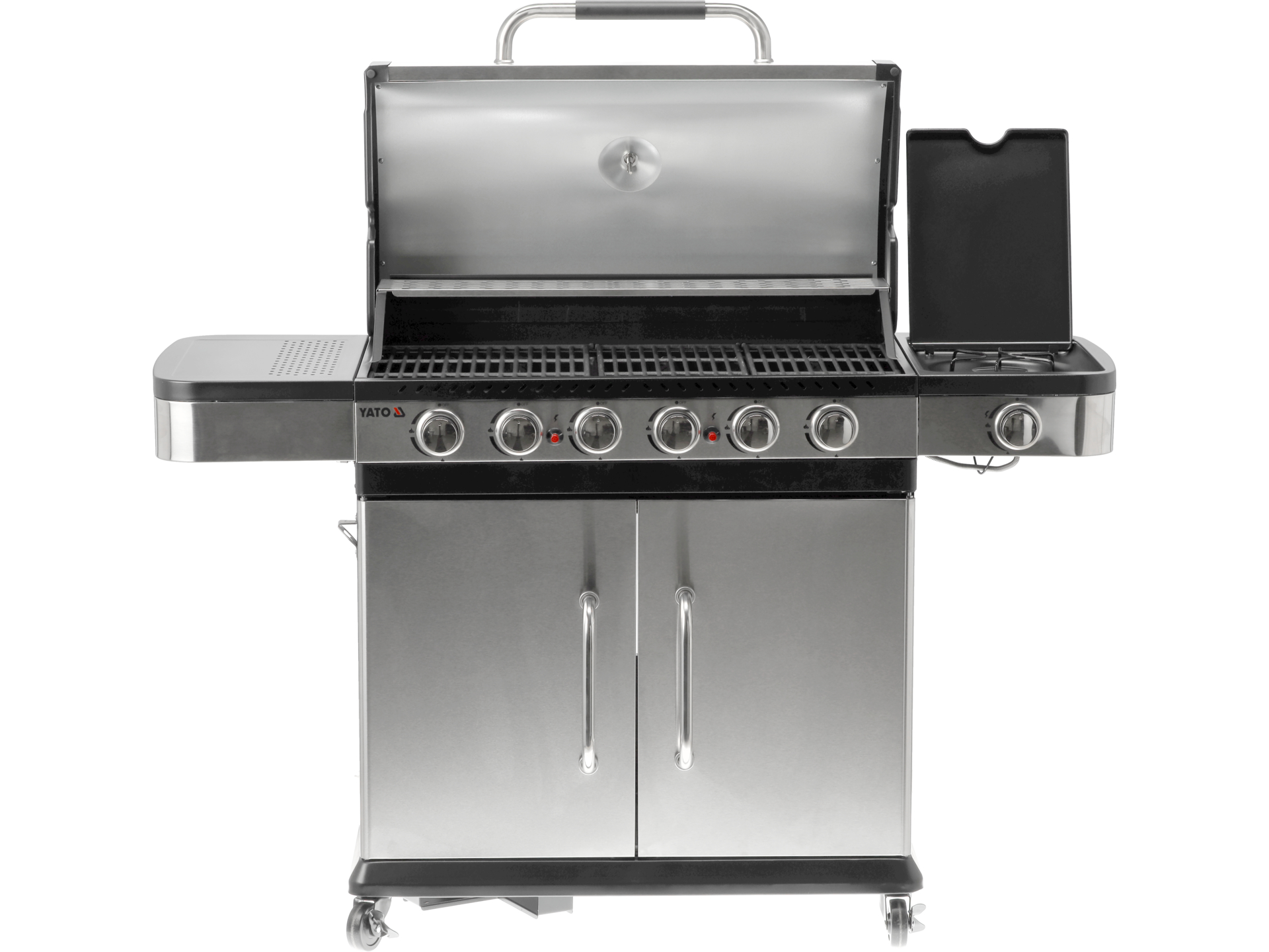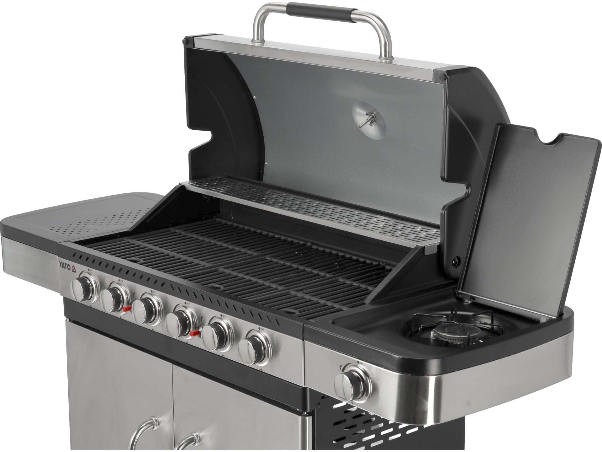 Grill gazowy YATO YG-20004 to przenośne urządzenie grillowe wyposażone w 6 palników głównych oraz dodatkowy palnik boczny o łącznej mocy 20,2 kW. Konstrukcja ze stali nierdzewnej S/S 430 i żeliwnych rusztów zapewnia trwałość i równomierne rozprowadzenie ciepła podczas grillowania.