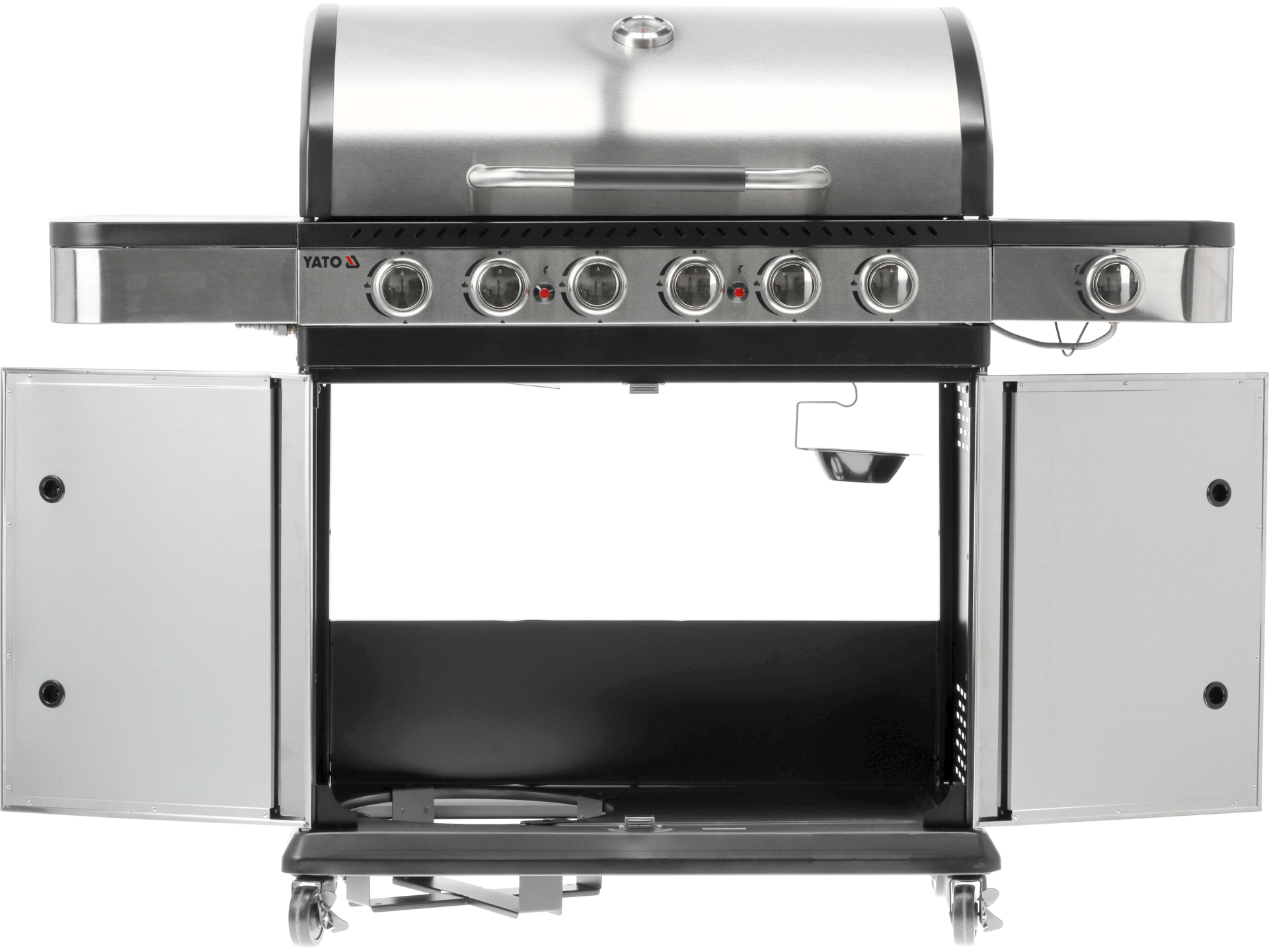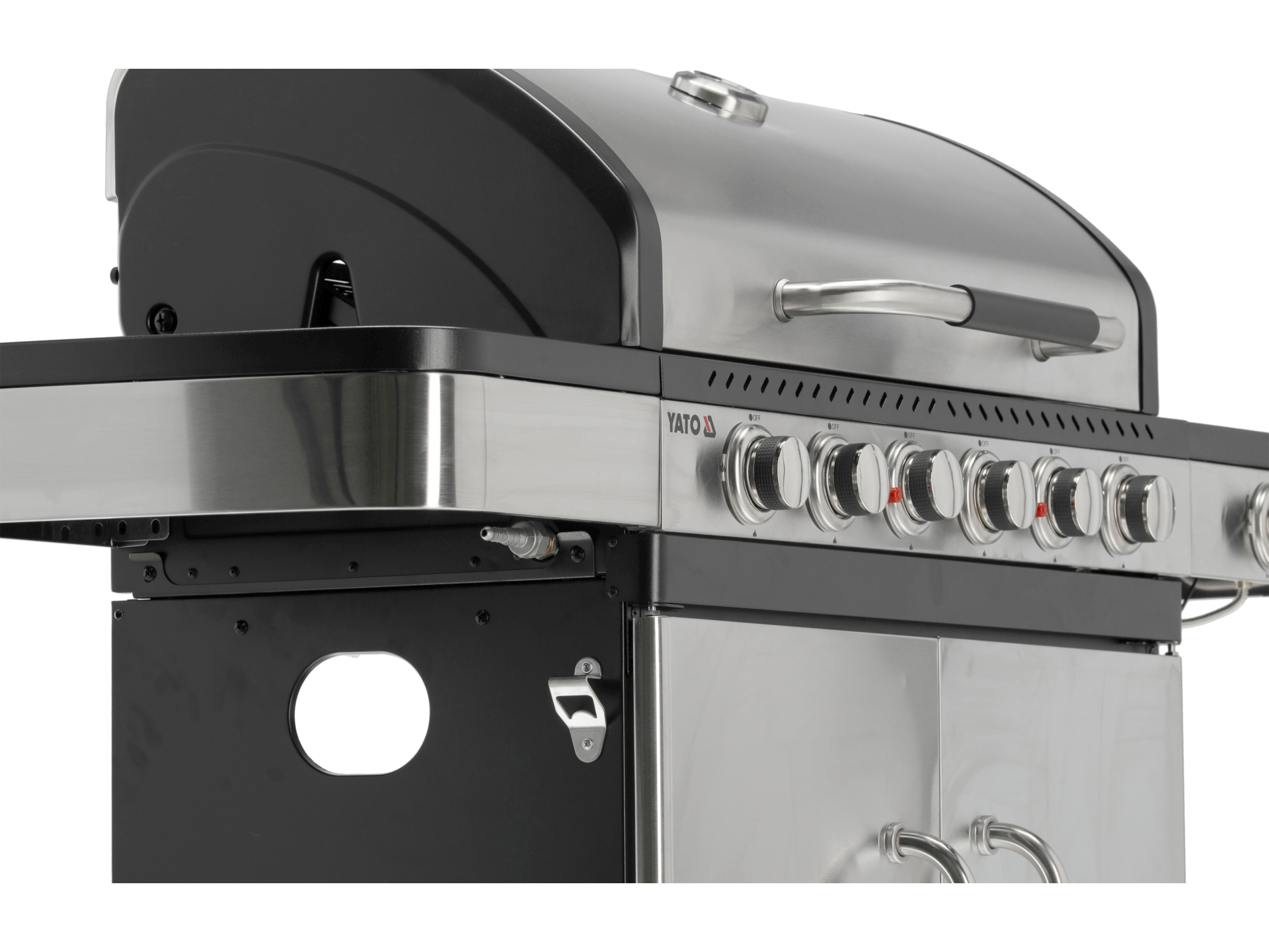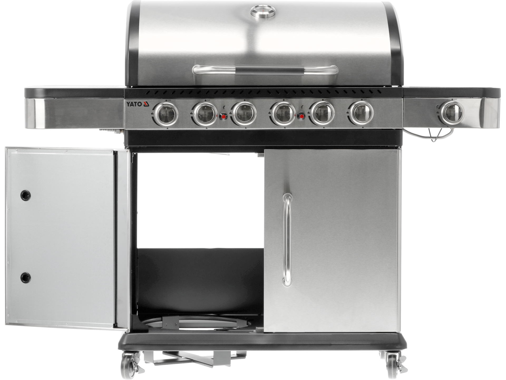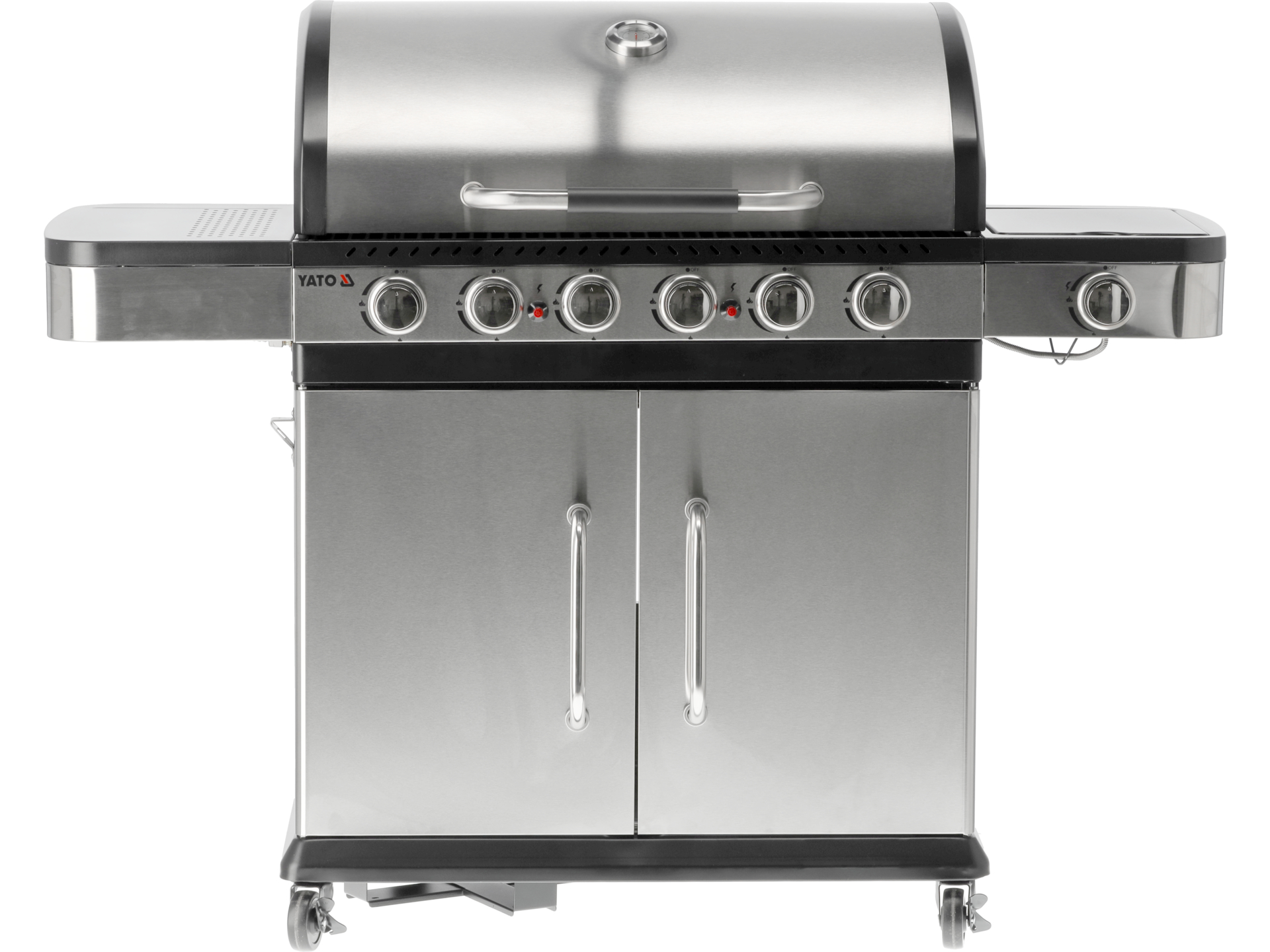 Grill gazowy YATO YG-20004 to przenośne urządzenie grillowe wyposażone w 6 palników głównych oraz dodatkowy palnik boczny o łącznej mocy 20,2 kW. Konstrukcja ze stali nierdzewnej S/S 430 i żeliwnych rusztów zapewnia trwałość i równomierne rozprowadzenie ciepła podczas grillowania.