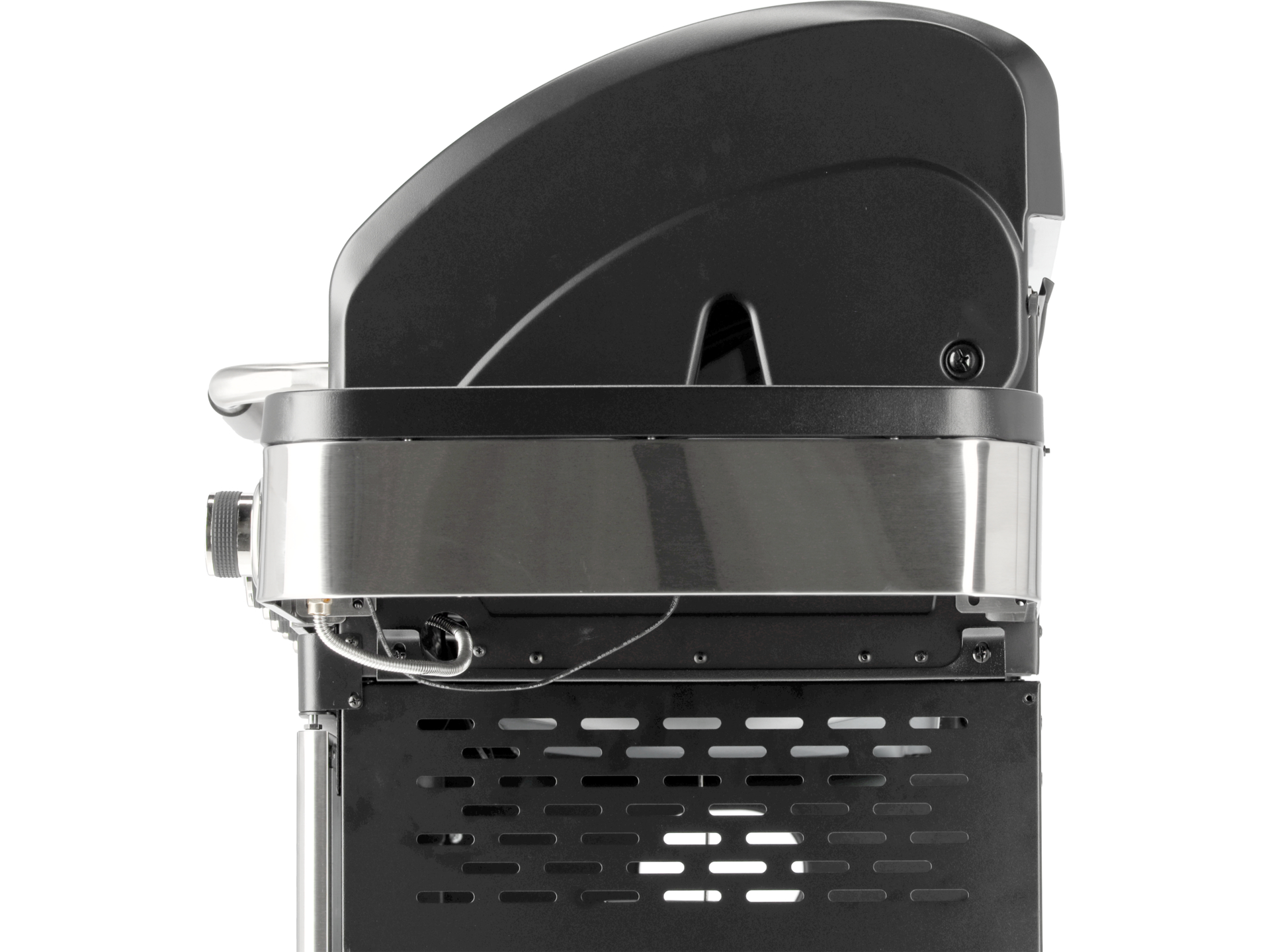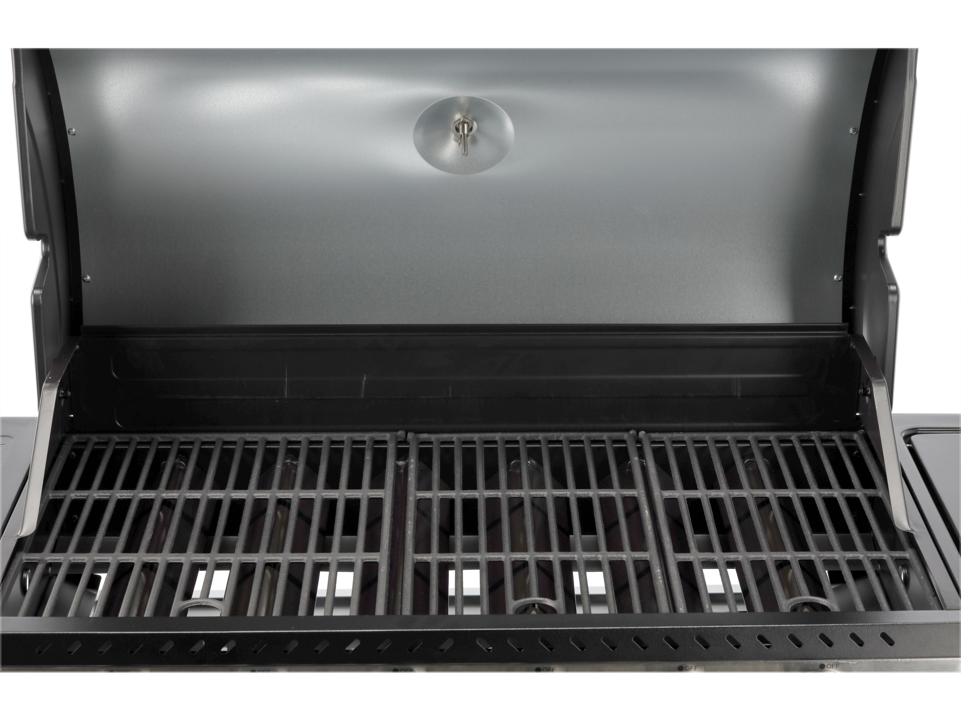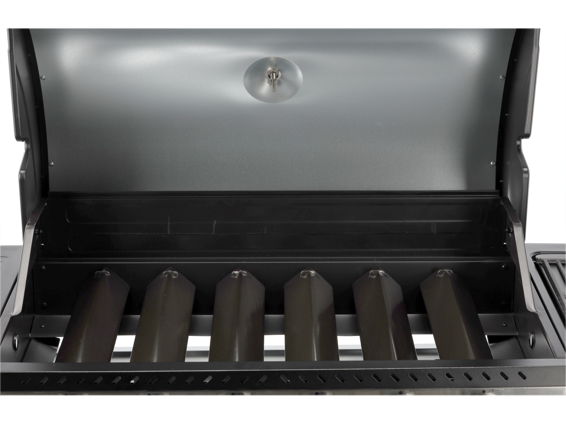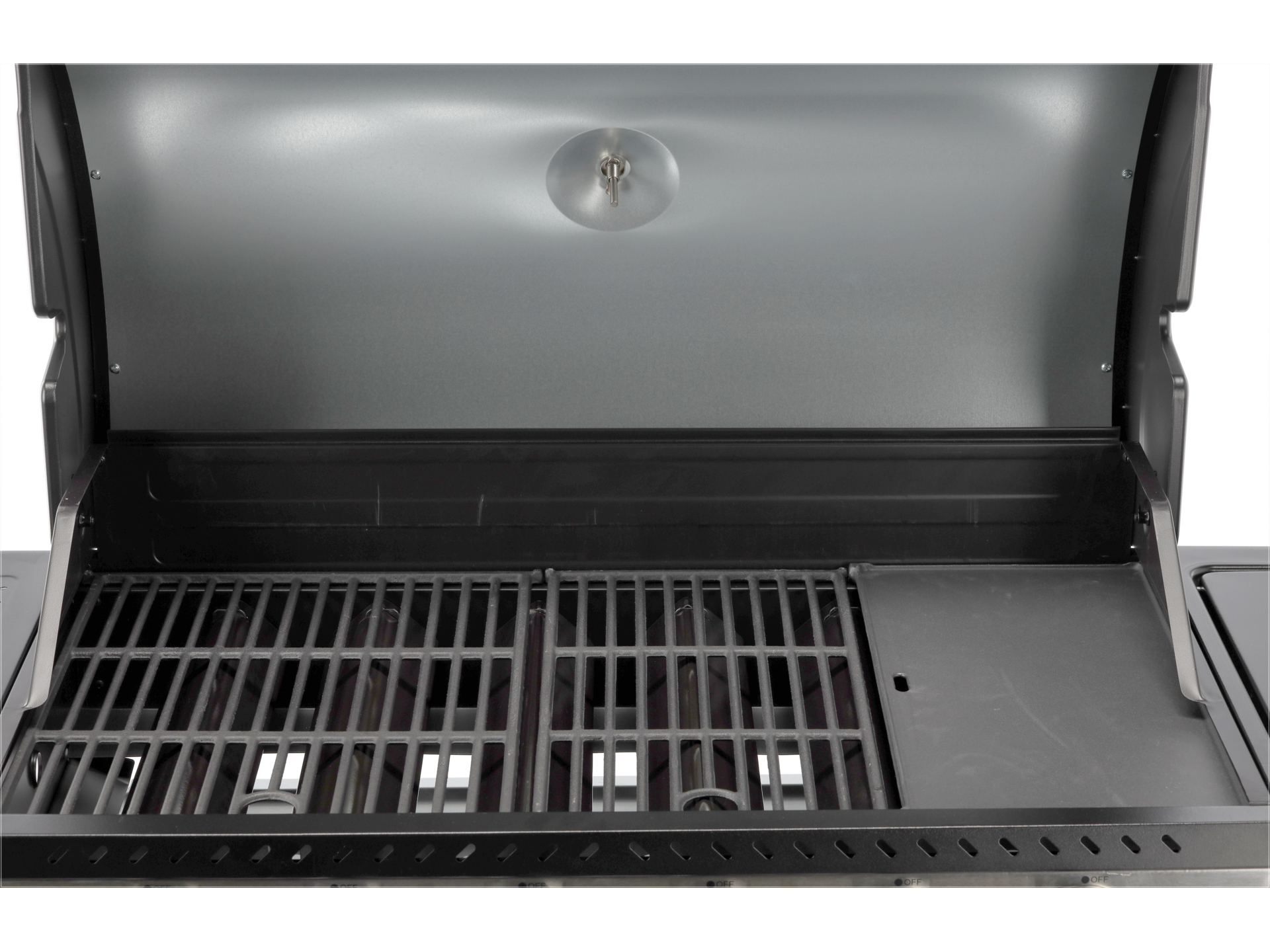 Wbudowany termometr w pokrywie pozwala monitorować temperaturę wewnątrz komory bez otwierania pokrywy. Sześć niezależnych palników umożliwia tworzenie stref o różnej temperaturze – można wyłączyć środkowe palniki i grillować metodą pośrednią, wykorzystując ciepło z palników bocznych.