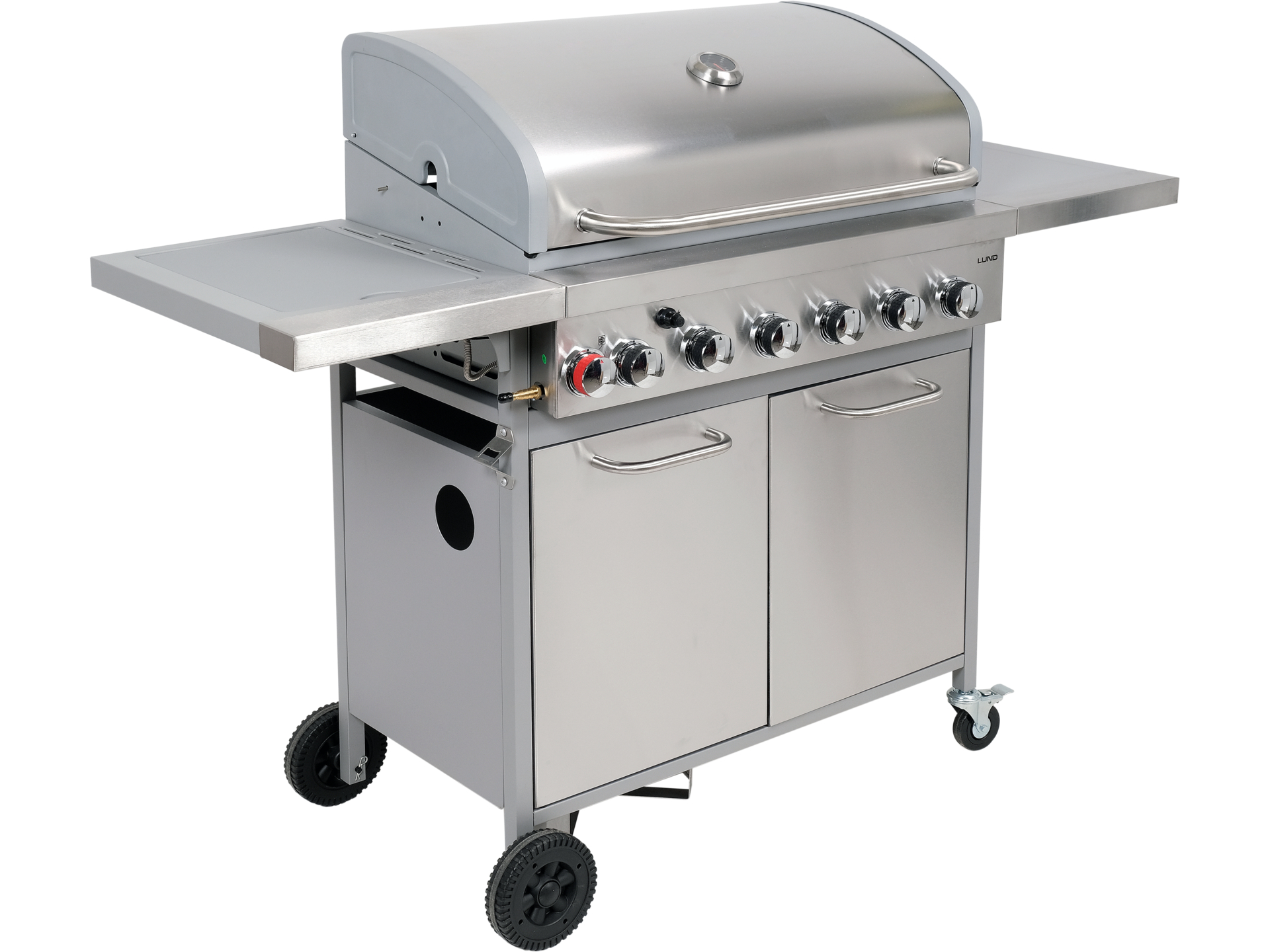 Grill gazowy Lund 99656 wyposażony jest w 6 palników głównych i 1 boczny, co zapewnia łączną moc 18,2 kW. Dzięki temu użytkownik ma pełną kontrolę nad procesem grillowania, a pokrywa z termometrem umożliwia osiągnięcie idealnej temperatury. Iskrownik na panelu przednim, wyprofilowane osłony palnika oraz możliwość dokupienia pokrowca to dodatkowe atuty tego modelu.