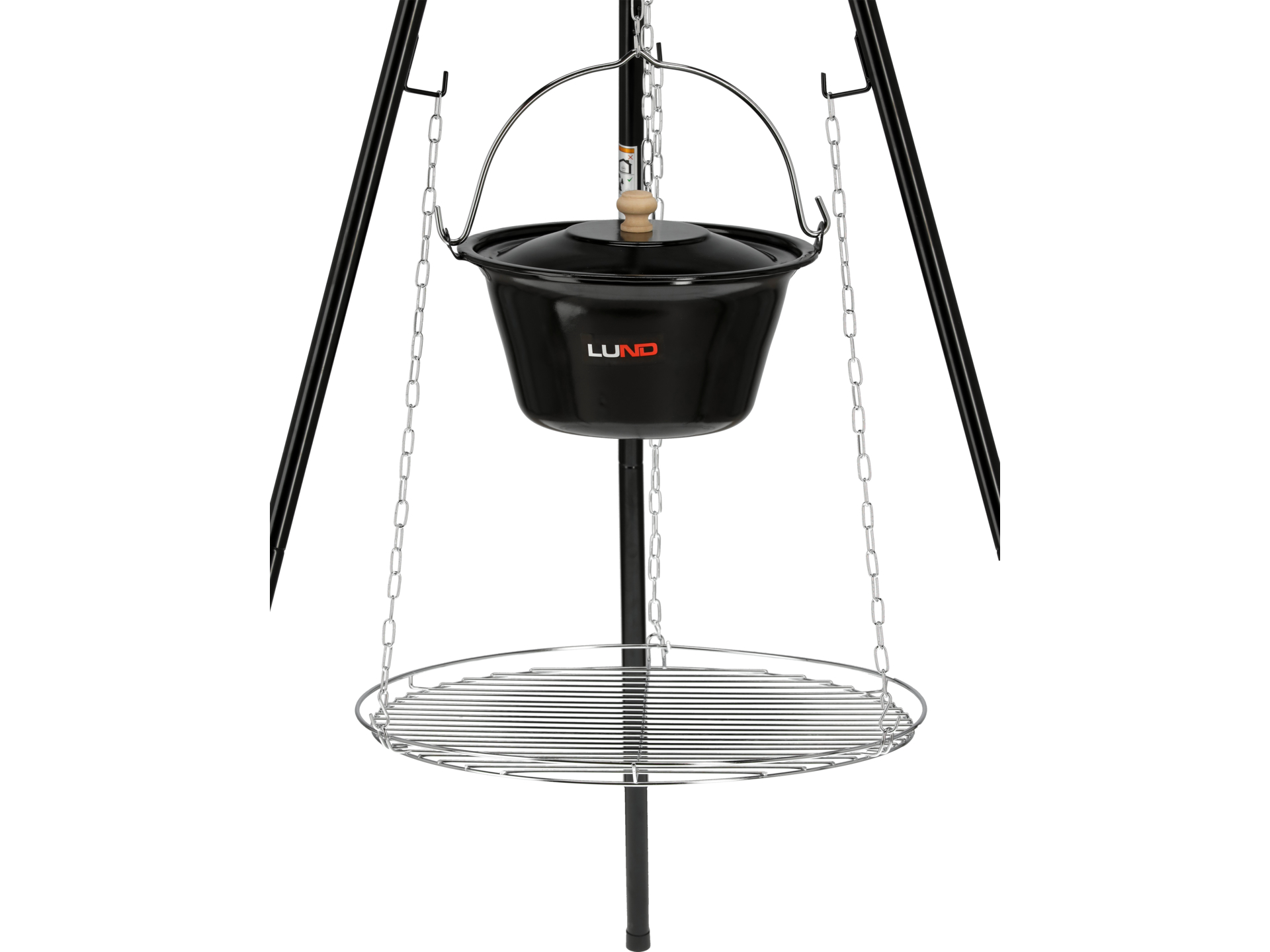 Przenośne stanowisko grillowo-kuchenne z regulowanym trójnogiem, łączące funkcję grilla węglowego z możliwością gotowania w pojemnym kociołku emaliowanym. Konstrukcja umożliwia jednoczesne lub naprzemienne przygotowywanie potraw metodą grillowania oraz gotowania na otwartym ogniu.