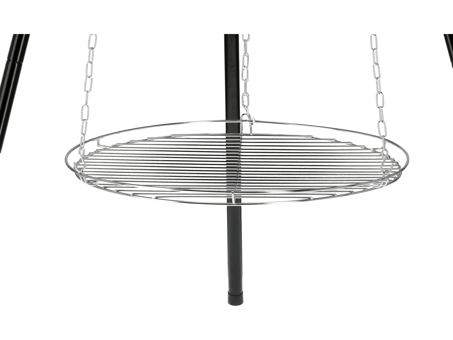 Zakres regulacji 0-97 cm pozwala dostosować odległość rusztu lub misy od źródła ciepła, co umożliwia kontrolę intensywności podgrzewania. Grube łańcuchy stalowe zapewniają bezpieczne zawieszenie nawet przy pełnym obciążeniu. Ruszt można zawiesić bezpośrednio na trójnogu lub na regulowanym łańcuchu w zależności od potrzeb.
