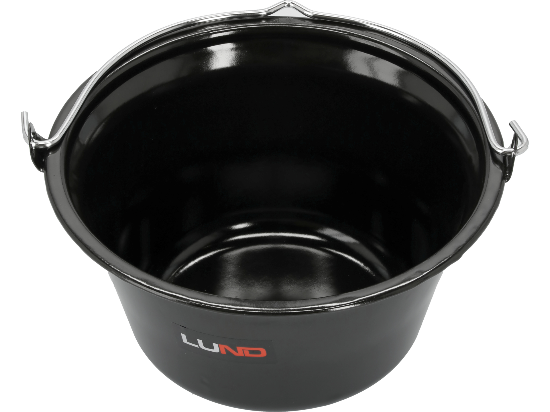 Kociołek o pojemności 6 litrów (średnica 30 cm, głębokość 15,5 cm) wykonany ze stali o grubości 1 mm z powłoką emaliowaną. Emalia zwiększa odporność na wysoką temperaturę i ułatwia utrzymanie czystości. Pokrywa pozwala utrzymać temperaturę podczas gotowania oraz ogranicza straty cieplne. Uchwyt umożliwia zawieszenie na łańcuchu lub przenoszenie naczynia.