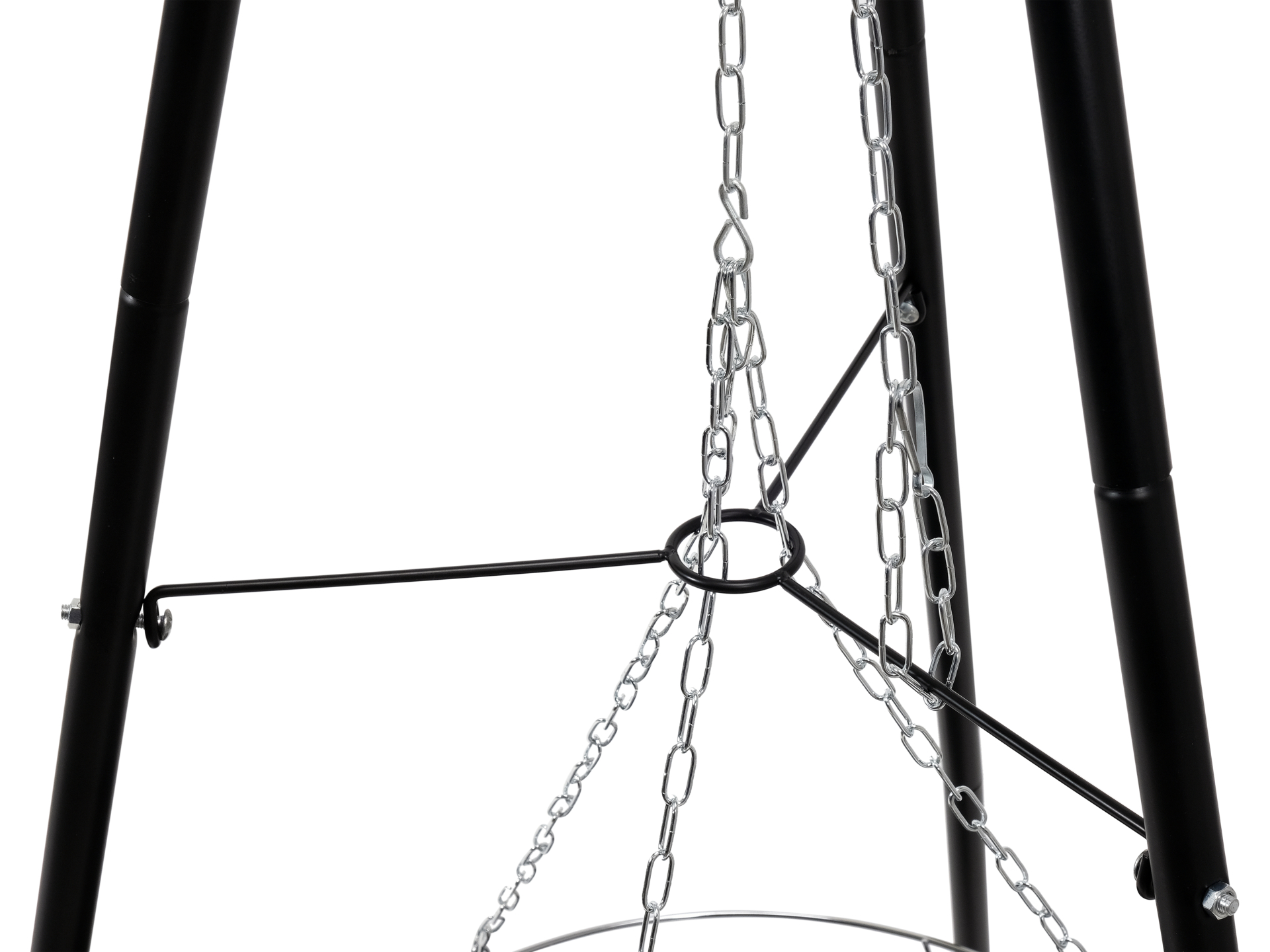 Trzy nogi rozmieszczone pod kątem 120° zapewniają stabilność na trawiastych i kamienistych powierzchniach. Metalowa obręcz łącząca nogi u dołu ogranicza rozchylanie się konstrukcji pod obciążeniem i zwiększa sztywność całego grilla. Masa 5,2 kg umożliwia przenoszenie bez dodatkowych narzędzi.
