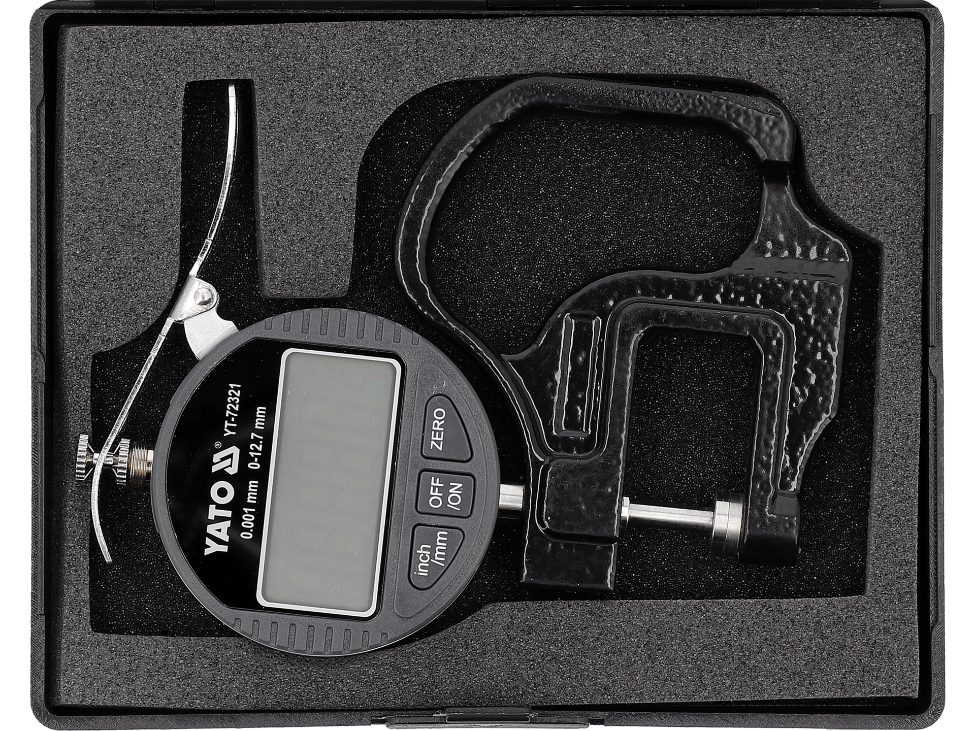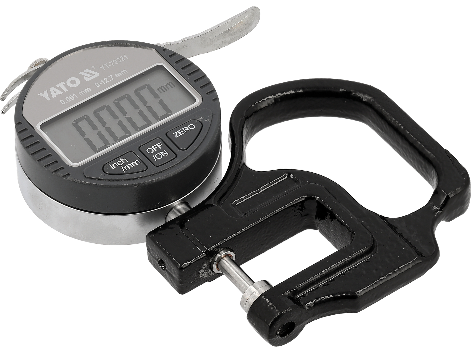 Elektroniczny grubościomierz zegarowy do precyzyjnego pomiaru grubości materiałów w zakresie od 0 do 12,7 mm. Urządzenie zapewnia rozdzielczość 0,001 mm i wyposażone jest w cyfrowy wyświetlacz LCD z możliwością przełączania między jednostkami metrycznymi a calowymi.
