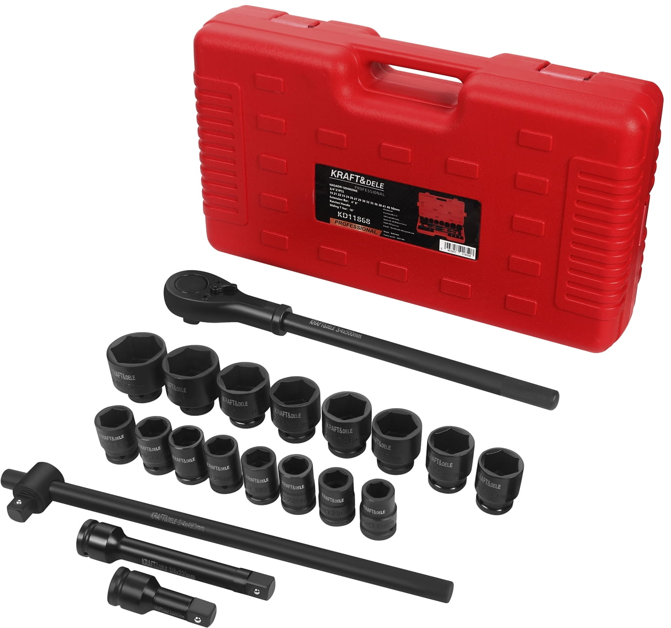 KD11868 to kompletny zestaw narzędzi udarowych z gniazdem 3/4", przeznaczony do warsztatów samochodowych, serwisów ciężkich pojazdów oraz zastosowań przemysłowych. Obejmuje 16 nasadek udarowych ze stali Cr-Mo w zakresie 19–50 mm, grzechotkę, dwie przedłużki oraz przedłużkę przesuwną typu T — wszystko w walizce transportowej.