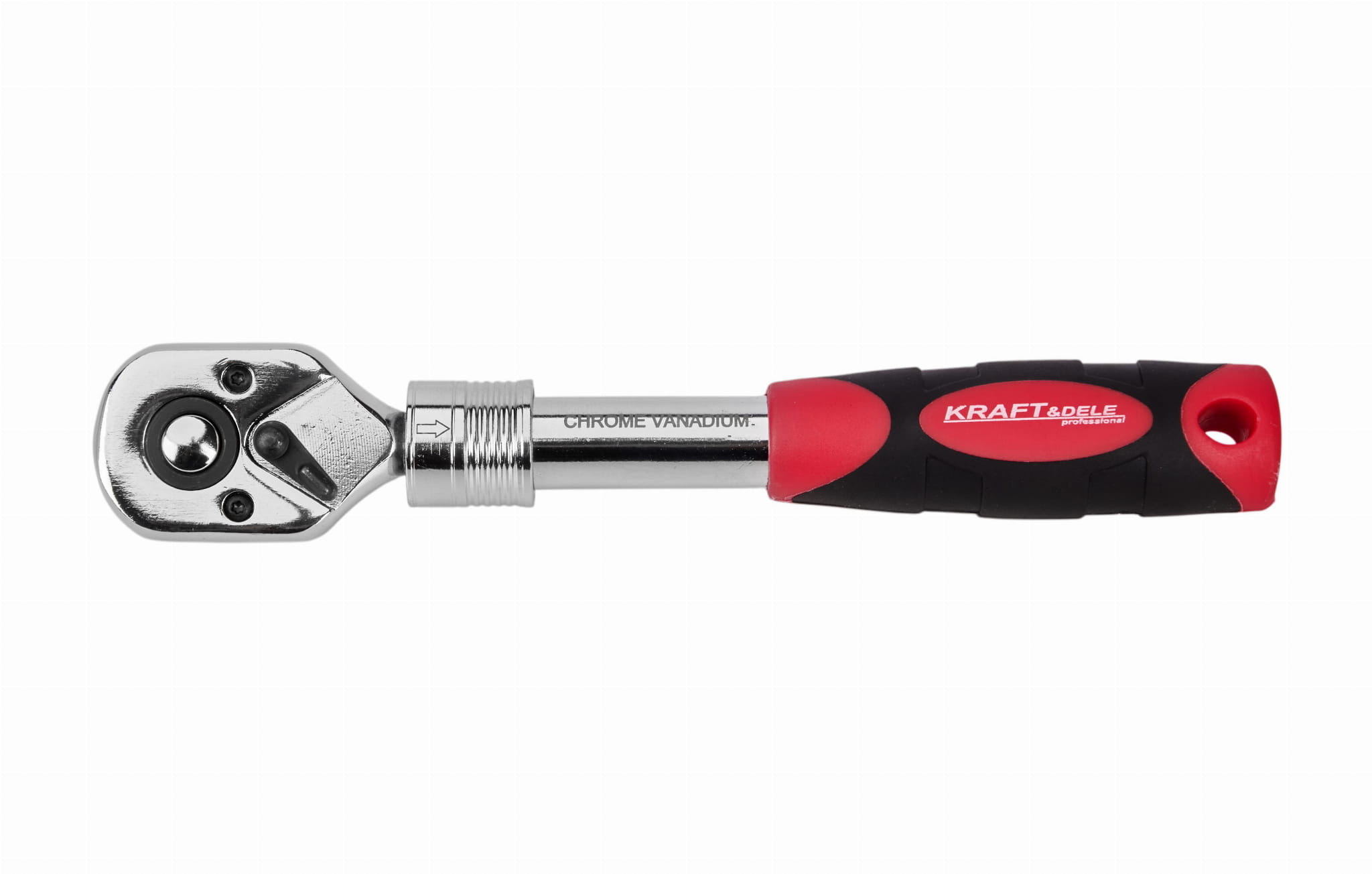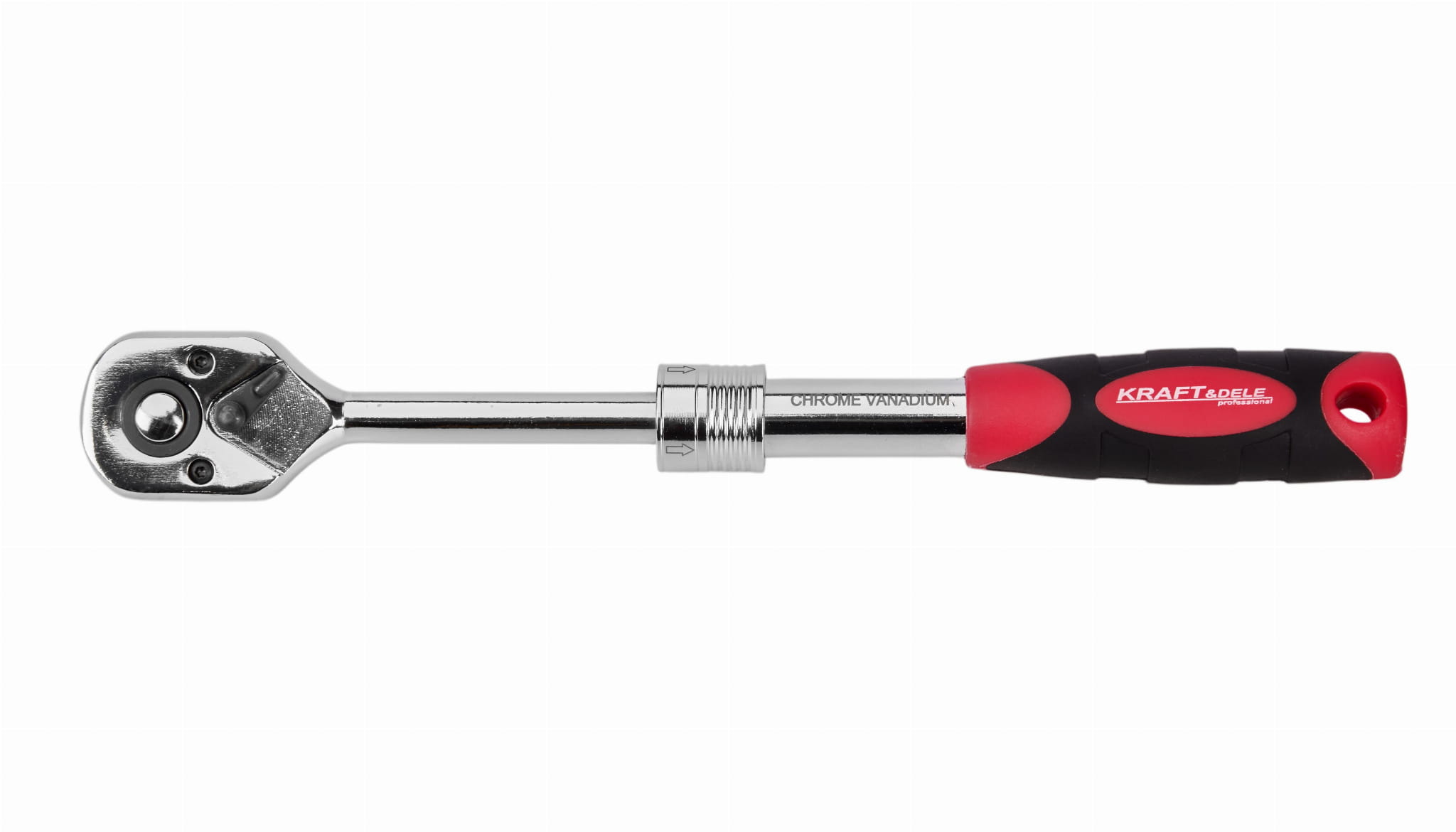 Grzechotka z regulowaną długością trzonka (teleskopowa) w napędzie 1/4", wykonana ze stali chromowo-wanadowej. Mechanizm zapadkowy z 72 zębami umożliwia pracę w obu kierunkach obrotu — właściwy dla dokręcania i odkręcania łączników.