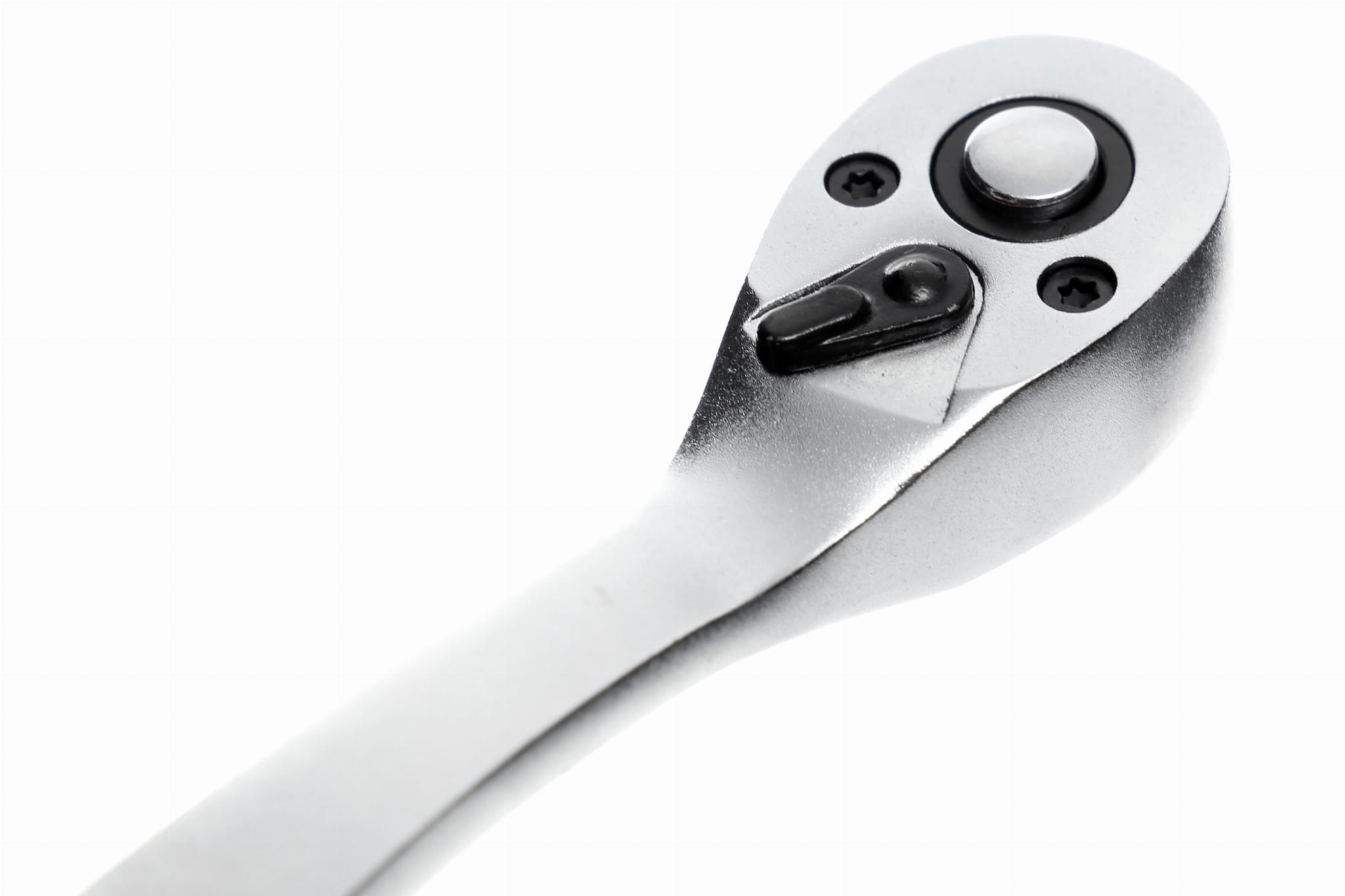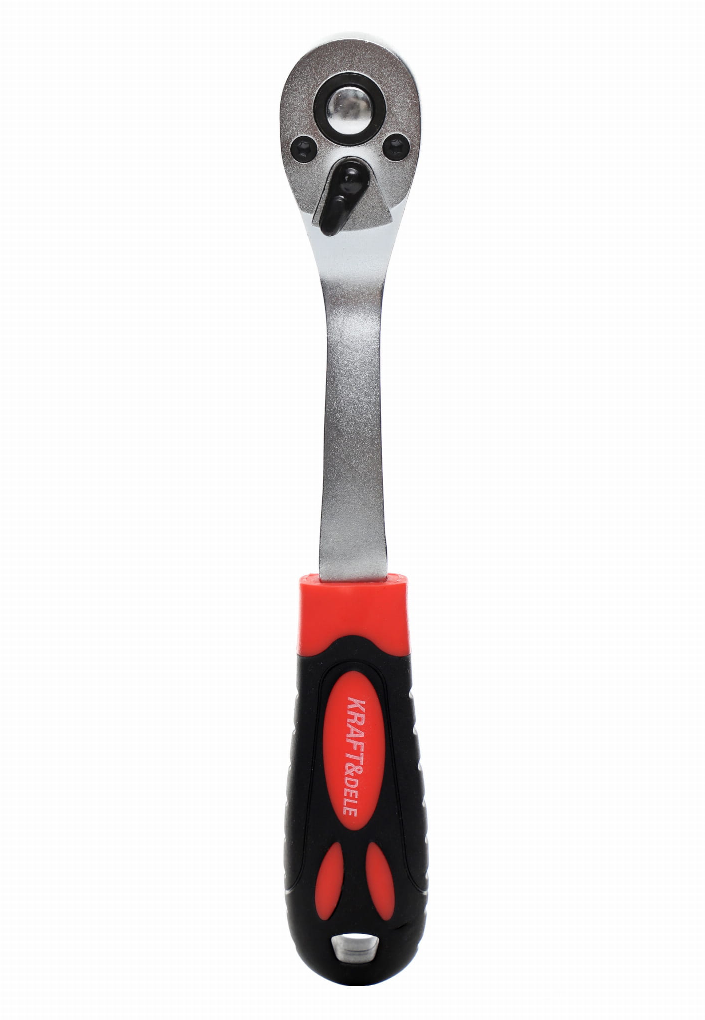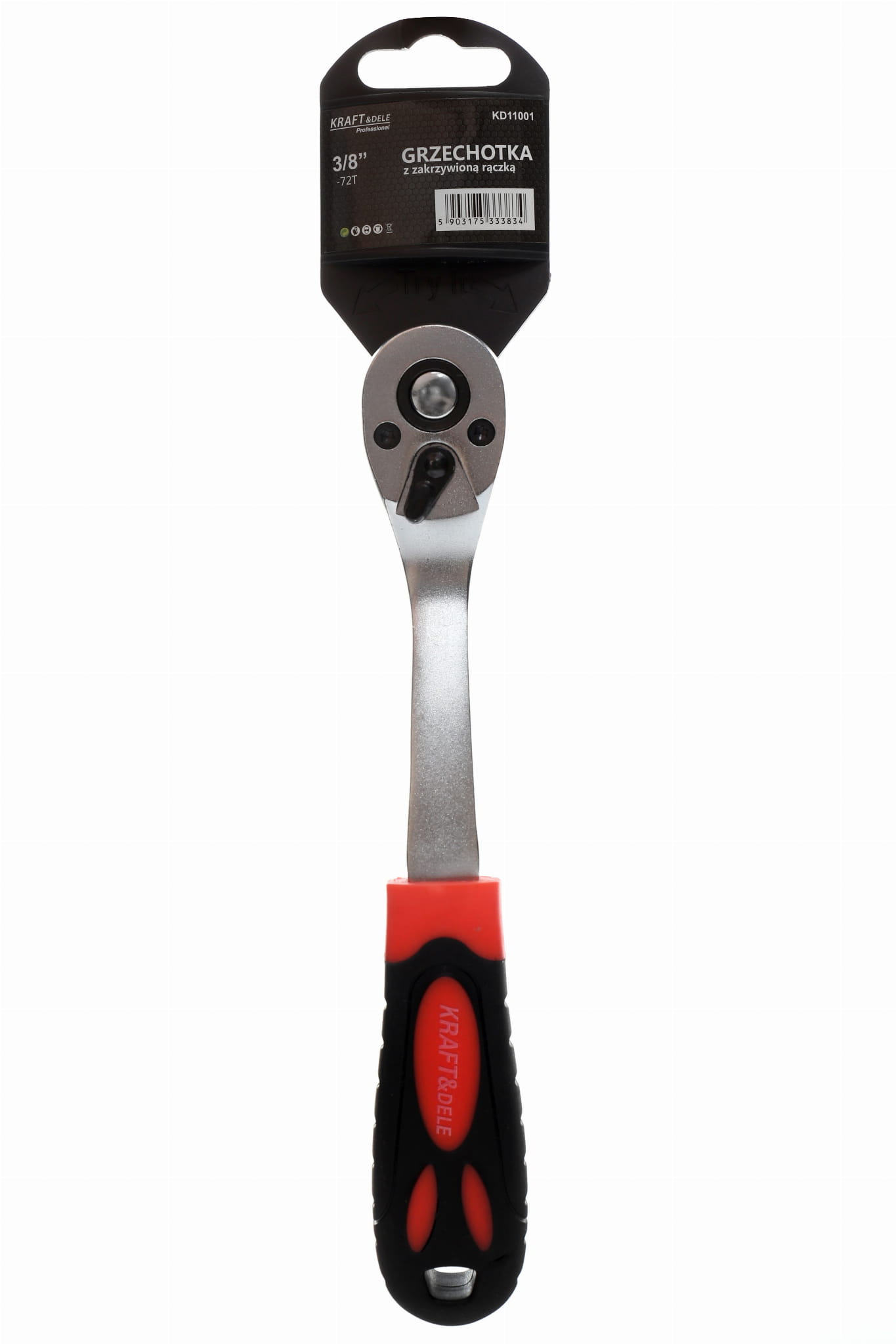 Grzechotka KD11001 to narzędzie ręczne z napędem 3/8" przeznaczone do dokręcania i odkręcania elementów złącznych za pomocą nasadek. Zakrzywiony kształt rączki umożliwia pracę w miejscach o ograniczonym dostępie, gdzie prostoliniowe narzędzia nie mogą być skutecznie użyte. Korpus wykonano ze stali chromowo-wanadowej, co zapewnia odporność na odkształcenia podczas przenoszenia momentu obrotowego.