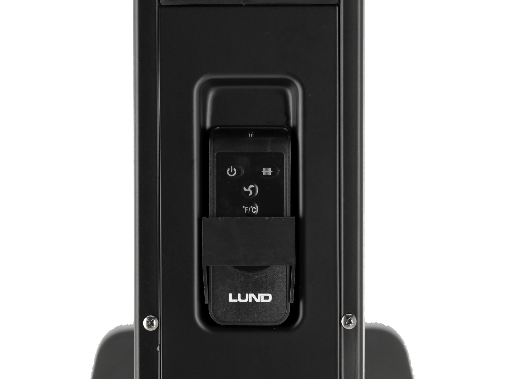 Wyświetlacz LCD prezentuje bieżące ustawienia i temperaturę pomieszczenia. Pilot zdalnego sterowania umożliwia zmianę parametrów pracy bez konieczności fizycznego dostępu do urządzenia. Urządzenie posiada kieszeń do przechowywania pilota.
