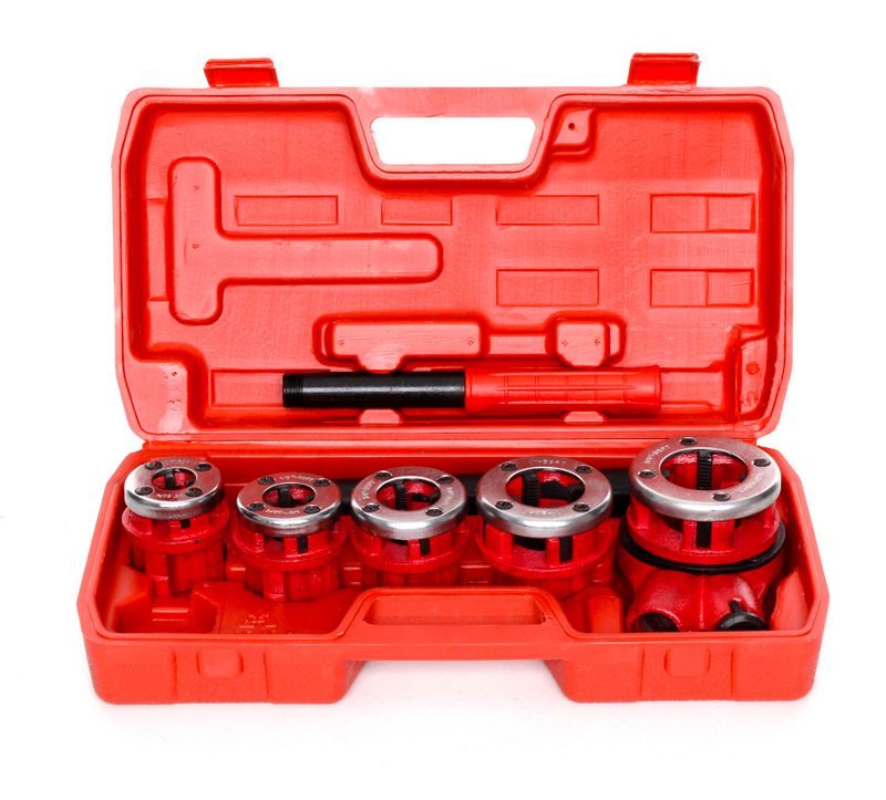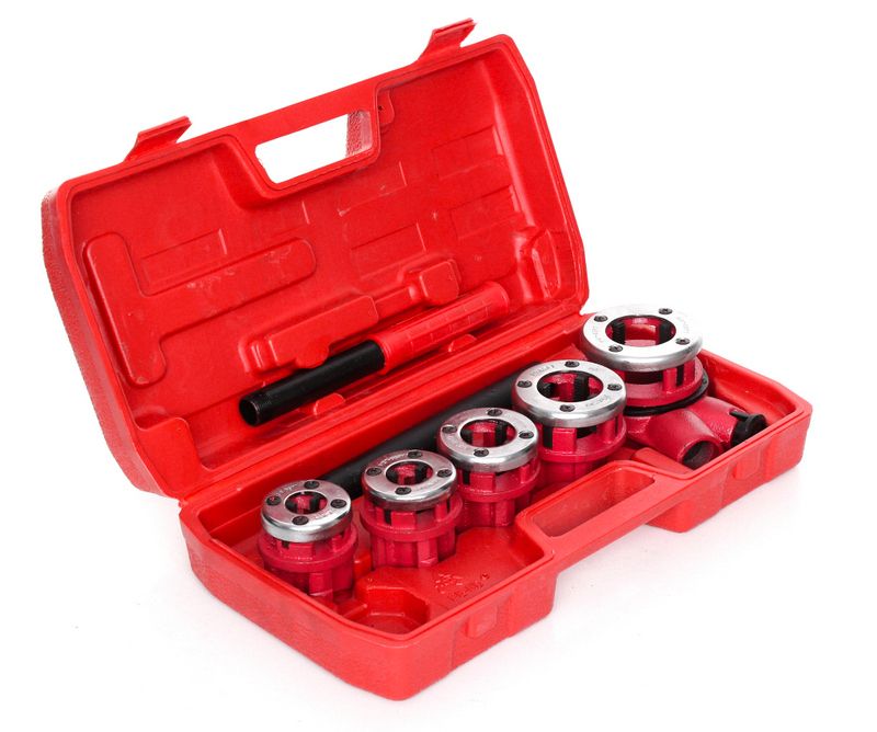 KD331 to ręczny zestaw do gwintowania rur w zakresie 3/8"–1+1/4", przeznaczony do prac hydraulicznych i warsztatowych. Zestaw zawiera pięć narzynkami calowych, grzechotkę z rączką i przedłużką oraz walizkę transportową. Żeliwna konstrukcja głowicy zapewnia stabilność gwintowania przy powtarzalnych pracach montażowych.
