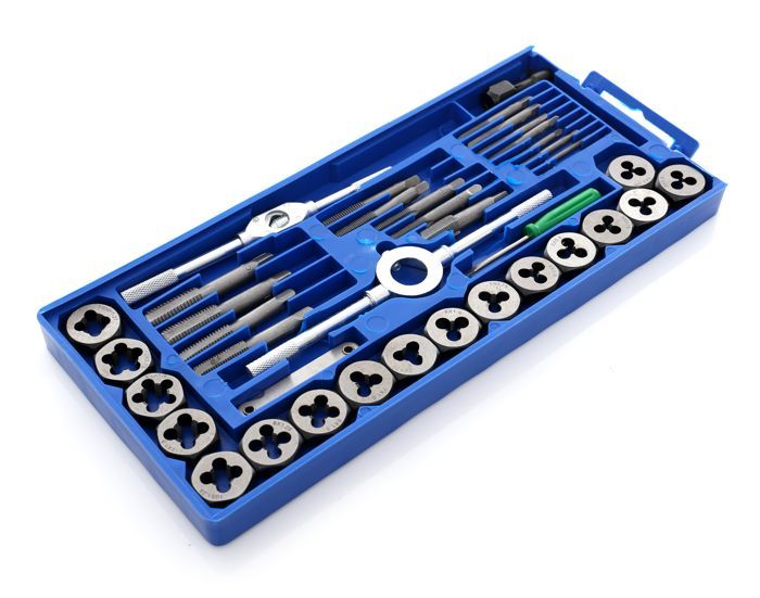 KD10289 to kompletny zestaw narzędzi do nacinania gwintów wewnętrznych (gwintowniki) i zewnętrznych (narzynki) w zakresie od M3 do M12 oraz w standardzie NPT. Zestaw obejmuje 40 elementów wykonanych ze stali narzędziowej, wraz z uchwytami i pokrętkami, przechowywanych w sztywnym etui z tworzywa sztucznego.