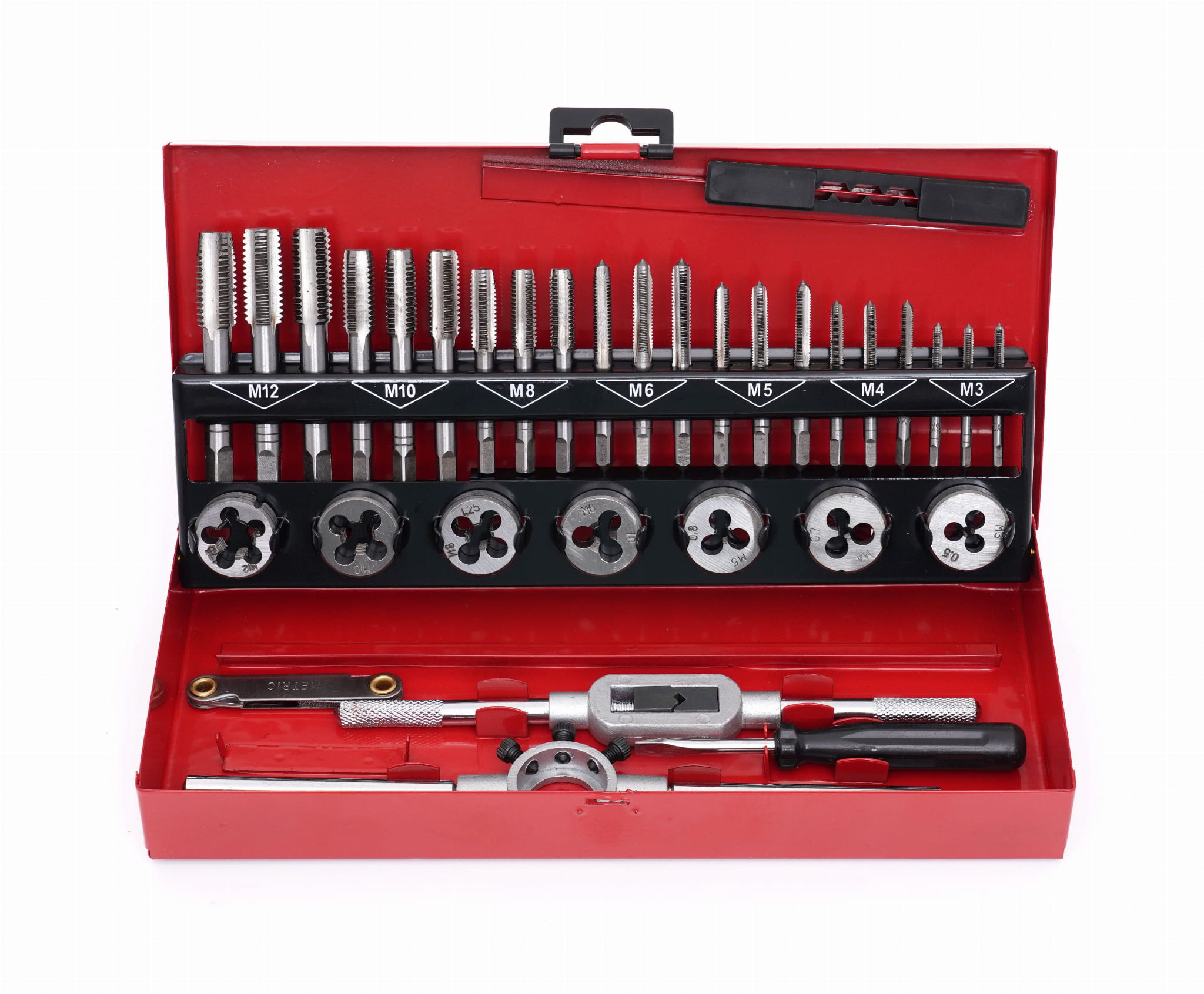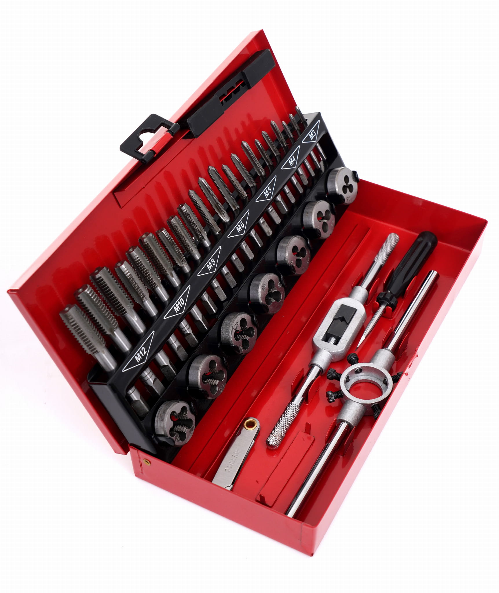 KD10090 to komplet 14 narzędzi do ręcznego nacinania gwintów metrycznych w zakresie M3–M12. Zestaw obejmuje zarówno gwintowniki do gwintów wewnętrznych (otworów), jak i narzynki do gwintów zewnętrznych (prętów, śrub, gwintowanych końcówek). Narzędzia wykonano ze stali hartowanej, co zapewnia trwałość krawędzi skrawających przy pracy w metalu, tworzywie i drewnie.