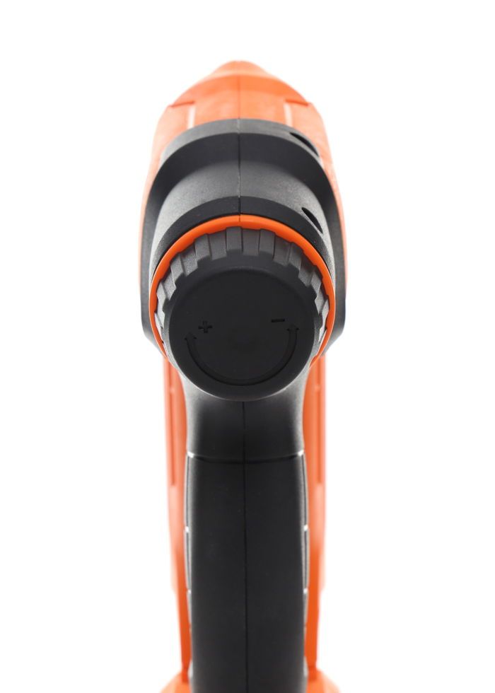 Rękojeść pokryta materiałem antypoślizgowym poprawia pewność trzymania narzędzia, szczególnie przy pracy w rękawicach roboczych. Wskaźnik pracy informuje o aktualnym stanie urządzenia — sygnalizuje gotowość do wbicia lub ewentualną nieprawidłowość w działaniu.